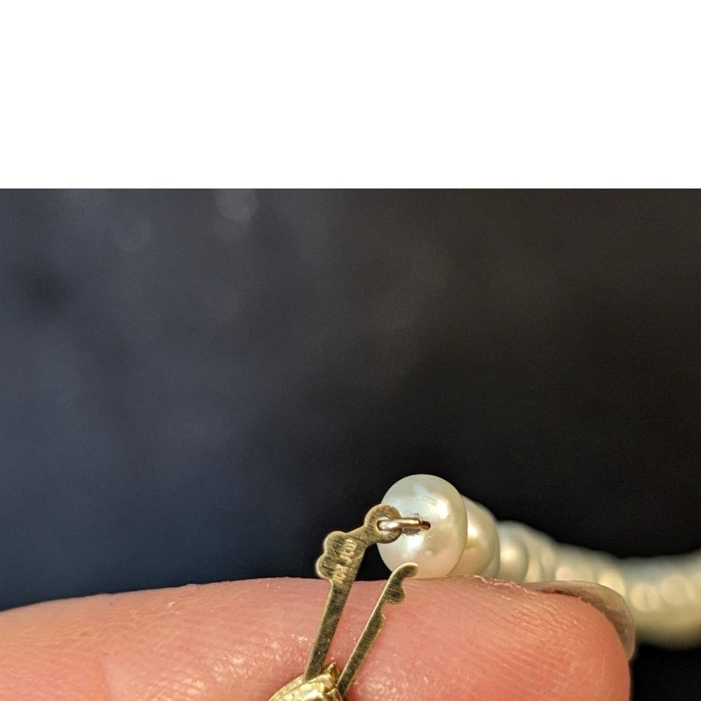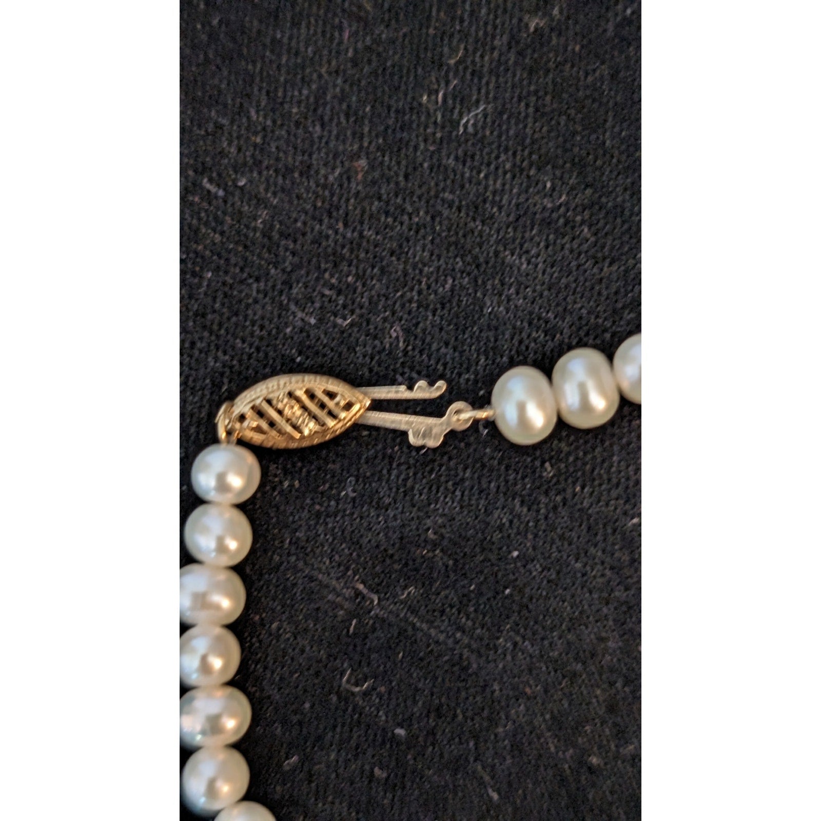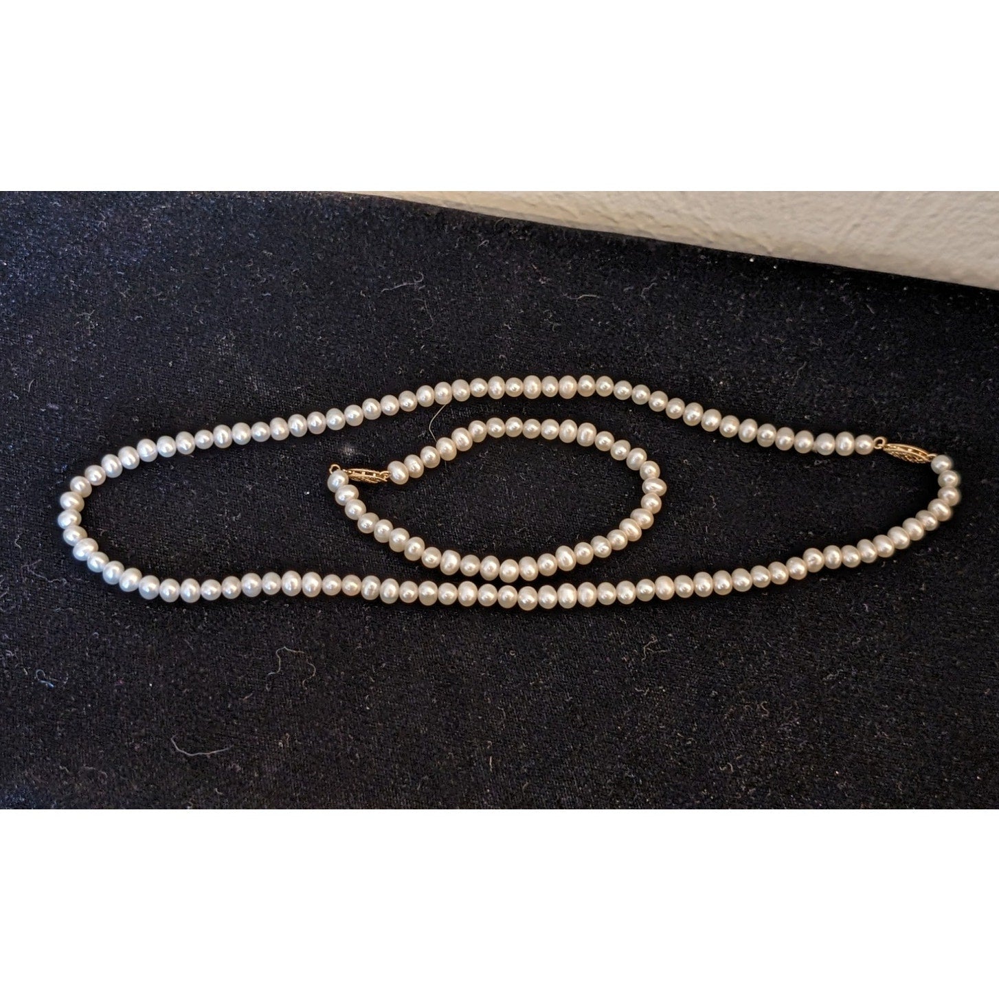 10K Yellow Gold JCM Jacmel Mauritius Freshwater Pearl Necklace and Bracelet Set. The necklace measures 18", and the bracelet 8". These feel wonderful. There is one place on the string that looks like glue or something. I don't want to pick it off for fear of breaking the string. It is right after the third pearl from the clasp. Otherwise, this pearl set is in excellent condition. This would make a wonderful gift for a young lady's first set of pearls. These pearls vary in shape but average 5mm in size.