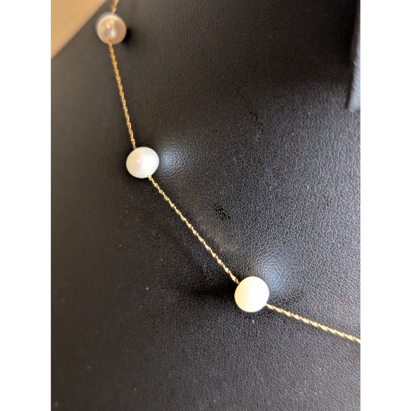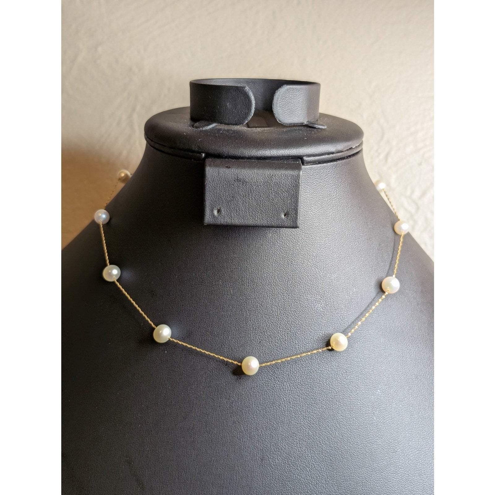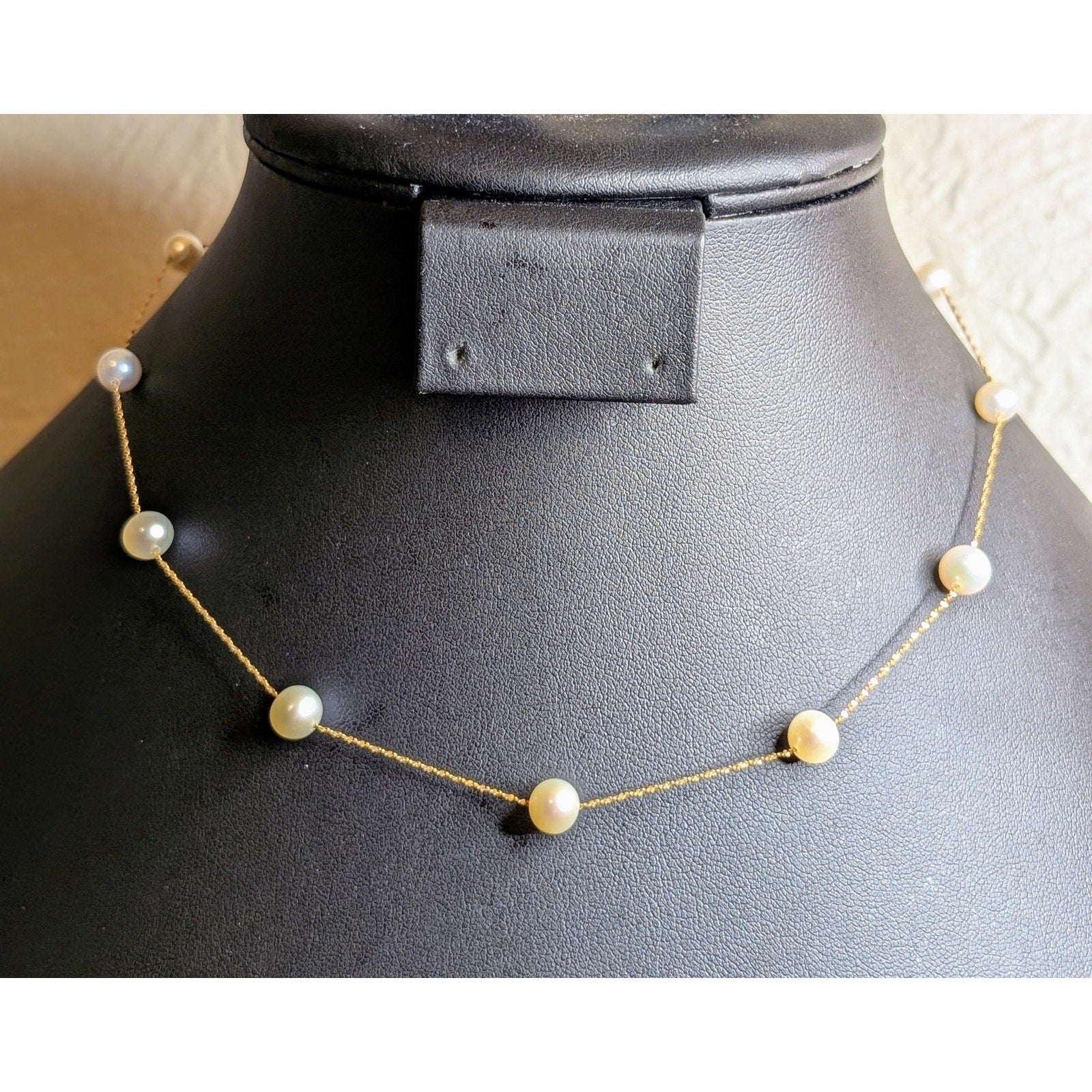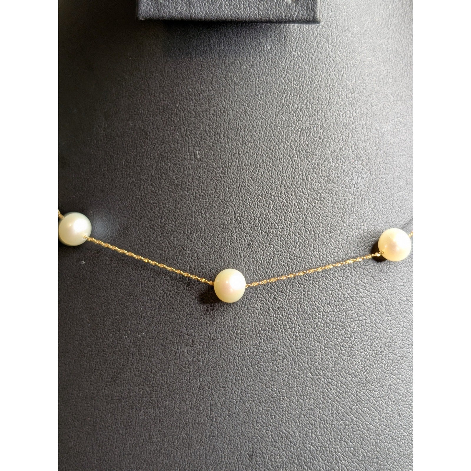 14 K Italy Yellow Gold Genuine Pearl 16" Necklace. Pre-owned, this necklace is in excellent condition. Dainty, feminine, classic, timeless. Spring ring clasp. Eleven pearls.