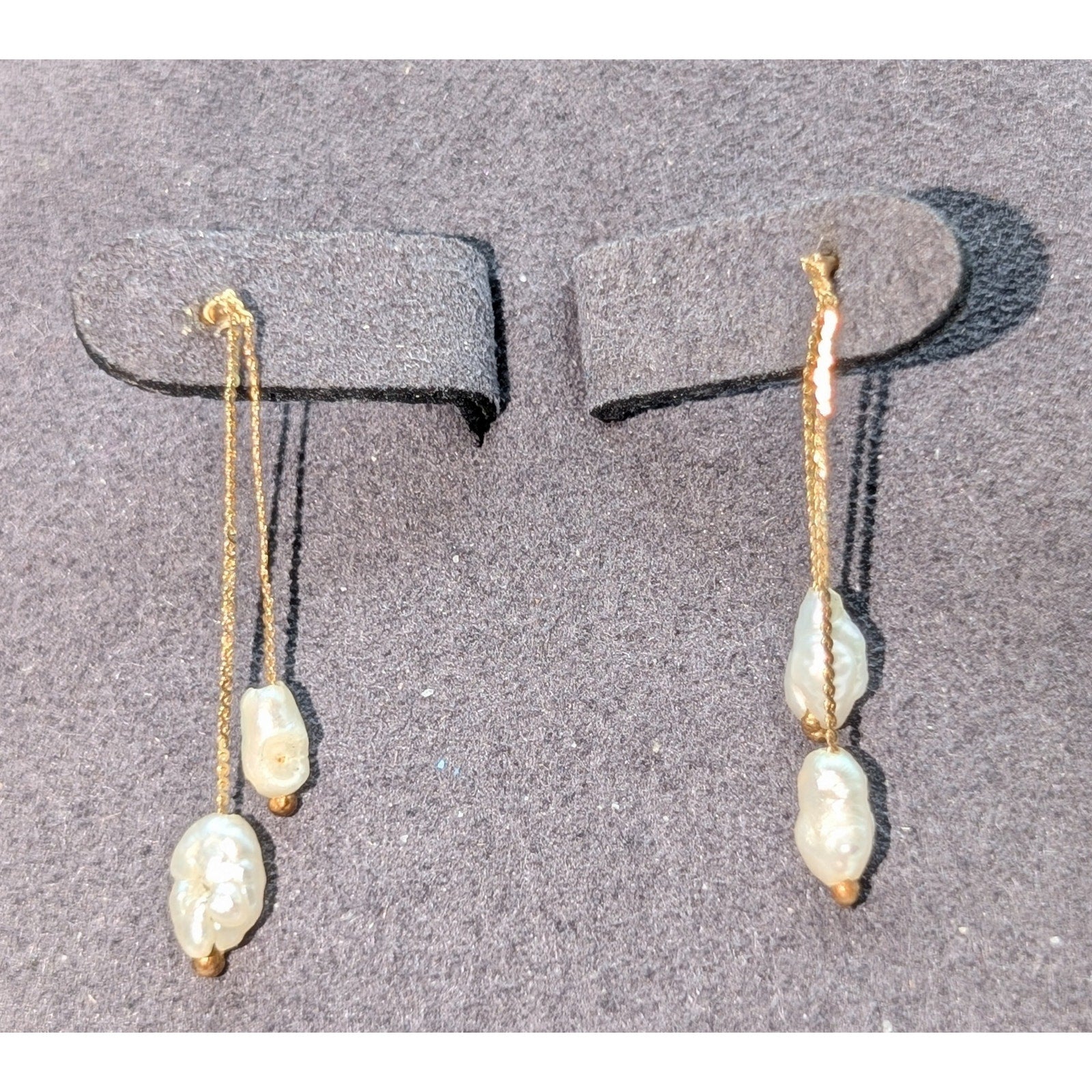 14k Yellow Gold Freshwater Pearl Dangle Serpentine Link Chain Pierced Earrings. Dainty yet timeless elegance. Pre-owned, these earrings are in excellent condition.