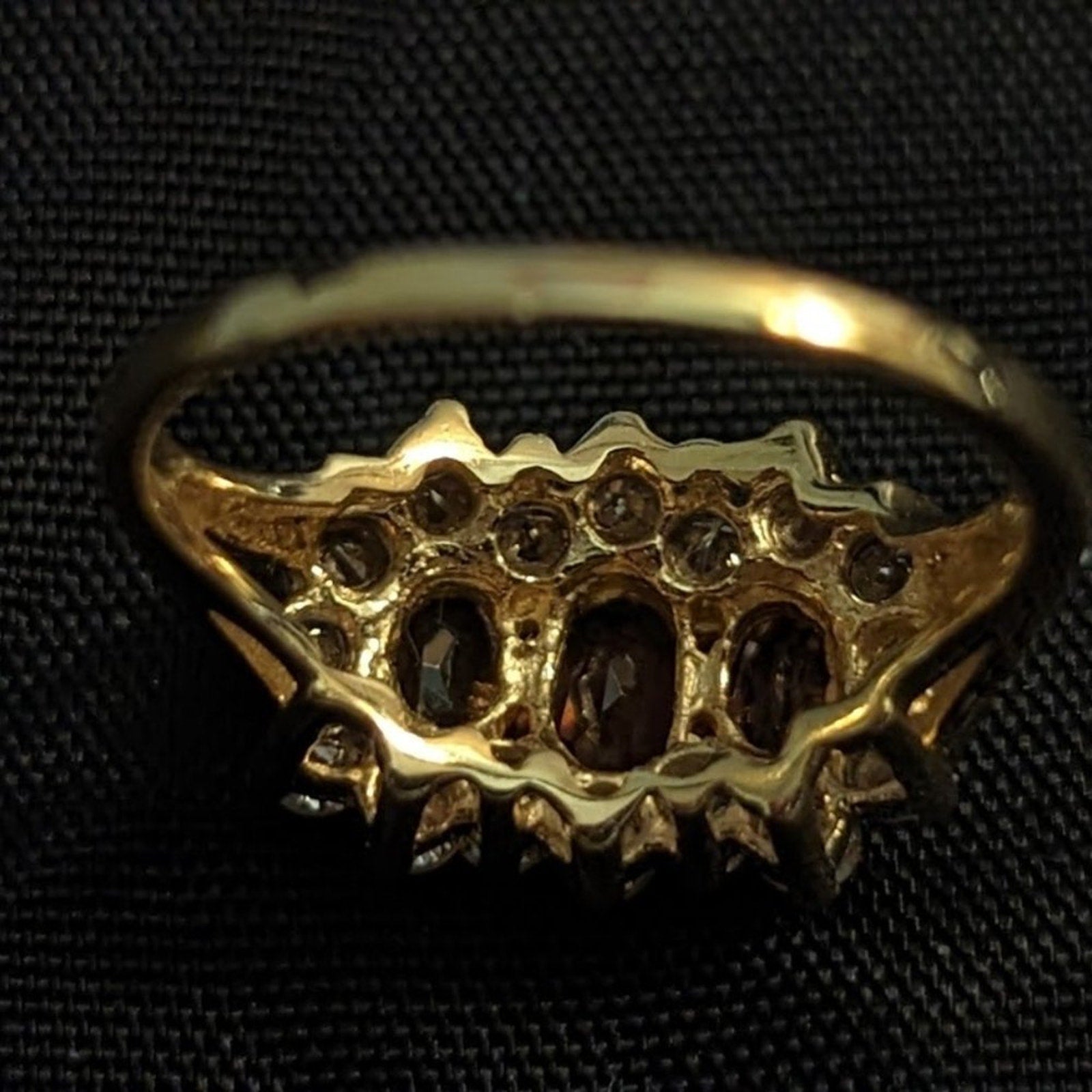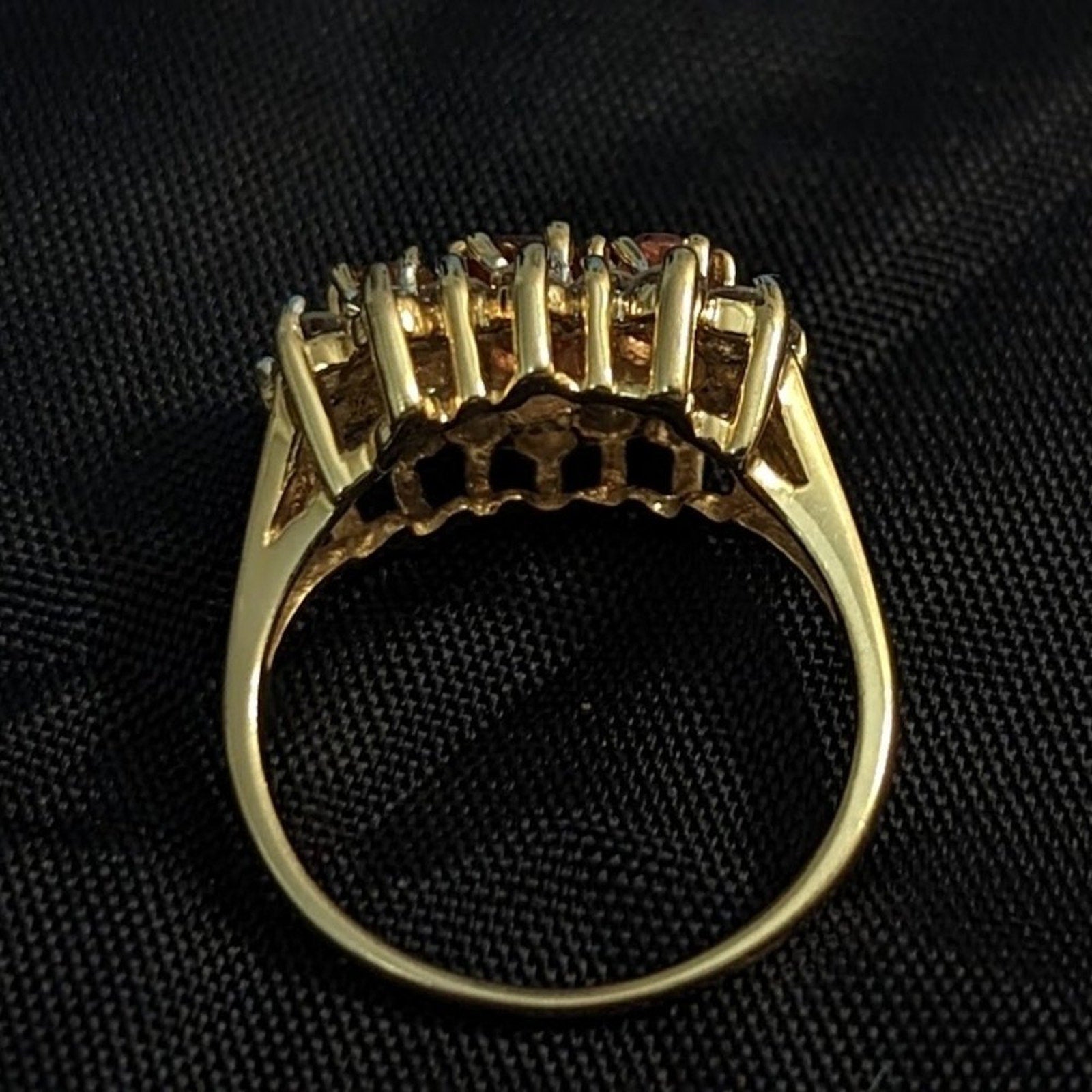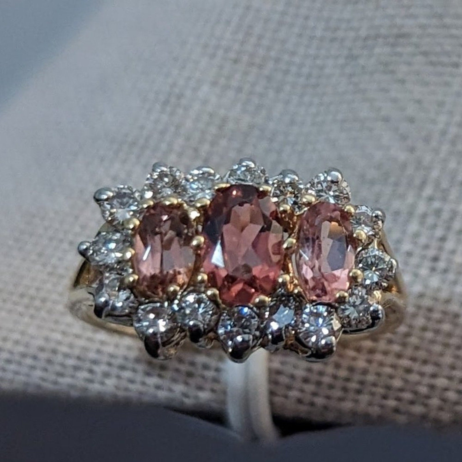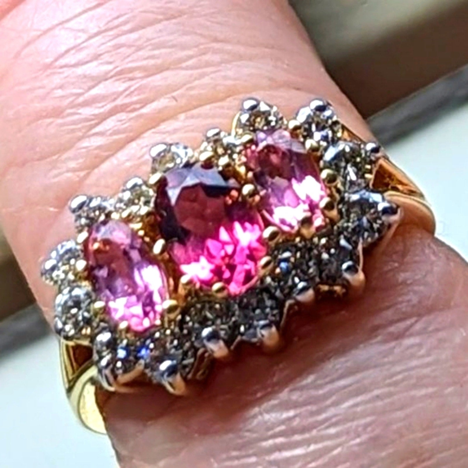 18k Pink Tourmaline and Diamond Ring Size 5.25-5.50 (See photo). I couldn't capture the beauty of this dazzling ring by my phone camera. It is absolutely stunning! It is blinding when the light hits it. 18k gold marked 'JCR 18k', the highest quality tourmalines and 16 diamonds are set in this beautiful setting. It is comfortable. Because it doesn't sit too high, it can be worn every day without fear of catching on clothing, etc. It is used but in excellent condition. You will love it! Measures approximately 5 1/4.