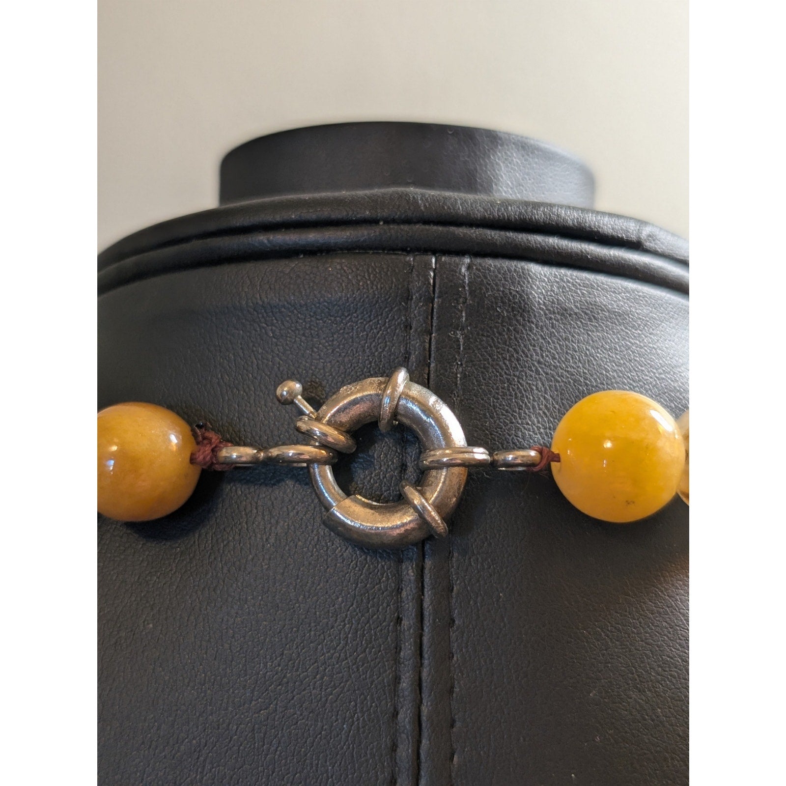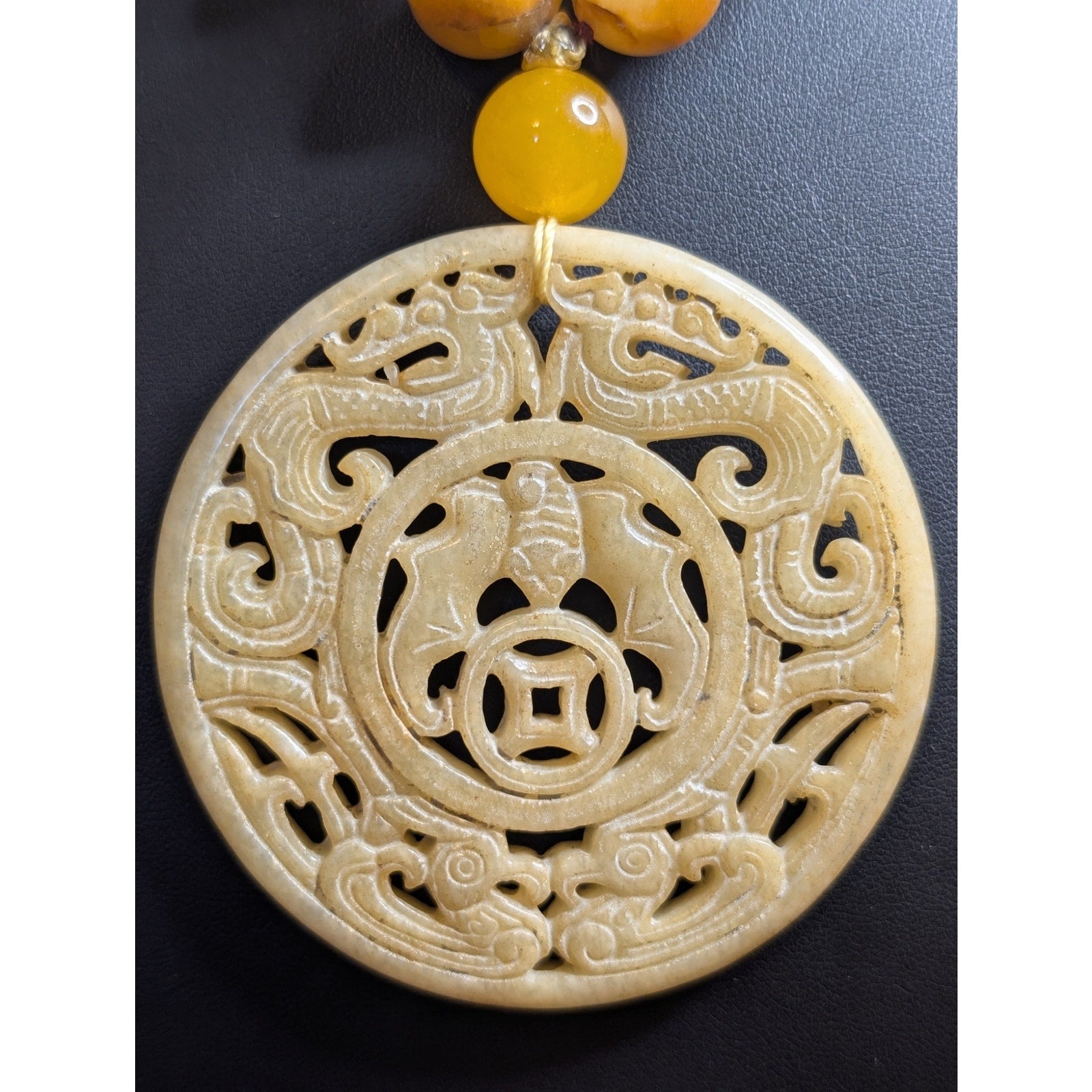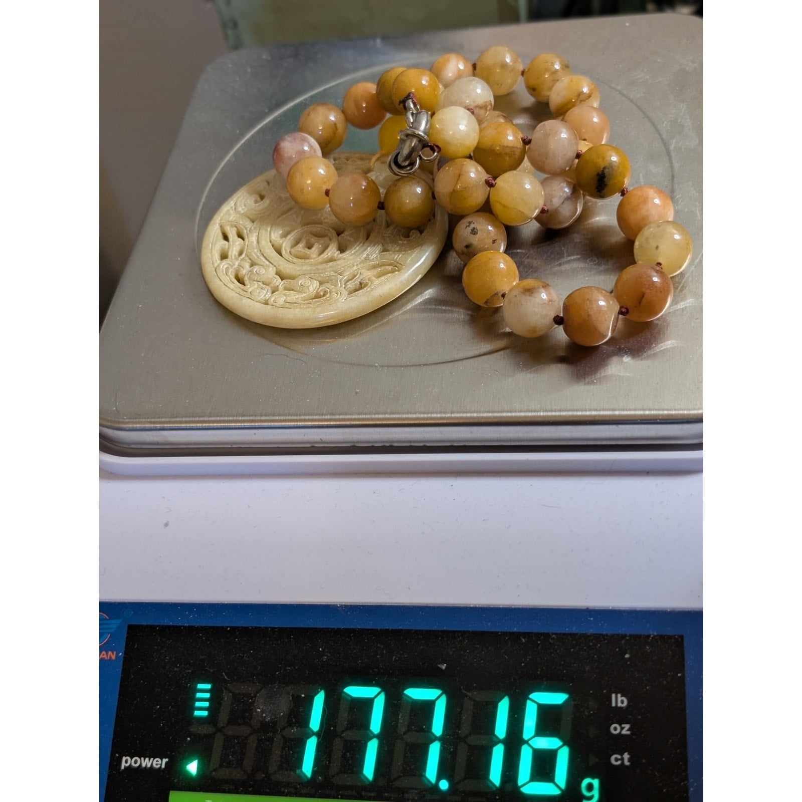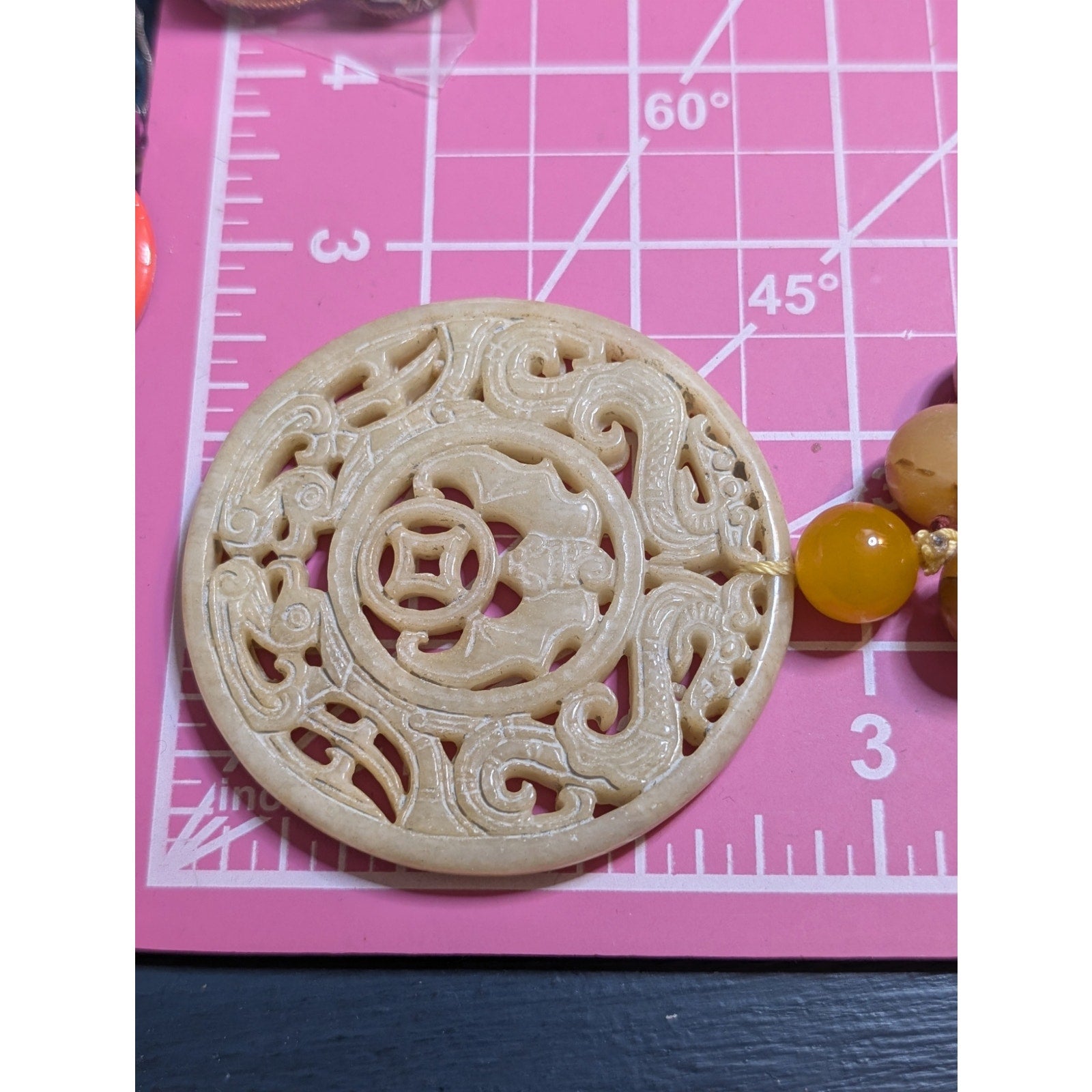 24" Asian Motif Silver Tone Carved Jade & 14mm Peach Aventurine Necklace 177.1g. Pre-owned, this necklace is in excellent condition. Heavy, substantial. Dragons on carved jade medallion. Will be shipped in a hard necklace case.