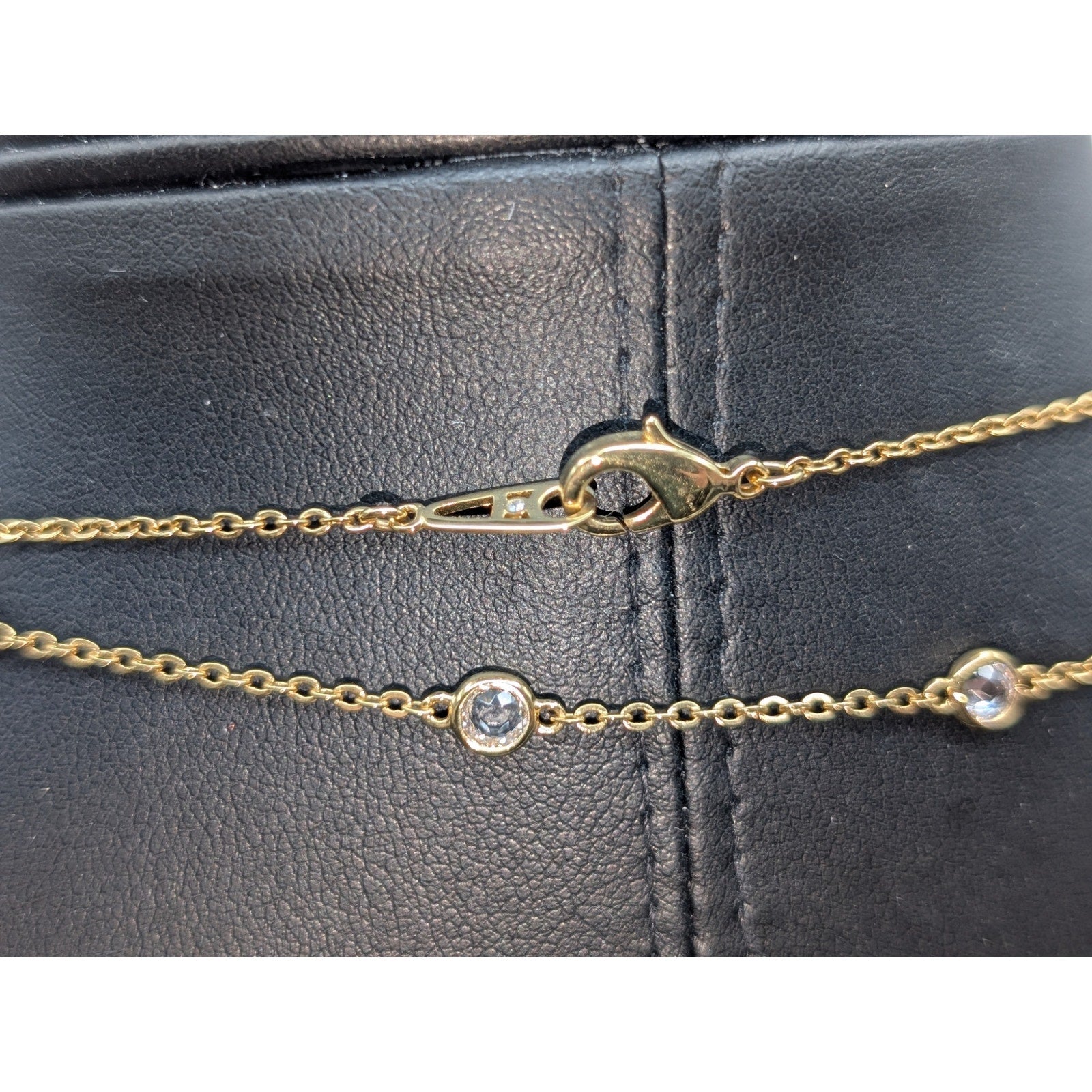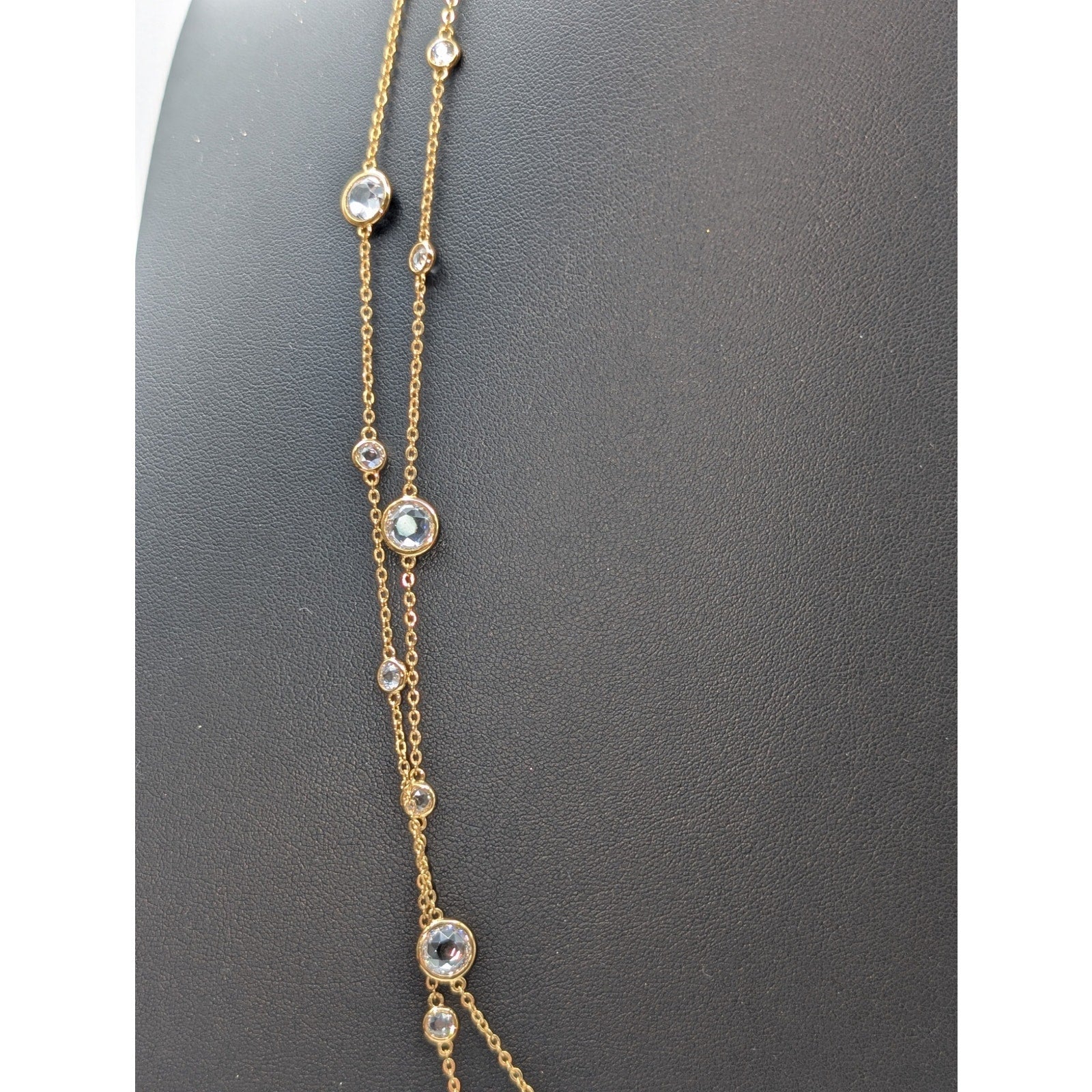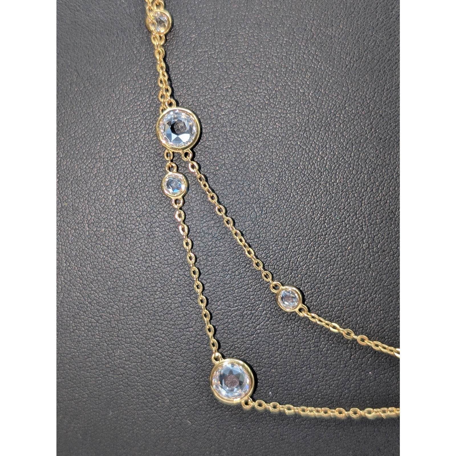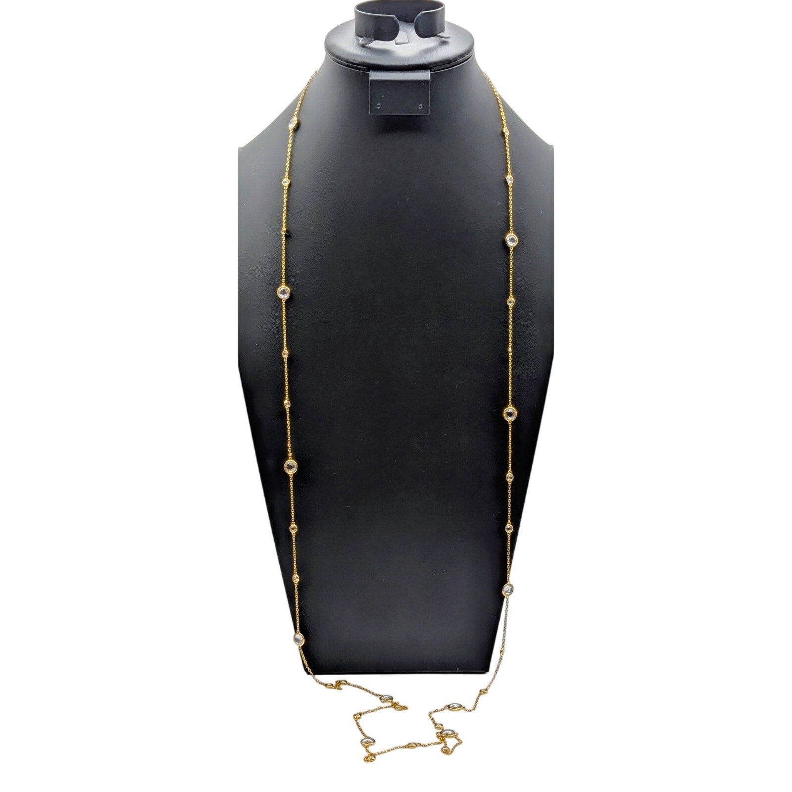 52" Long Gold Tone Bezel Set Small & Larger Glass Crystal Station Chain Necklace. Pre-owned, this necklace is in excellent condition.