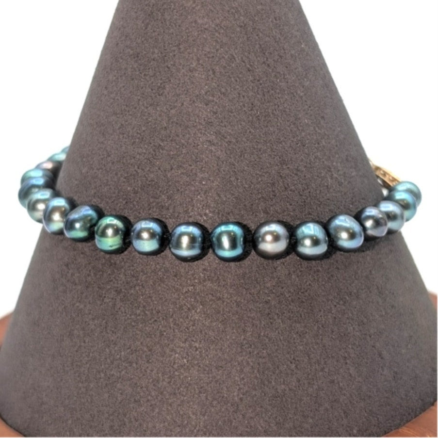 5mm Blue Green Hand Knotted Pearl Bracelet 14K Gold Filigree Slide In Hook Clasp. Pre-owned, this bracelet is in excellent condition.