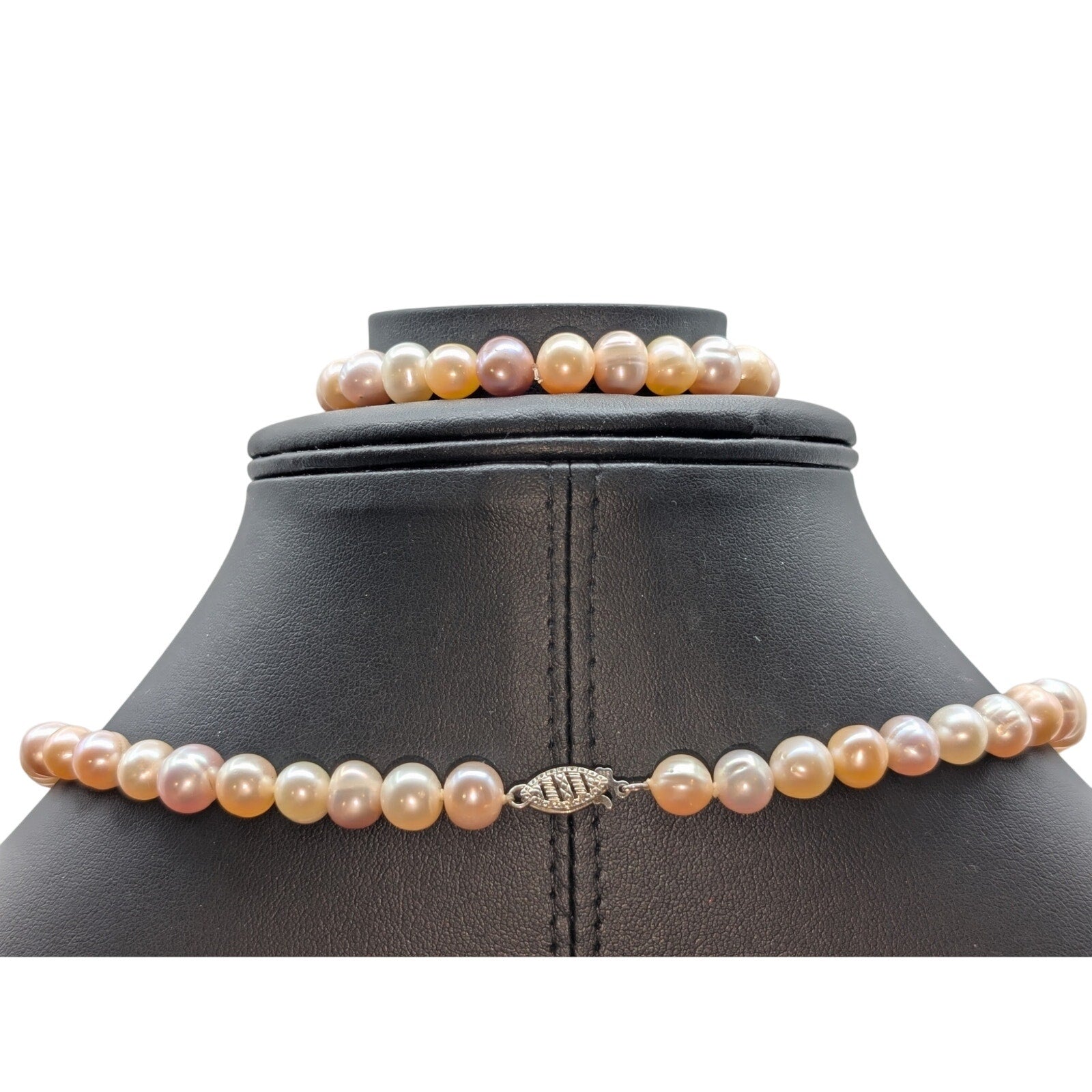 VTG 925 Sterling Silver Clasp 12mm Natural Freshwater Pearl 18" Necklace & Bracelet. Pearls range in color from pink, peach, lavender and ivory. Really pretty set. Necklace has a 925 Sterling Silver Hook and slide in clasp for security. Bracelet is a stretch bracelet which I personally would have restrung just for peace of mind, especially if you have a larger wrist. Without stretching, the inside diameter measures 6.5". This necklace and bracelet set is in excellent condition.