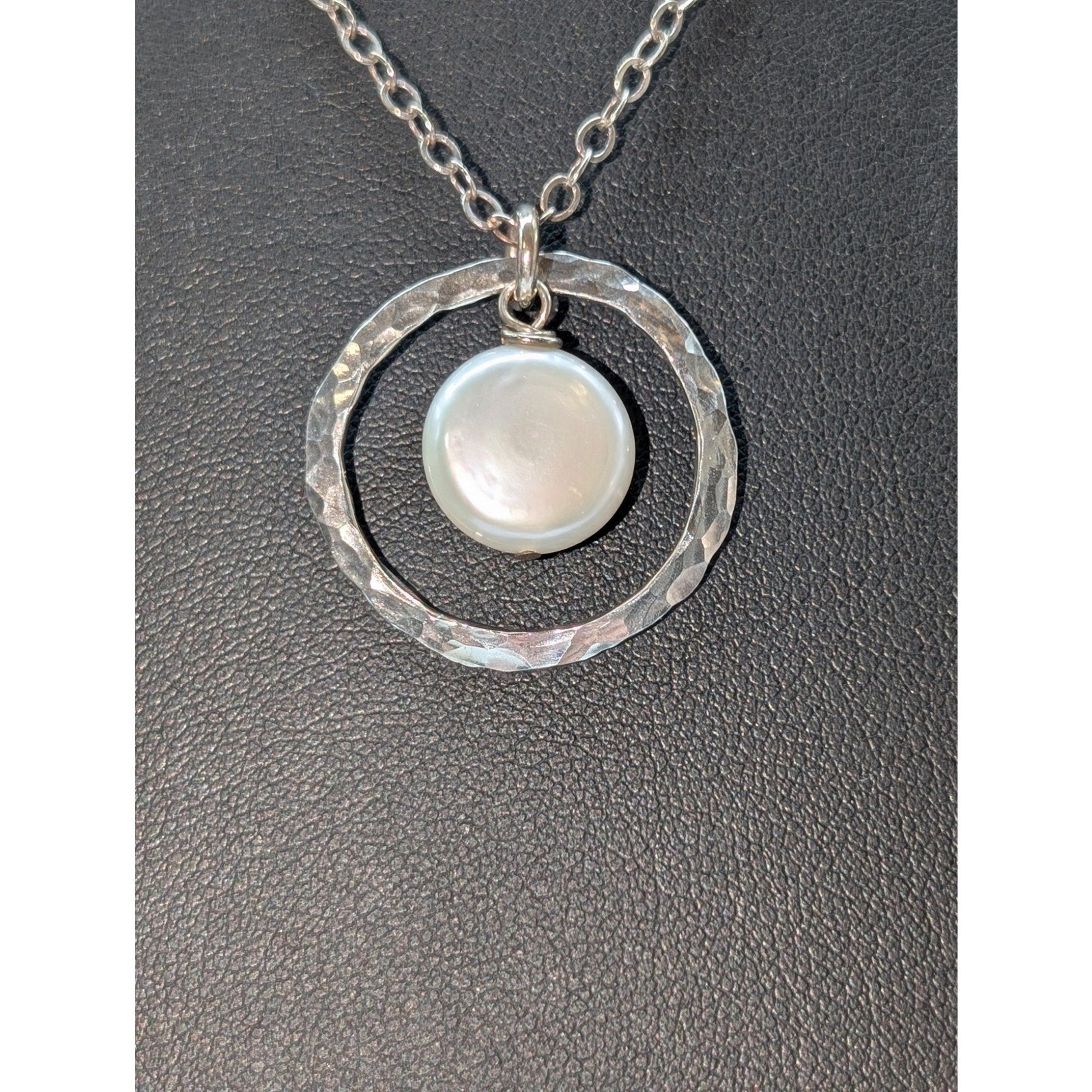 925 Sterling Silver Dangling Pearl In Hammered Circle Pendant Chain 16.5"-18.5" Necklace. Pre-owned, this necklace is in excellent condition.