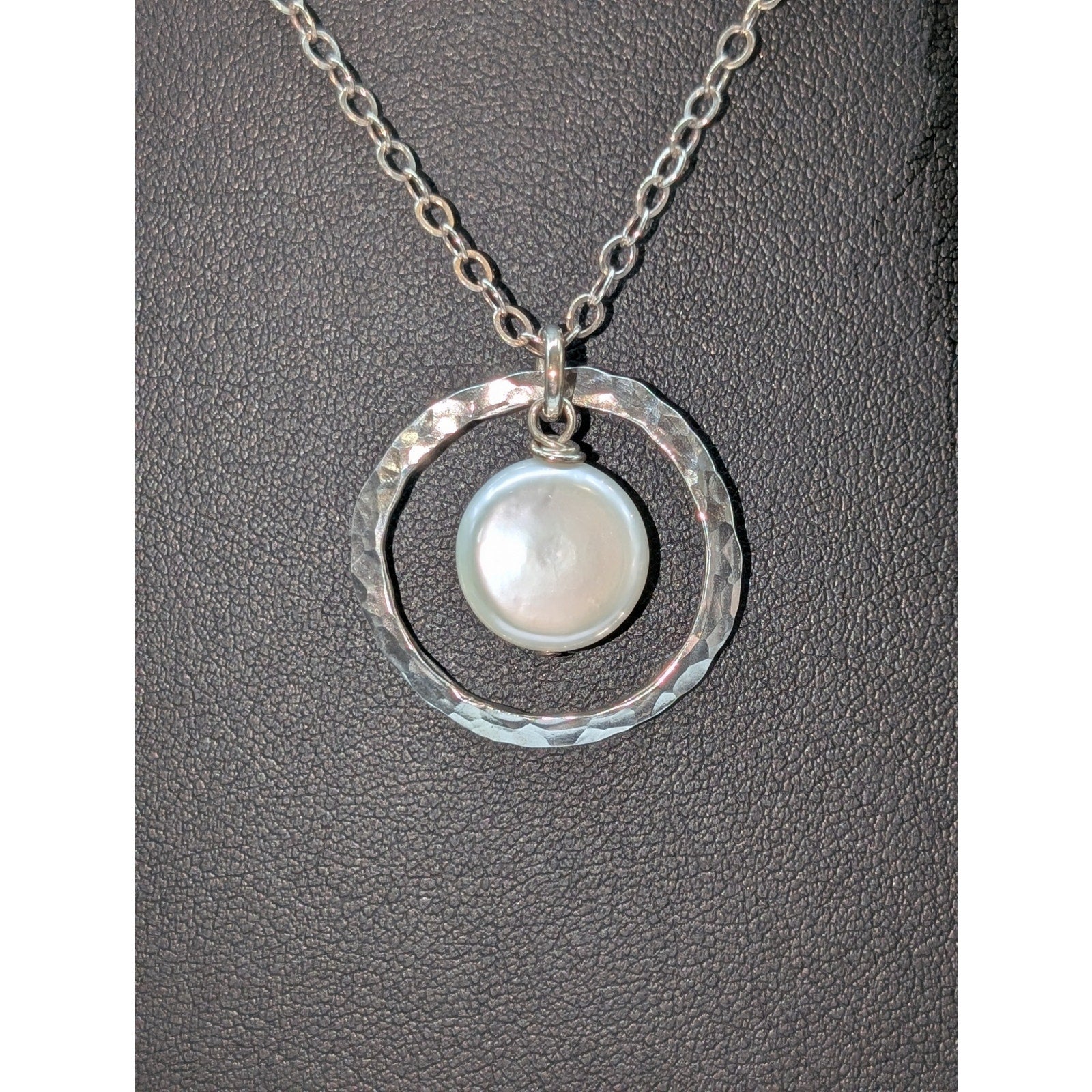925 Sterling Silver Dangling Pearl In Hammered Circle Pendant Chain Necklace