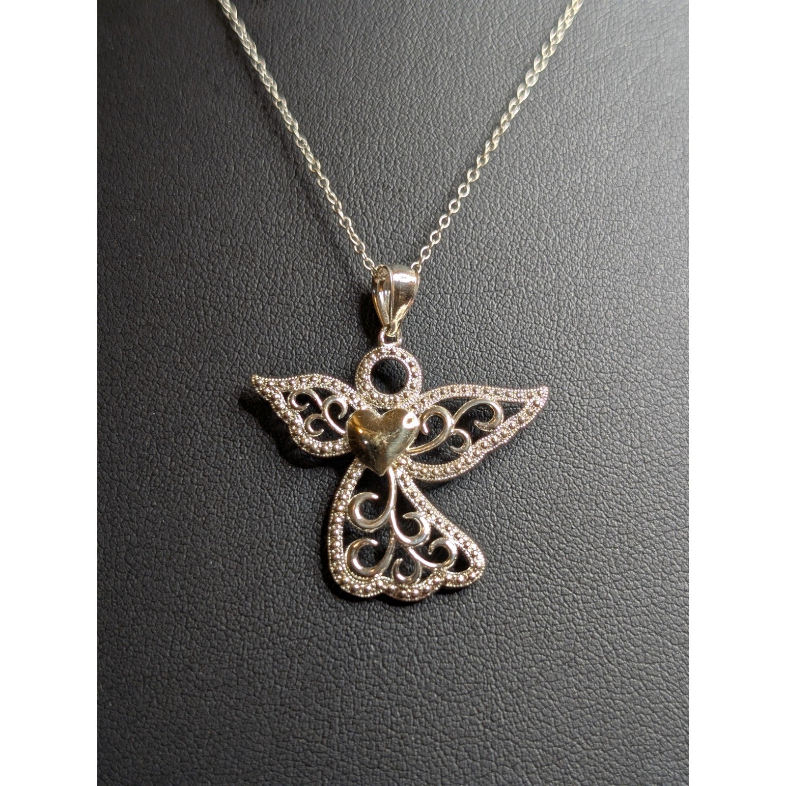 925 Sterling Silver Filigree Angel W/ 10K Yellow Gold Heart Pendant 18" Necklace. Pre-owned, this necklace is in excellent condition.