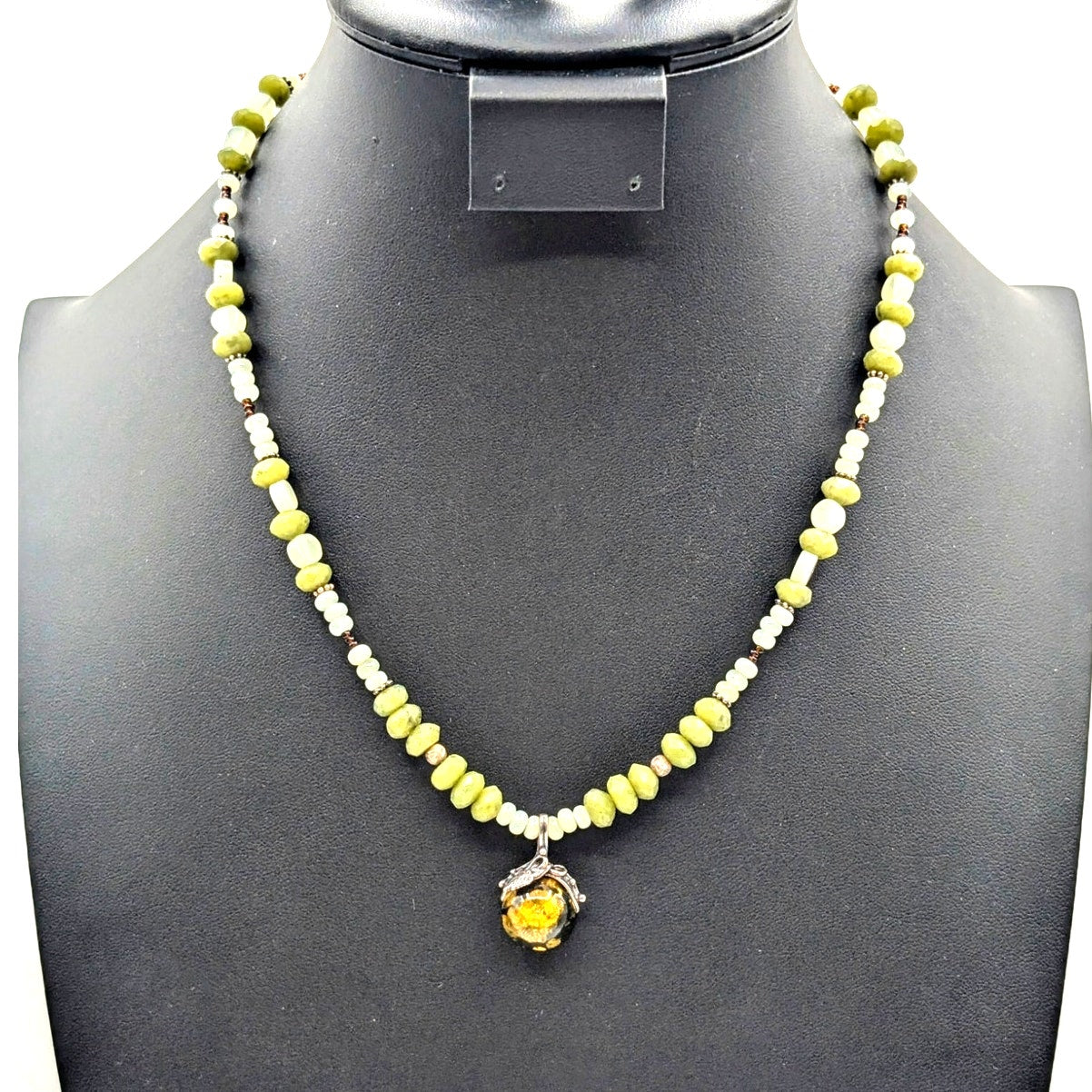 925 Sterling Silver Green Gemstone Bead Green Amber Pendant Necklace