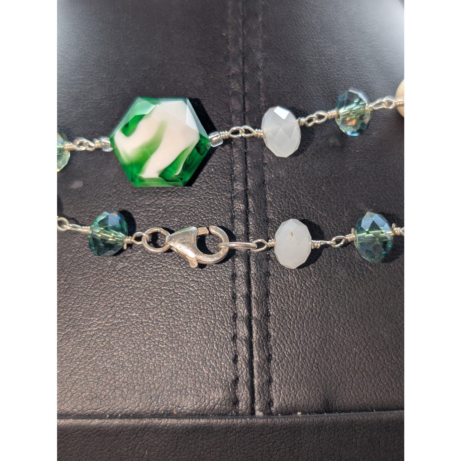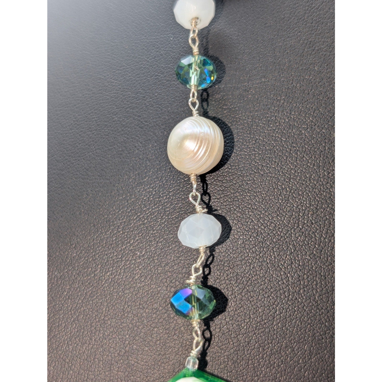 925 Sterling Silver Green White Swirl Glass Genuine Pearl Crystal 34" Necklace. This may be hard to wear doubled; I just wanted to a closer view of the gorgeous beads. This has everything--sterling, glass, crystal and genuine pearl. Really pretty piece.