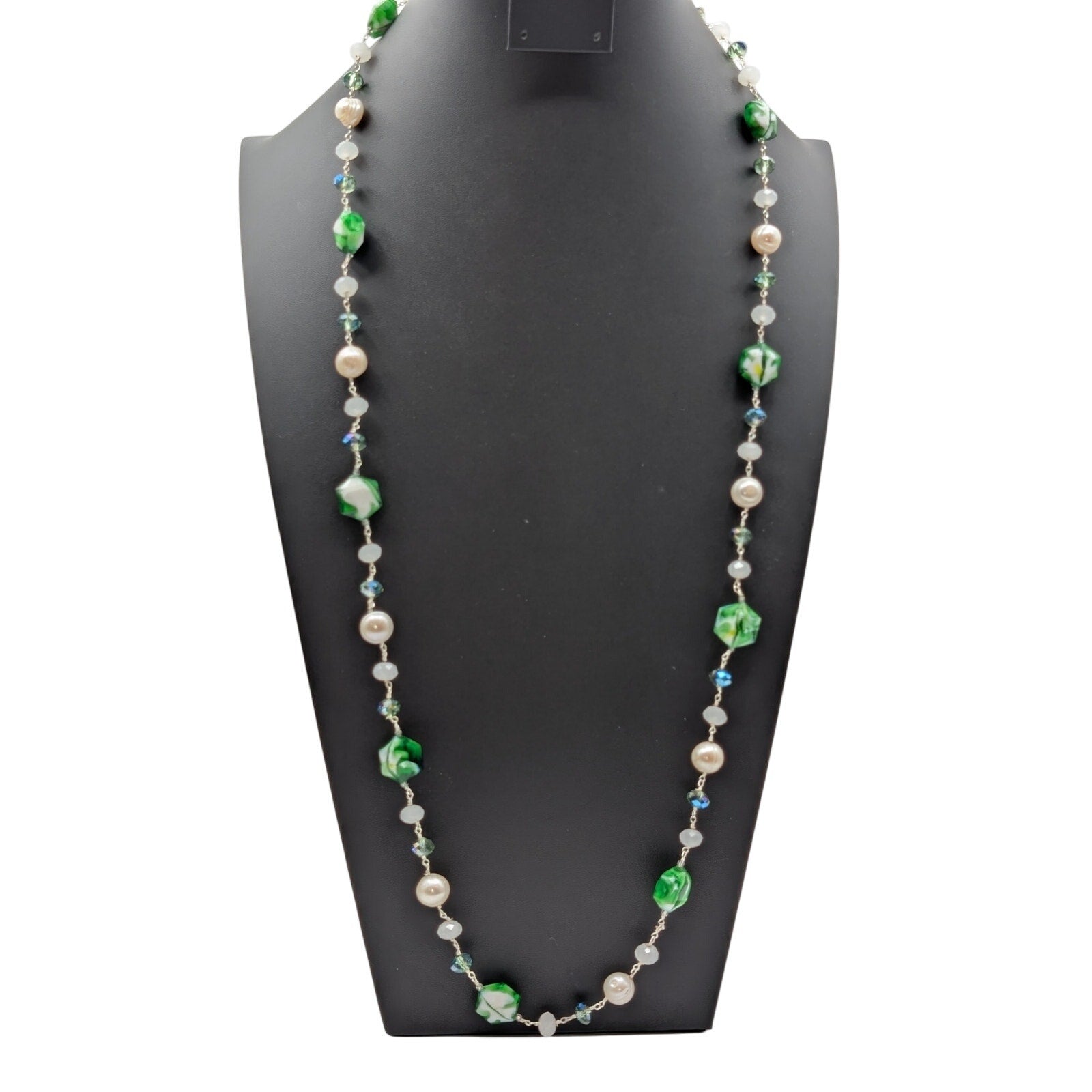 925 Sterling Silver Green White Swirl Glass Genuine Pearl Crystal 34" Necklace