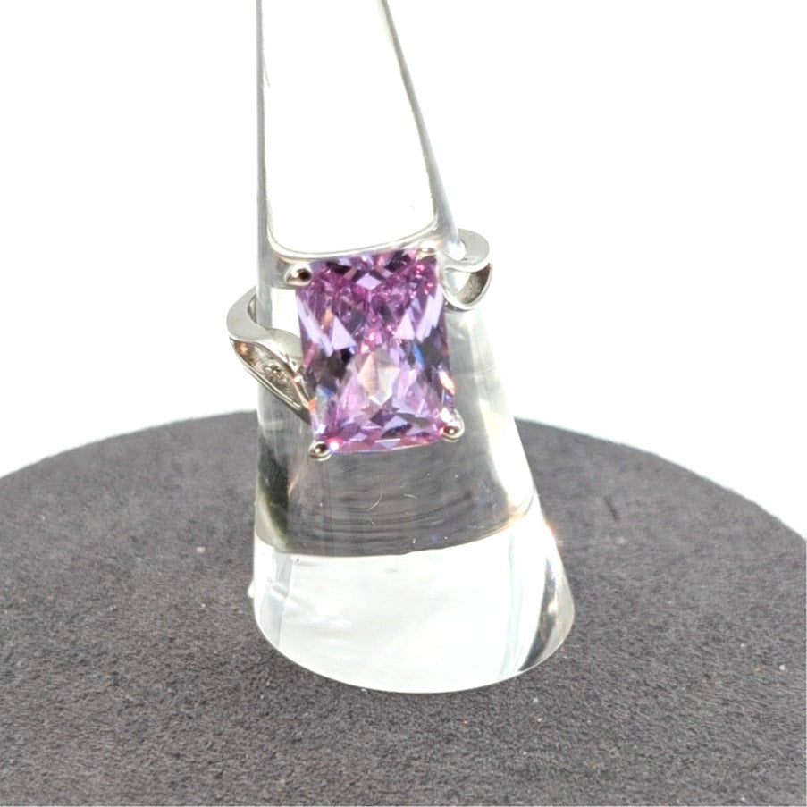 925 Sterling Silver Lavender Checkerboard Cut Rectangular Glass Stone Ring Sz 6. Pre-owned, this ring is in excellent condition. Stone measures approximately 14mm by 10mm. Lots of blues and pinks shooting from this multi-faceted cut ring. Really pretty.