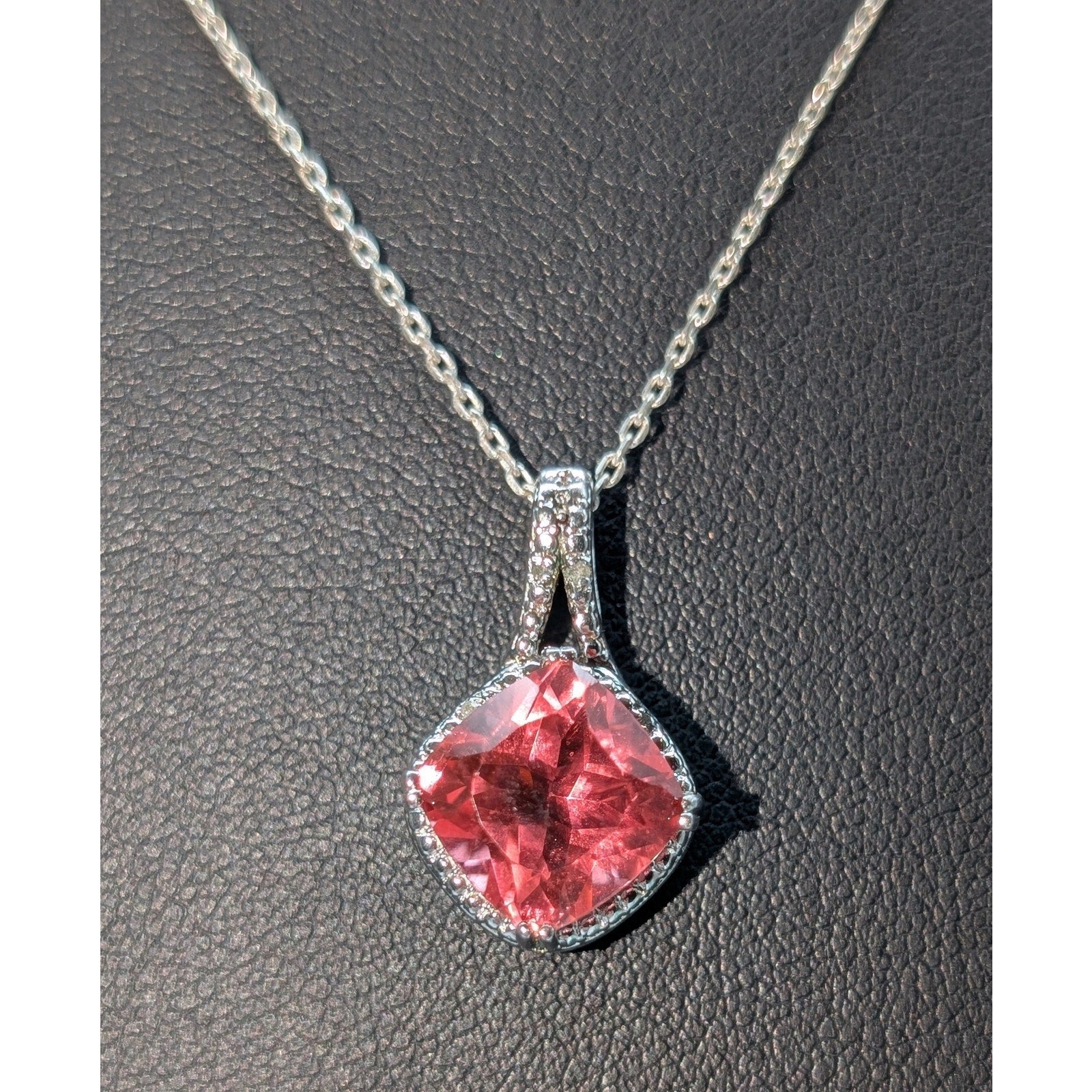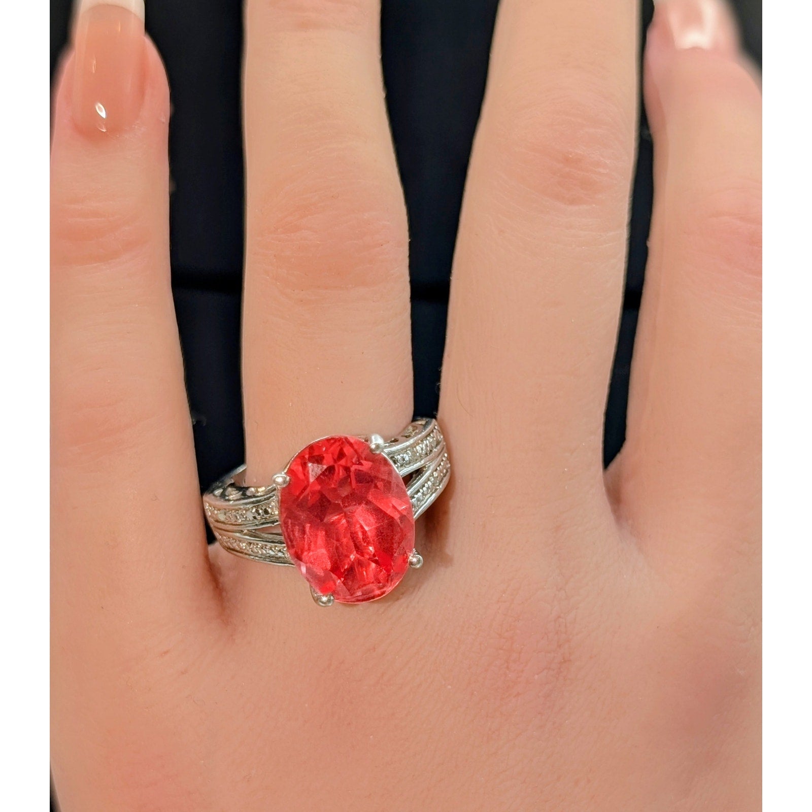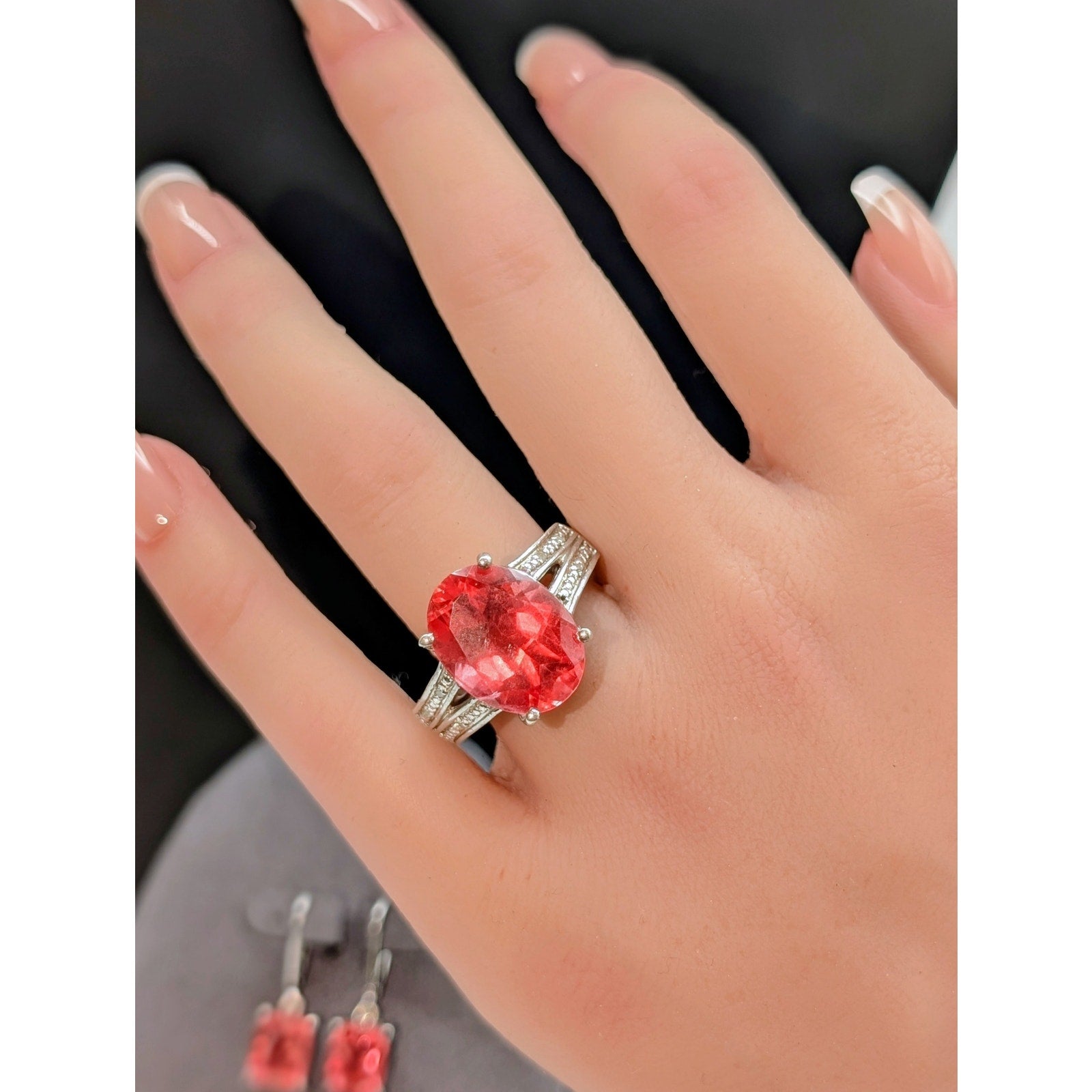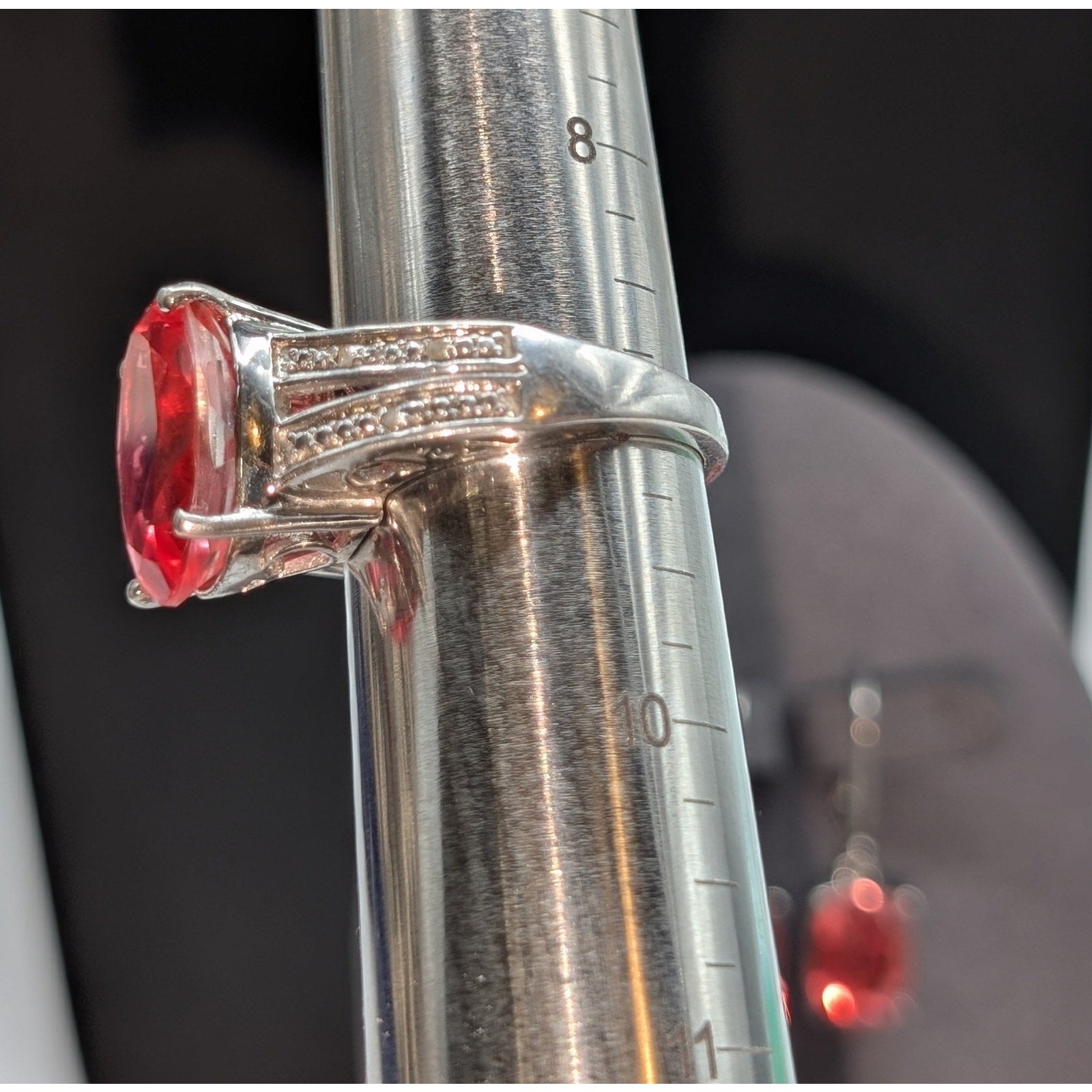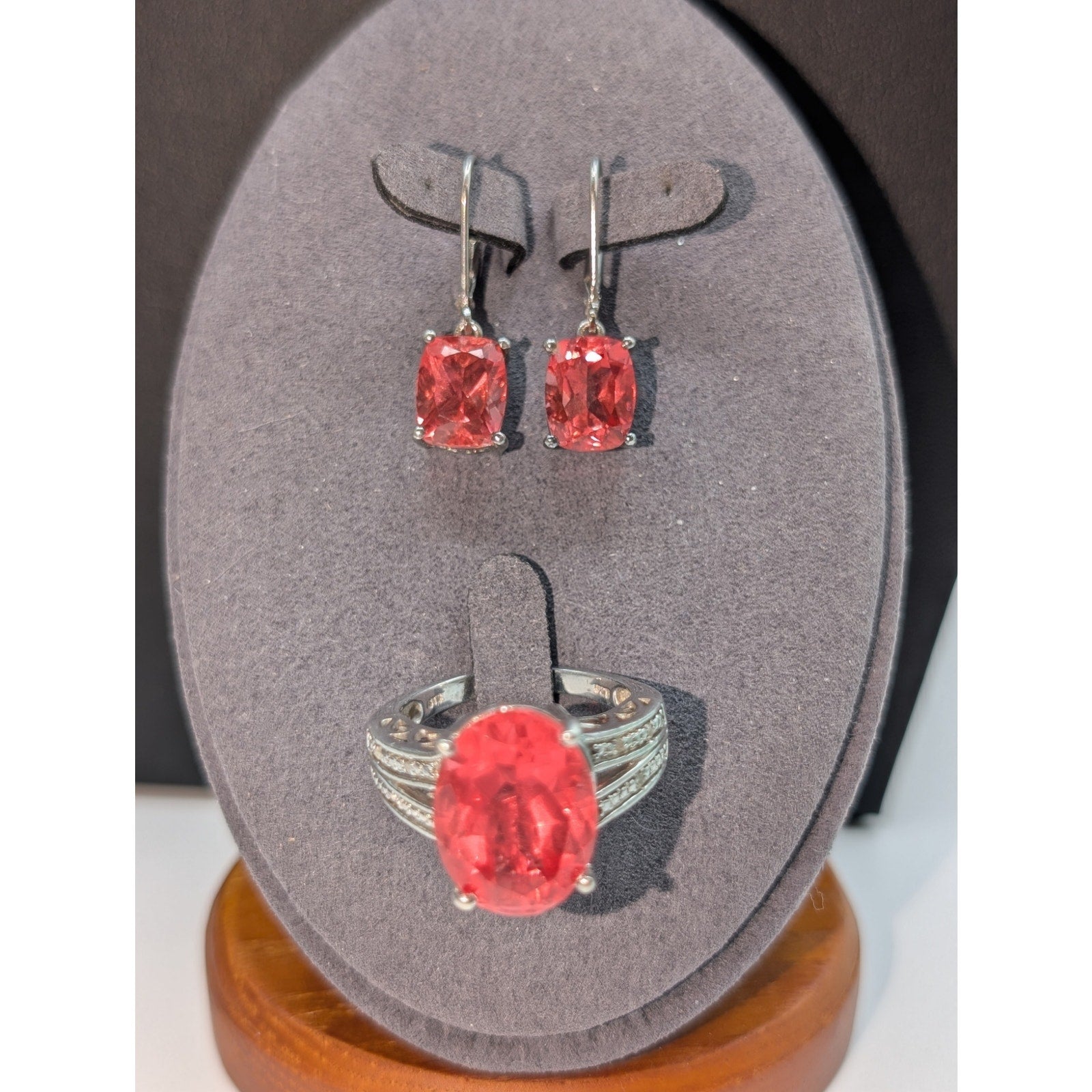 925 Sterling Silver Pinkish Orange Lab Created Gemstone Jewelry Set. I believe these are spinel, but I am not 100% certain. The ring is dead center in the spinel range on my gem tester and the others are between tourmaline and spinel somewhere. Gorgeous color. Ring is a size 9. All set in sterling silver and 17.75" chain is silver. Nice vibrant color set of jewelry great for any season. Pre-owned, this set is in excellent condition with minimal wear.