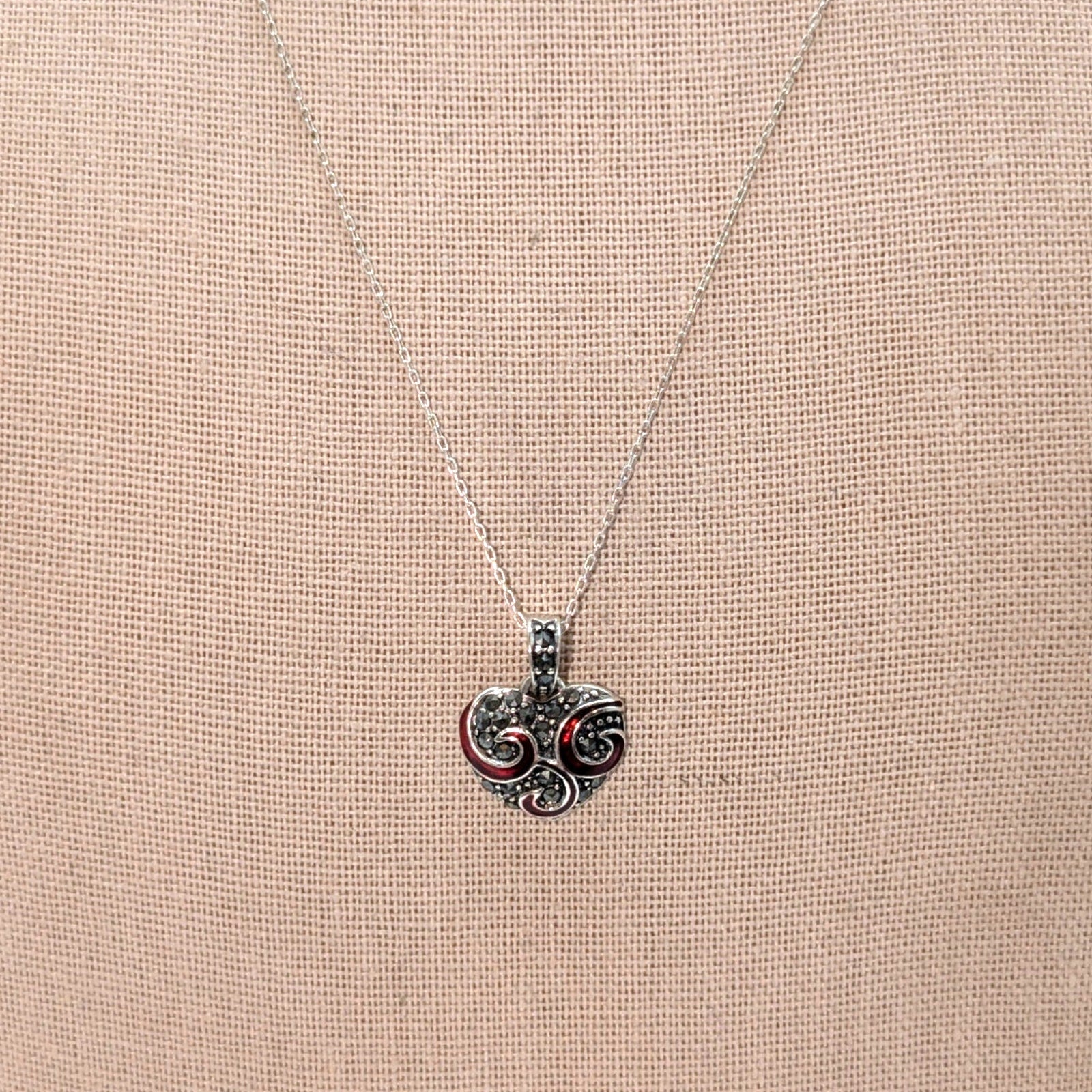925 Sterling Silver Red Enamel Swirl Marcasite Heart Pendant Necklace