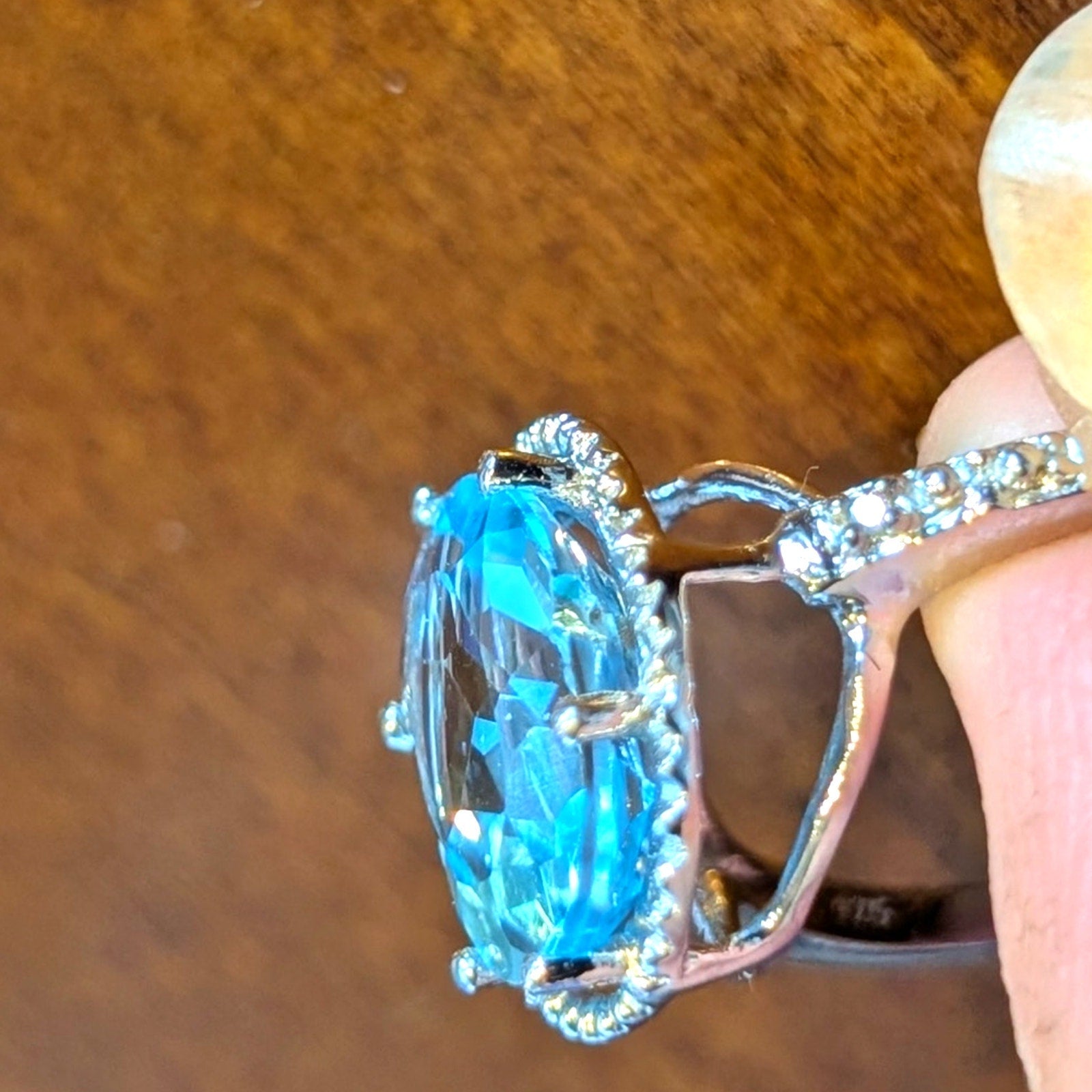 925 Sterling Silver Sky Blue Topaz Diamond Ring Size 8.25. Pre-owned, this ring is in great condition. It does have a small chip out of the side of the stone that I didn't see until I looked in my loupe. I tried to show it blown up in the last three pictures. The ring is gorgeous. Two small diamond on each side of the band.