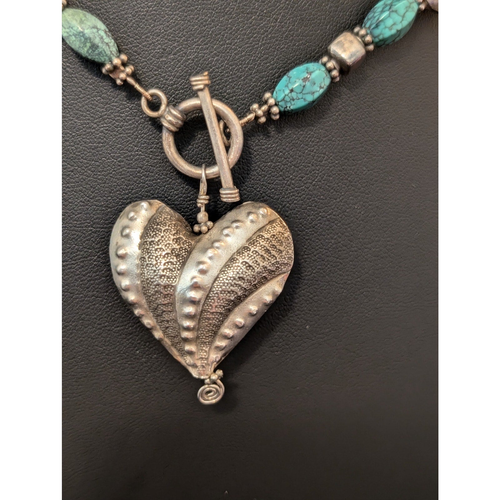 925 Sterling Silver Large Textured Puff Heart Pendant w/ Round Pillow, Square & Turquoise Beads and Front Toggle Clasp Necklace. Gorgeous! Unique. Pre-owned, this stunning necklace is in excellent condition. Southwestern. Measures 17" long to toggle. Not marked sterling that I can see, but everything tests positive for sterling.