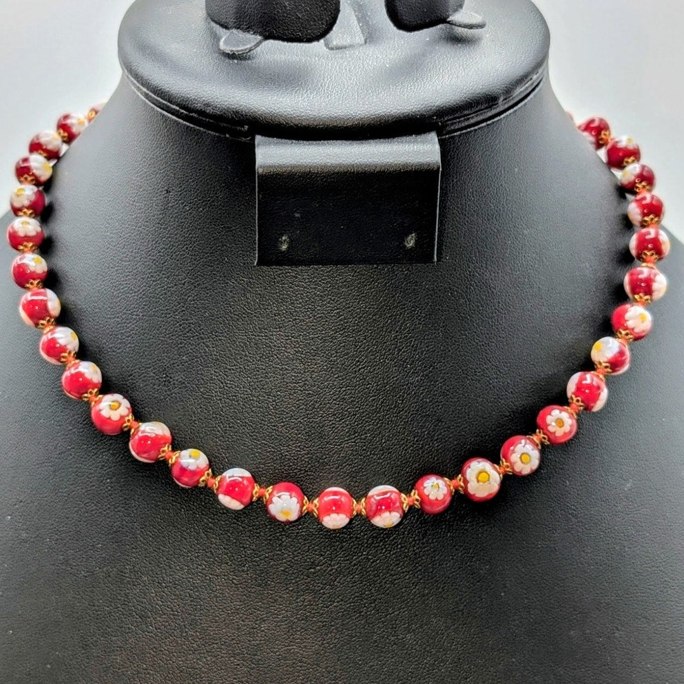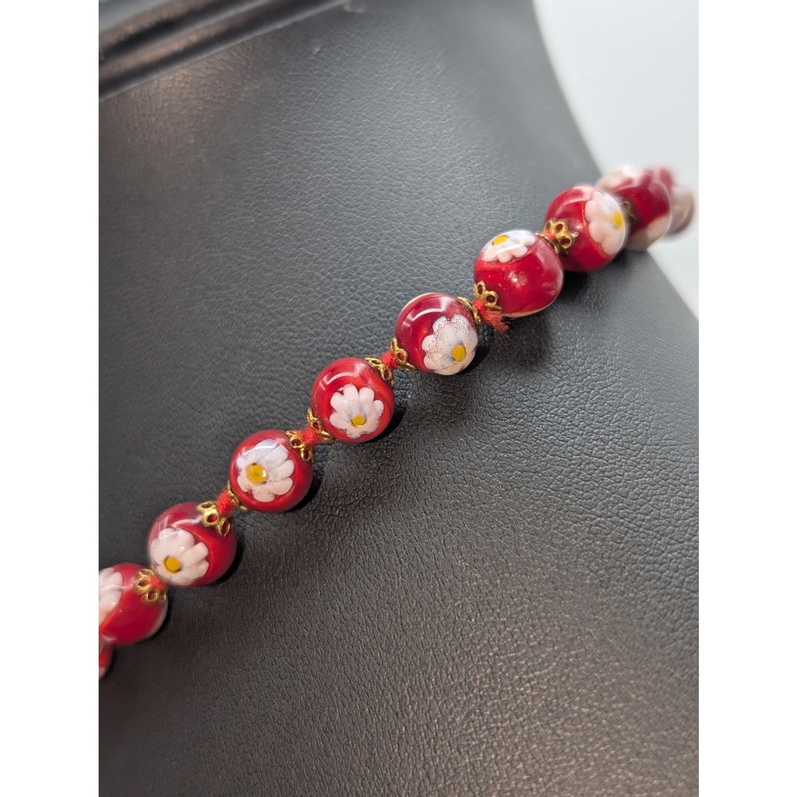 Antica Murrina Venezia Red Glass White Rose Millefiori Bead 16.5" Necklace. Pre-owned, this necklace is in excellent condition. Approximately 8mm beads.
