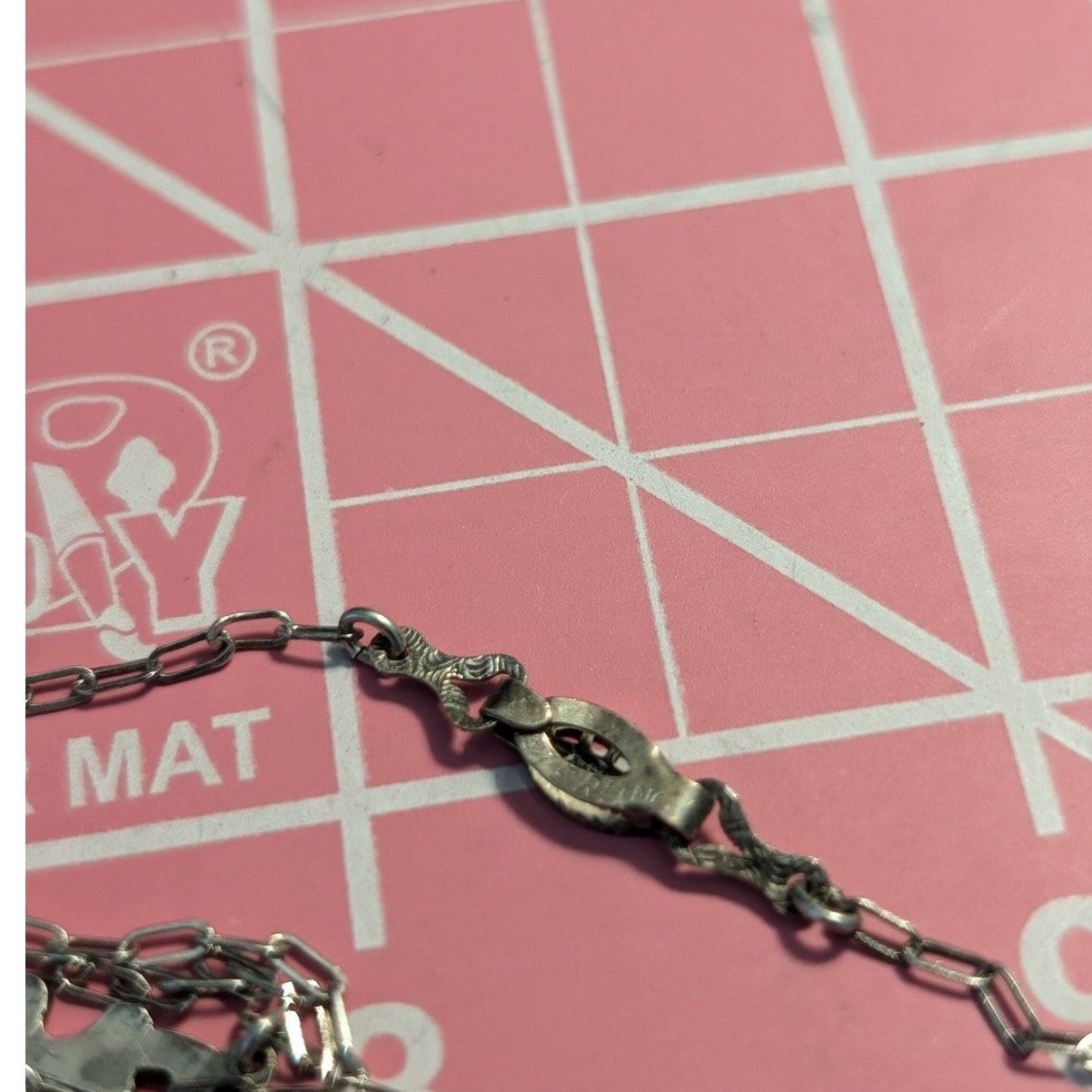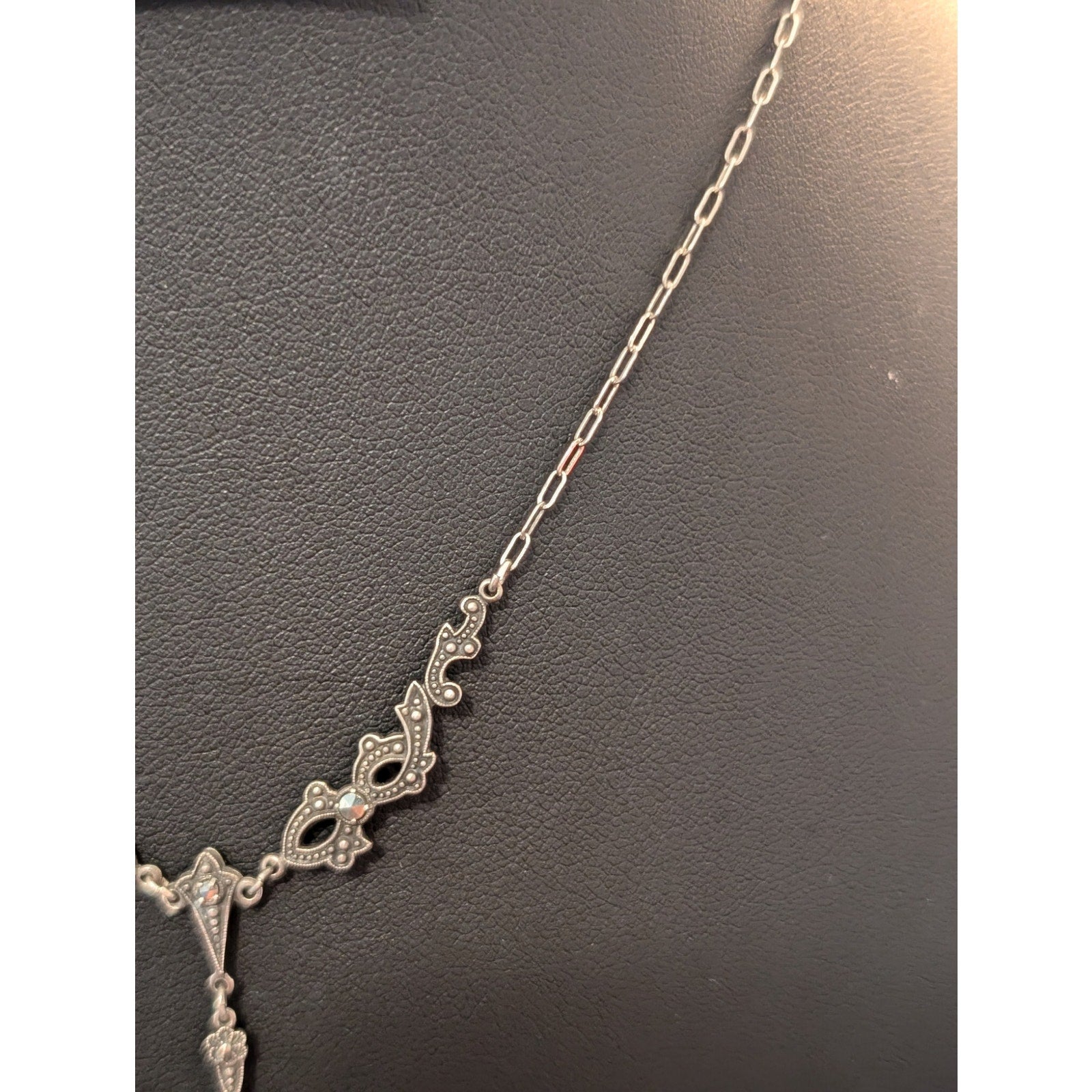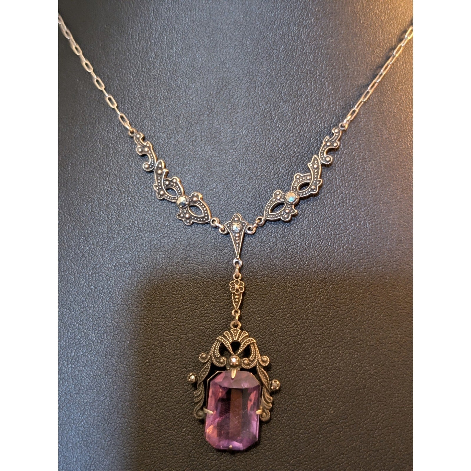 Antique Art Deco Sterling Amethyst Marcasite Filigree Pendant Paperclip Necklace
