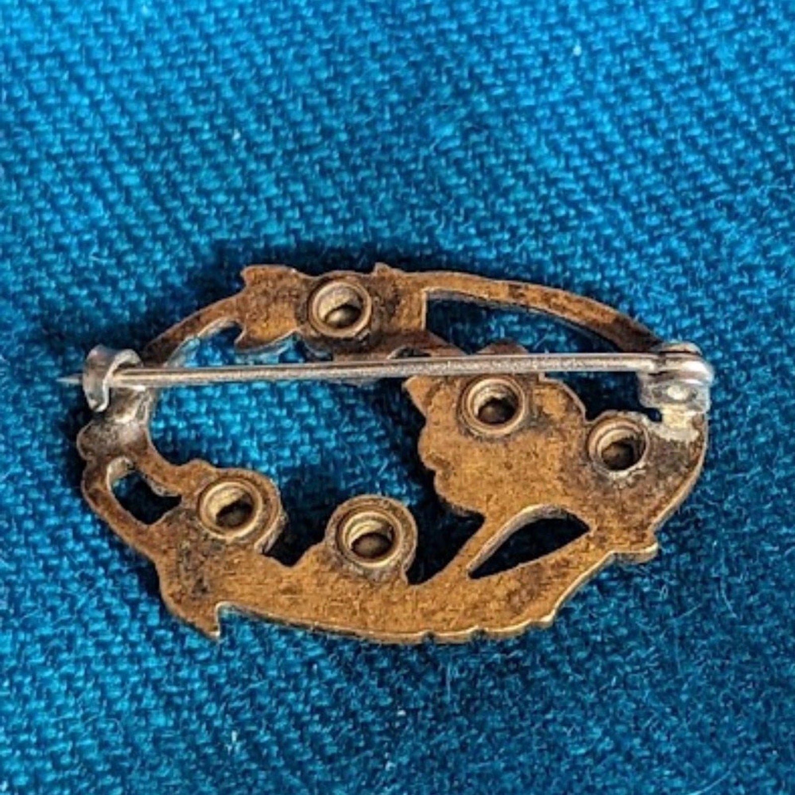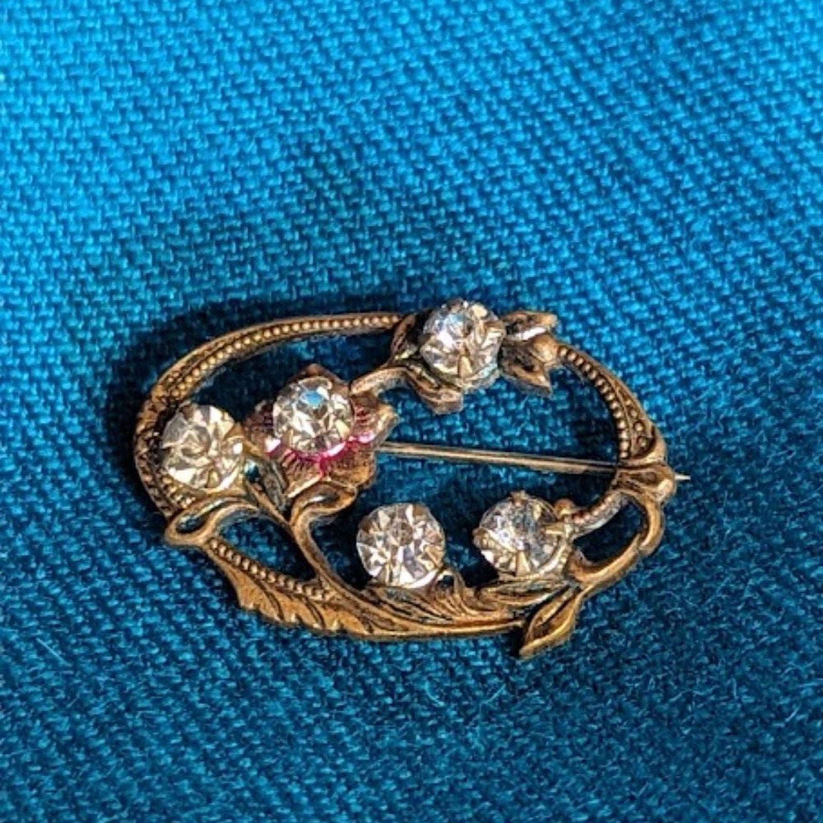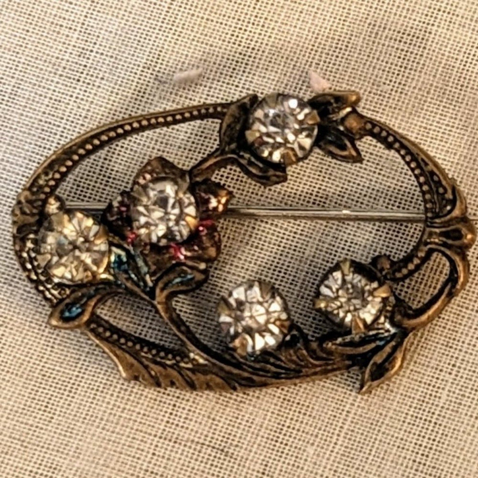 Antique Art Nouveau Clear Paste Rhinestone Ornate Floral Oval Brass Tone Brooch. It measures 1 1/8" long by 3/4" wide. Pre-owned, this is a lovely Antique Art Nouveau piece with beautiful clear paste rhinestones that shine like diamonds. Long ago it had some enameling which has faded over time. In good antique condition may show minor signs of wear due to normal use and age.