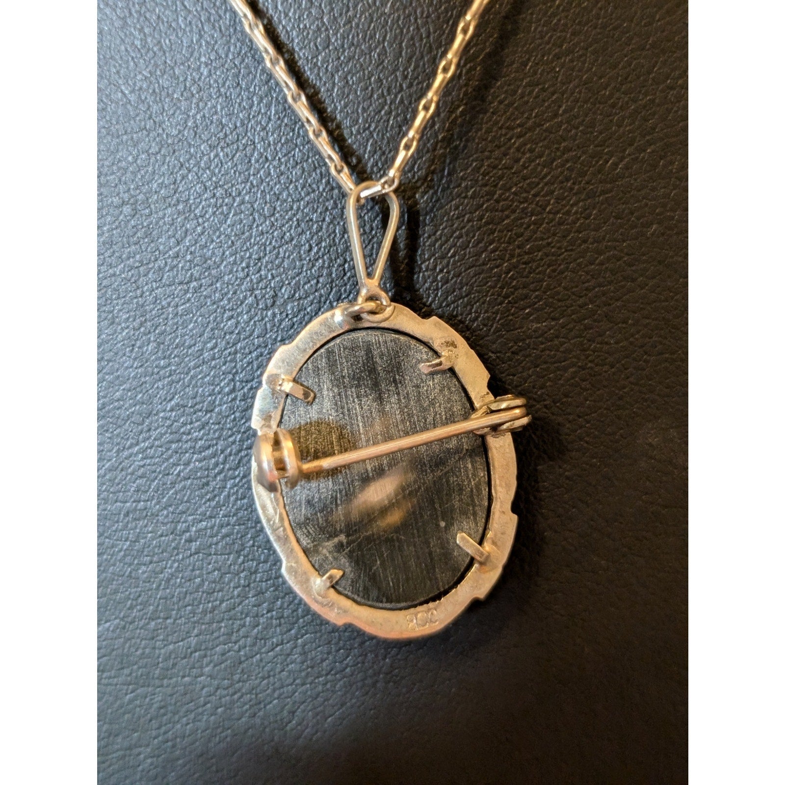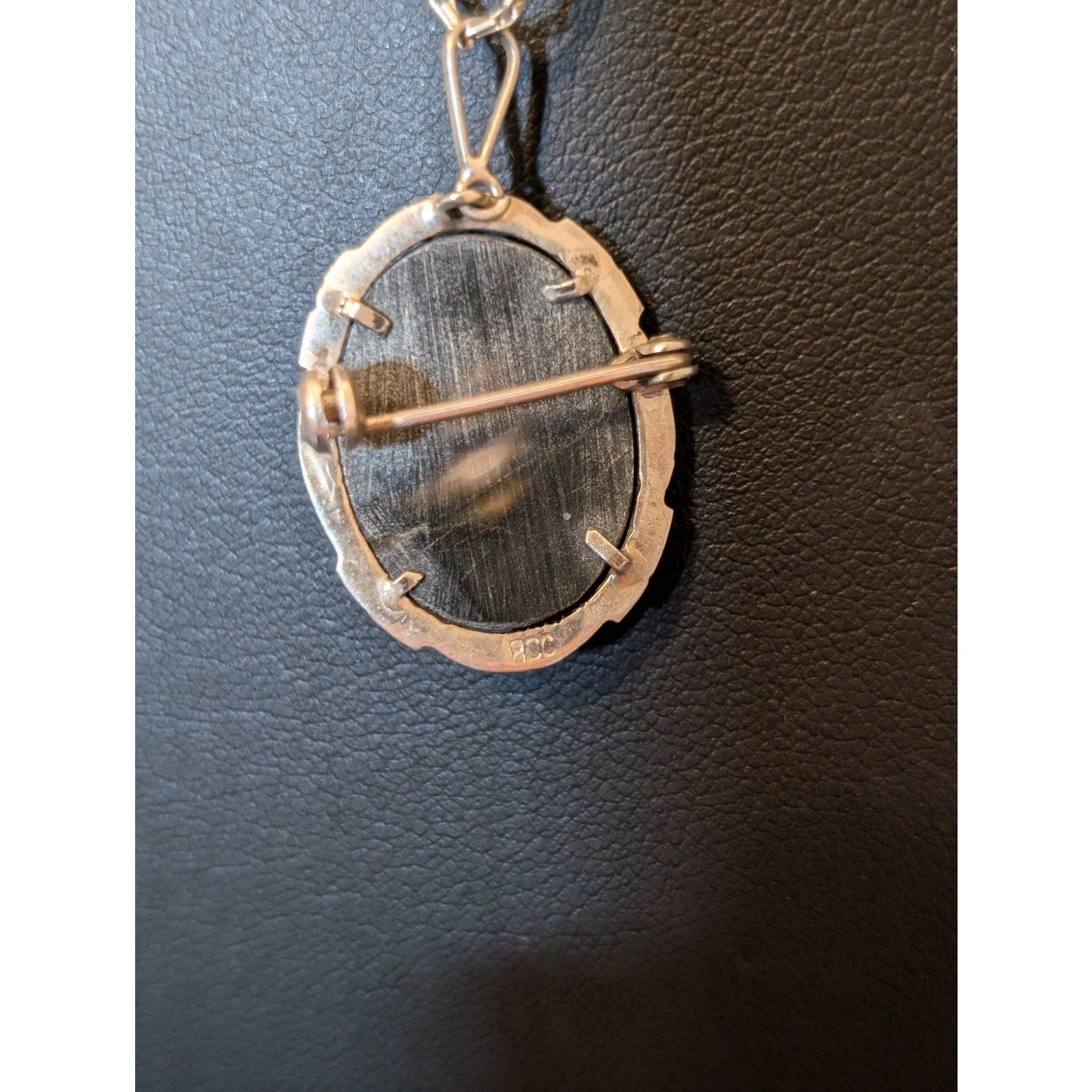 Antique Carved MOP Marcasite Cameo 800 Silver Pendant Pin Chain Necklace