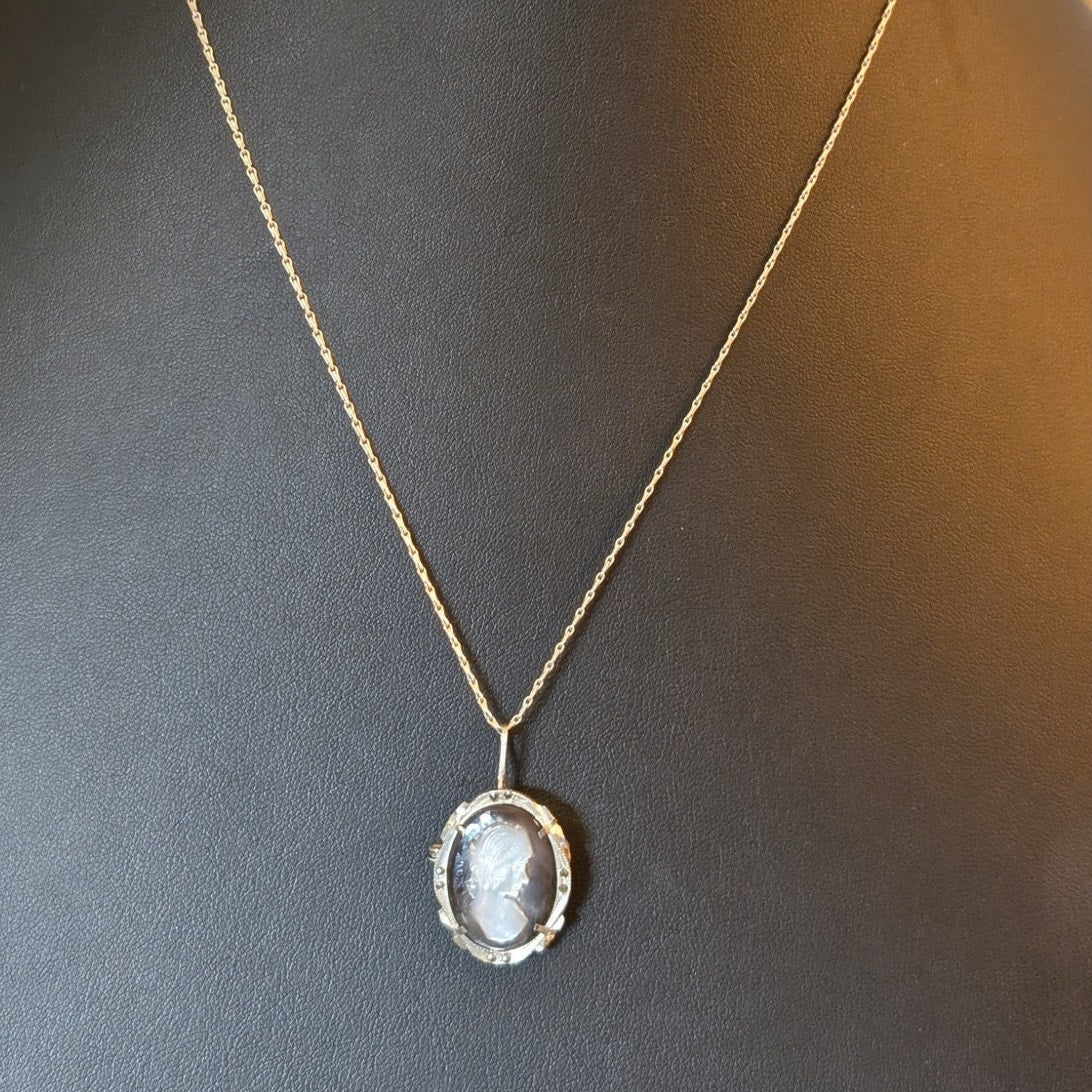 Antique Carved MOP Marcasite Cameo 800 Silver Pendant Pin Chain Necklace. Pre-owned, this necklace is in excellent antique condition. The chain, especially, is unique and delicate measuring 20" long.
