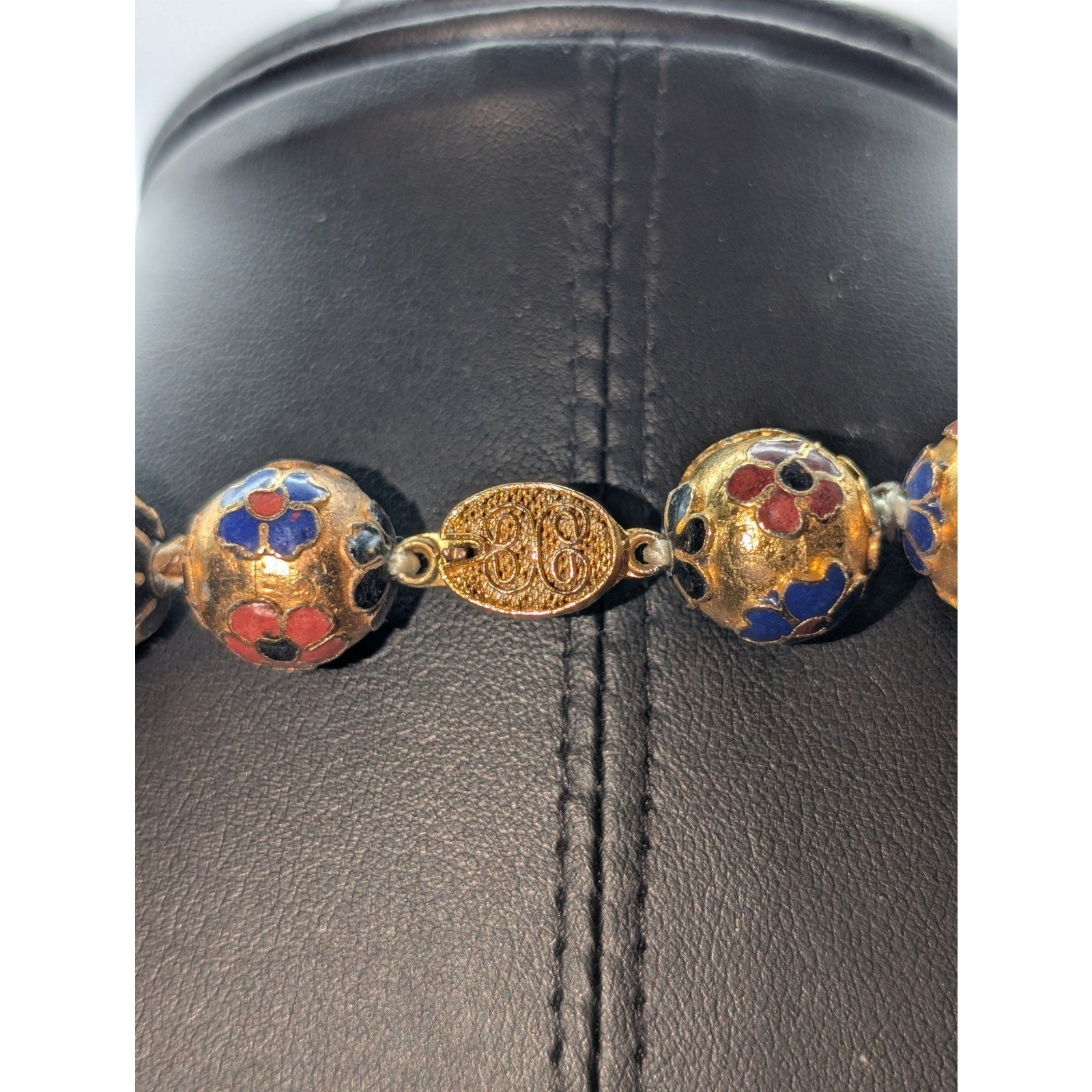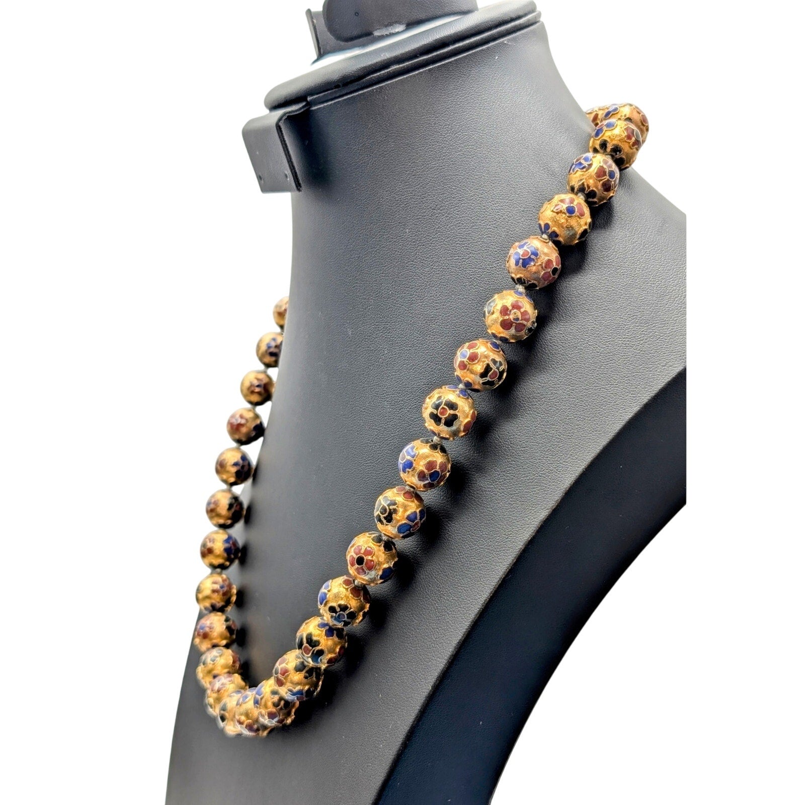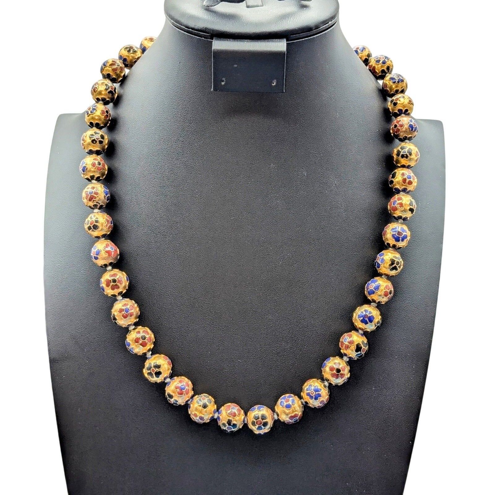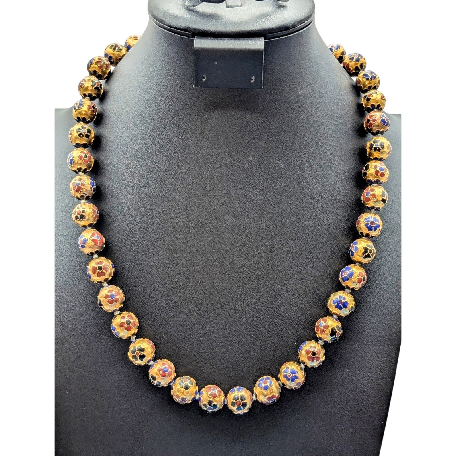 Antique Chinese Cloisonne Multi-Color Enamel Hand Knotted 14mm Bead Necklace