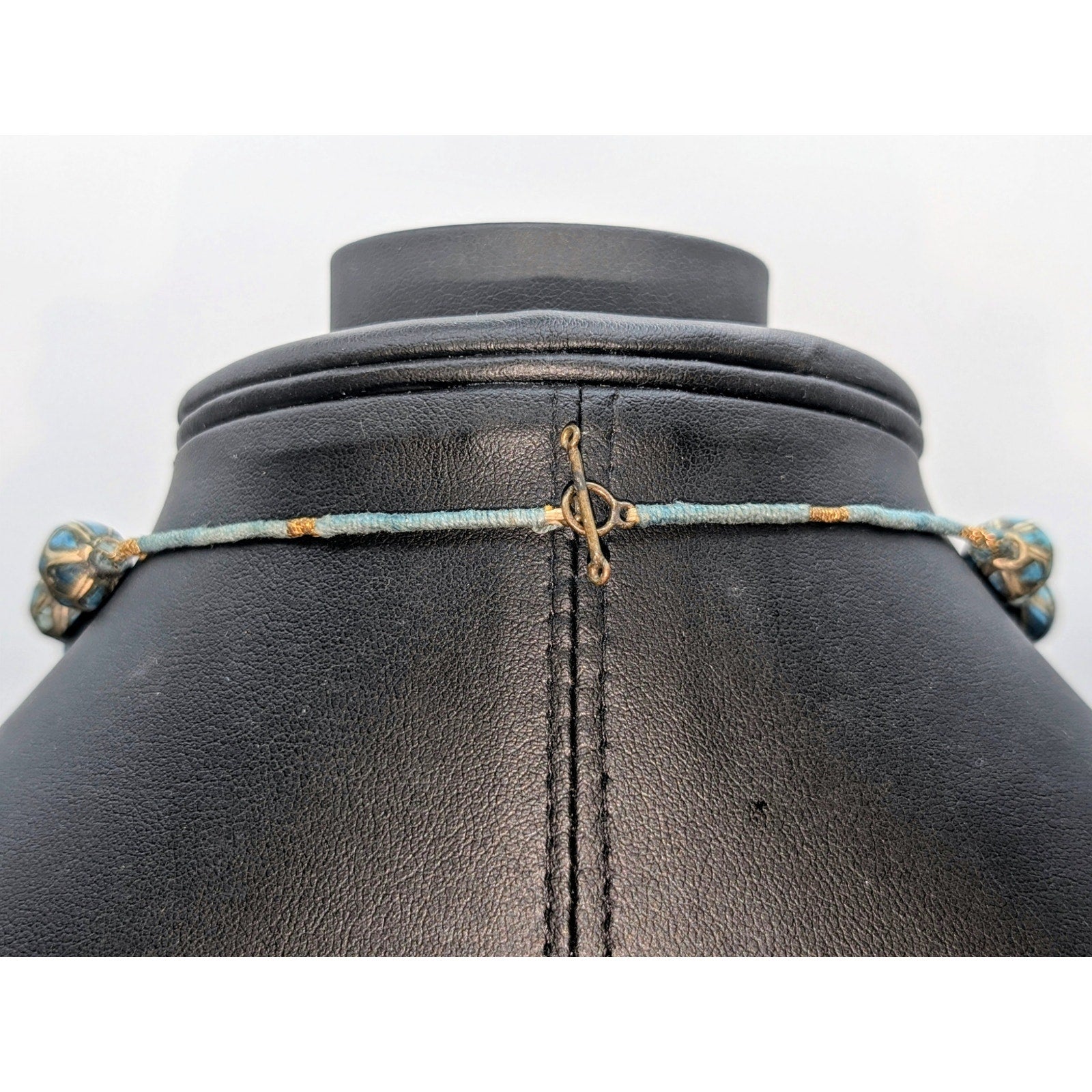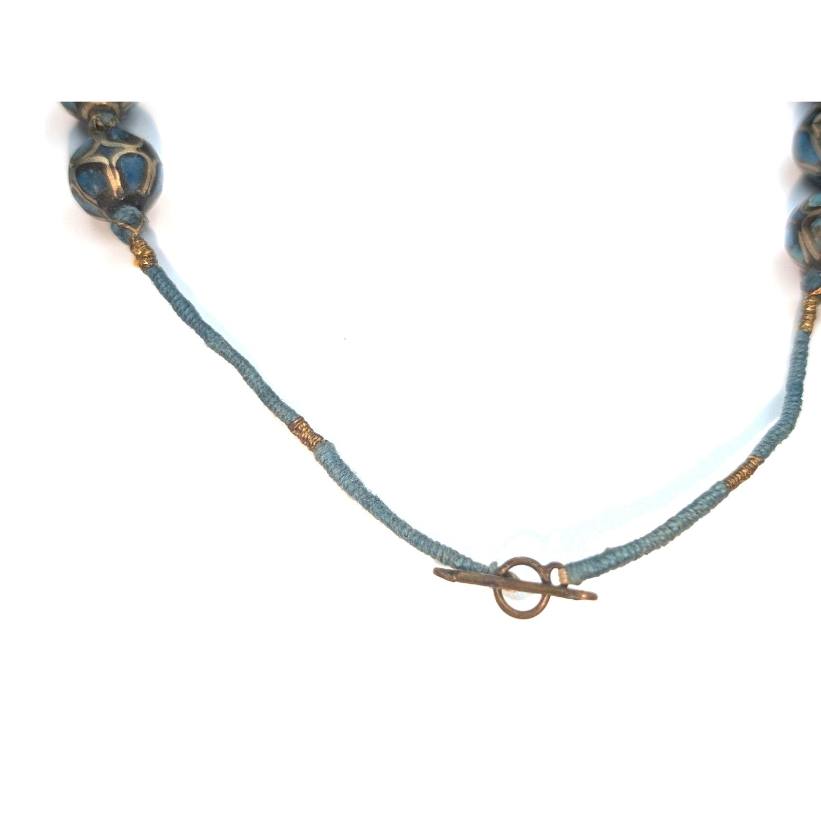 Antique Hand Made Ethnic Turquoise Inlay Non-Magnetic Graduated Bead 15.5" Necklace. Metal inlay appears brass or gold tone. There is minor fraying on the hand knotting in between the beads but the piece is stable. Very intricate and meticulous hand working. Pre-owned, this necklace is in great antique condition.