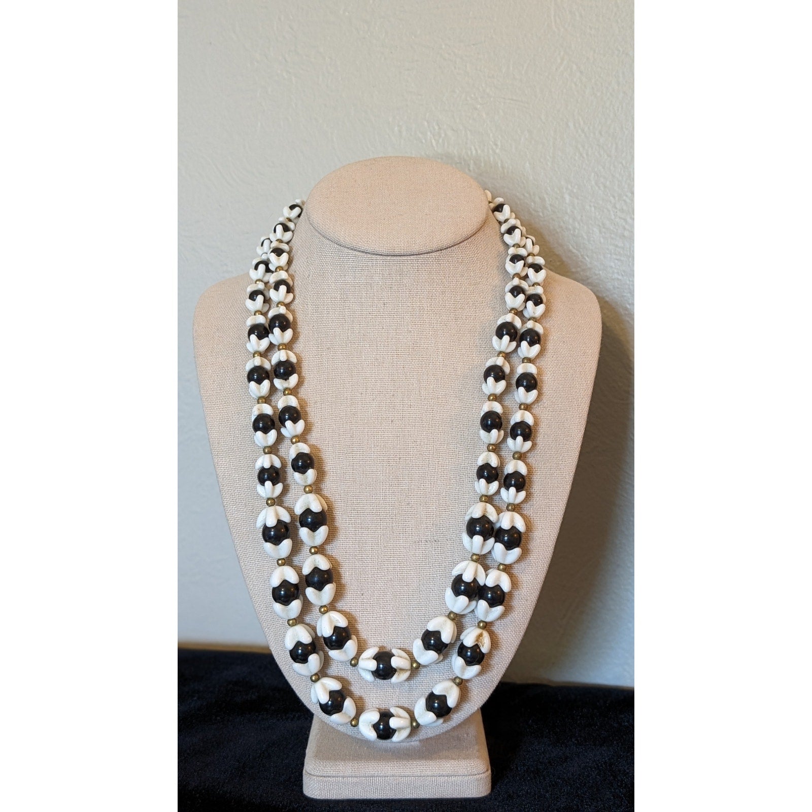 Antique Original 1920s/30s Celluloid Monochrome Black White Beaded Necklace. Double strand. Slide in Bead Clasp. Pre-owned, this necklace is in excellent condition. Inside strand measures 22" and longer strand measures 24". Gorgeous piece. Could use a gentle, mild cleaning with a soft brush and cloth.