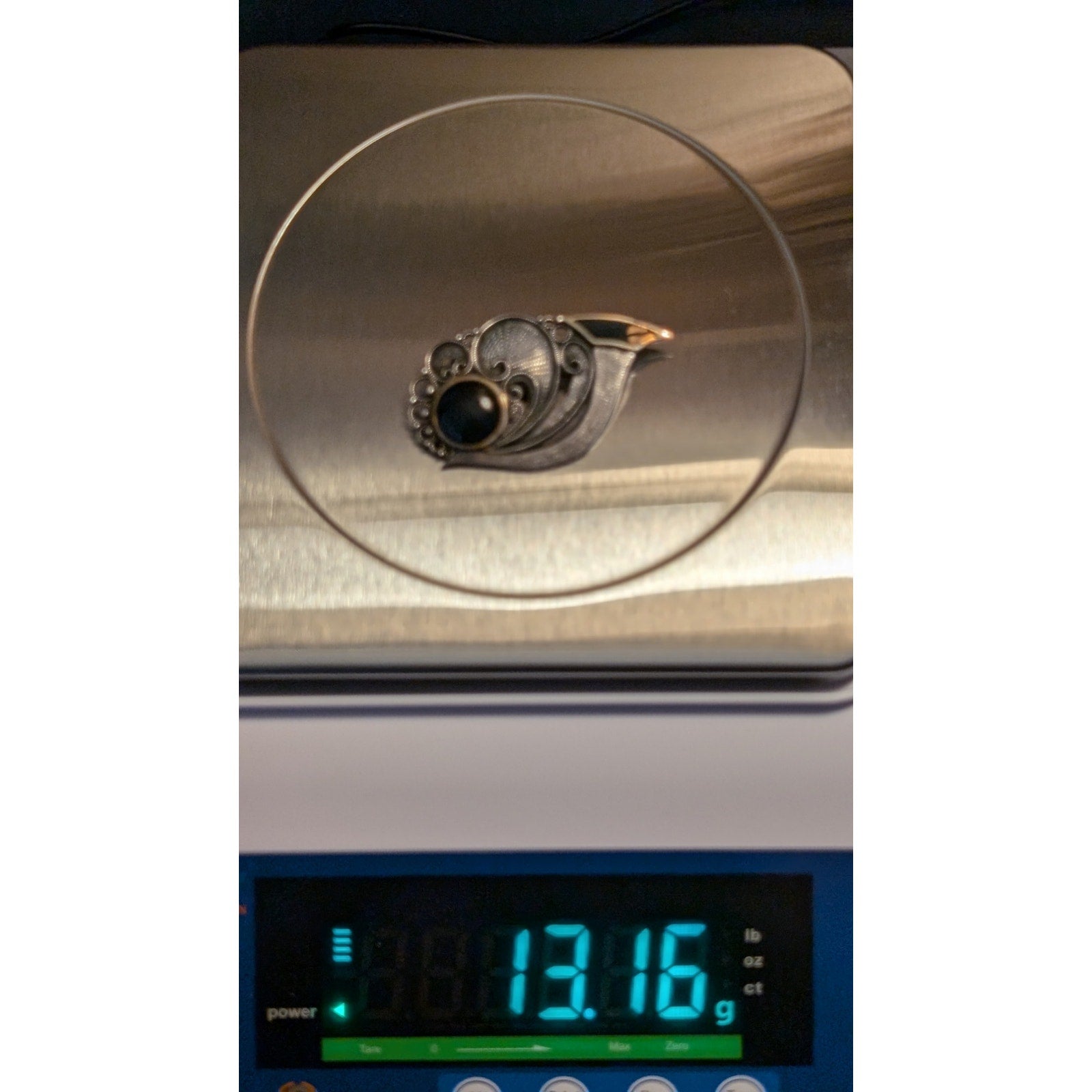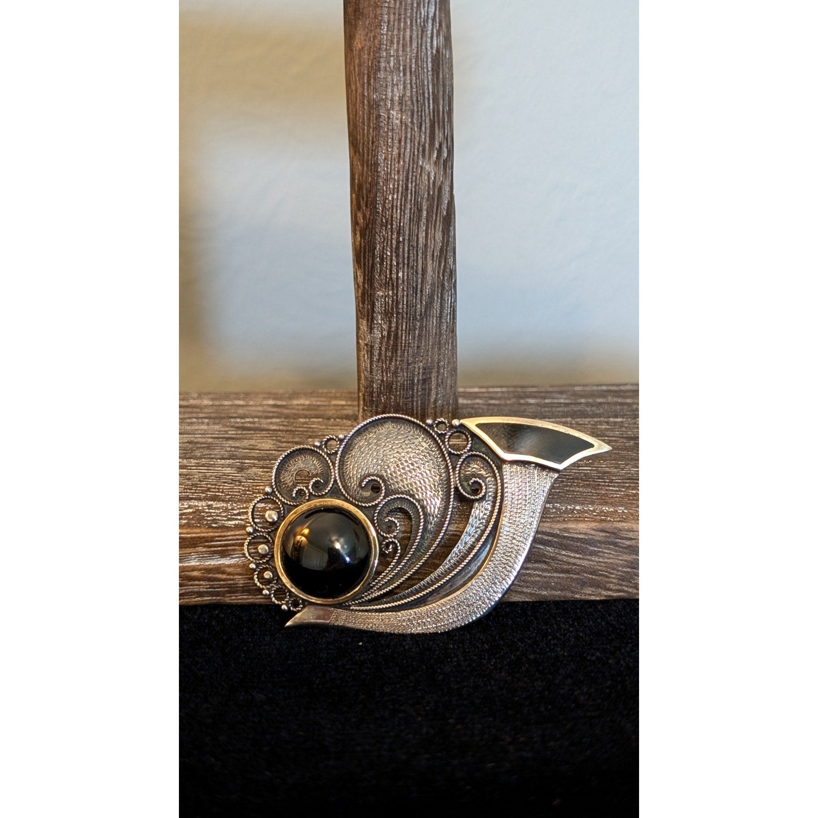 Antique Sterling Black Cabochon & Inlay Two Tone Push-Pull Trombone Back Brooch