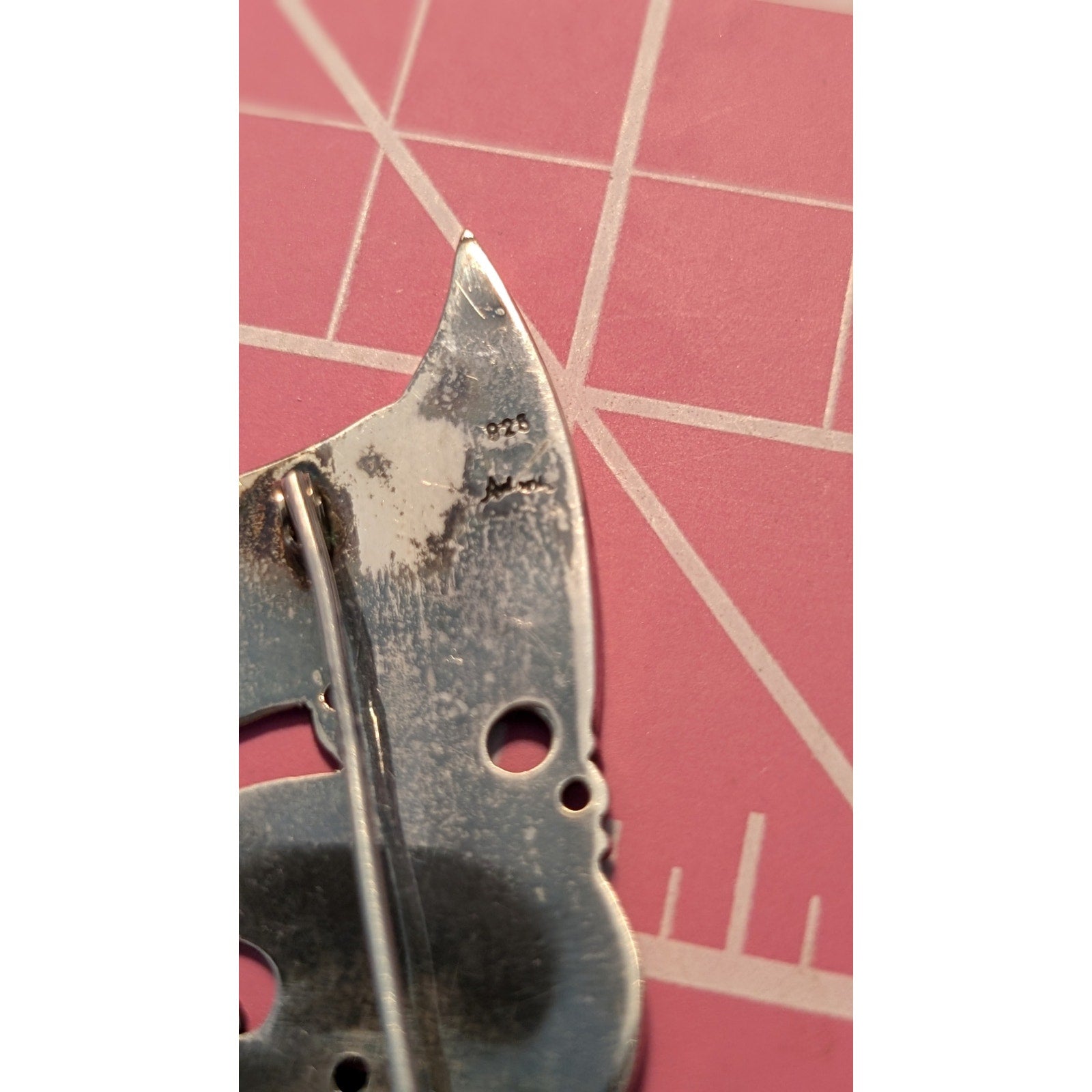 Push-Pull Safety Trombone Back c.1890 . Pre-owned, this gorgeous, detailed brooch is in excellent antique condition. It is signed, but I can't make out the maker or find another one on line.