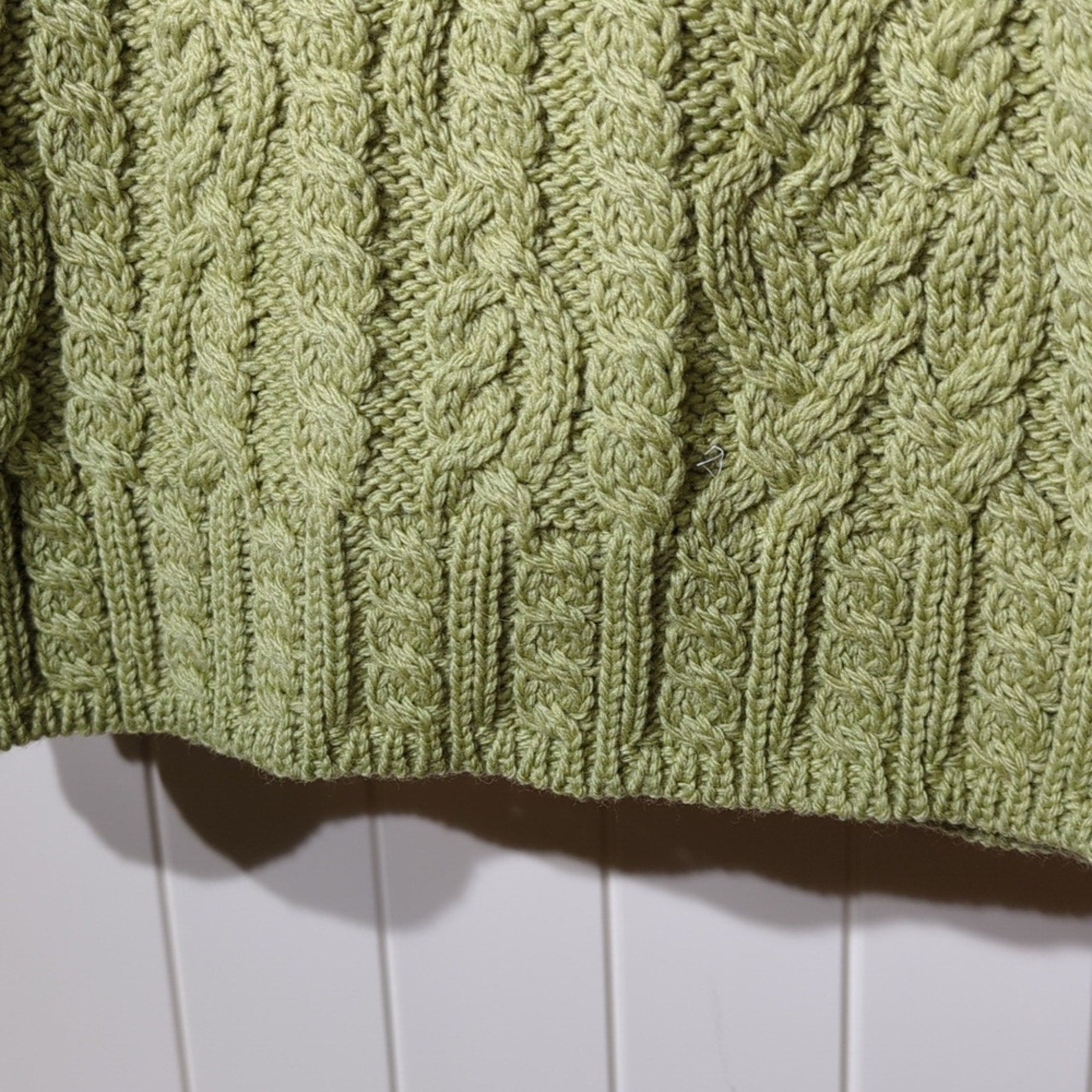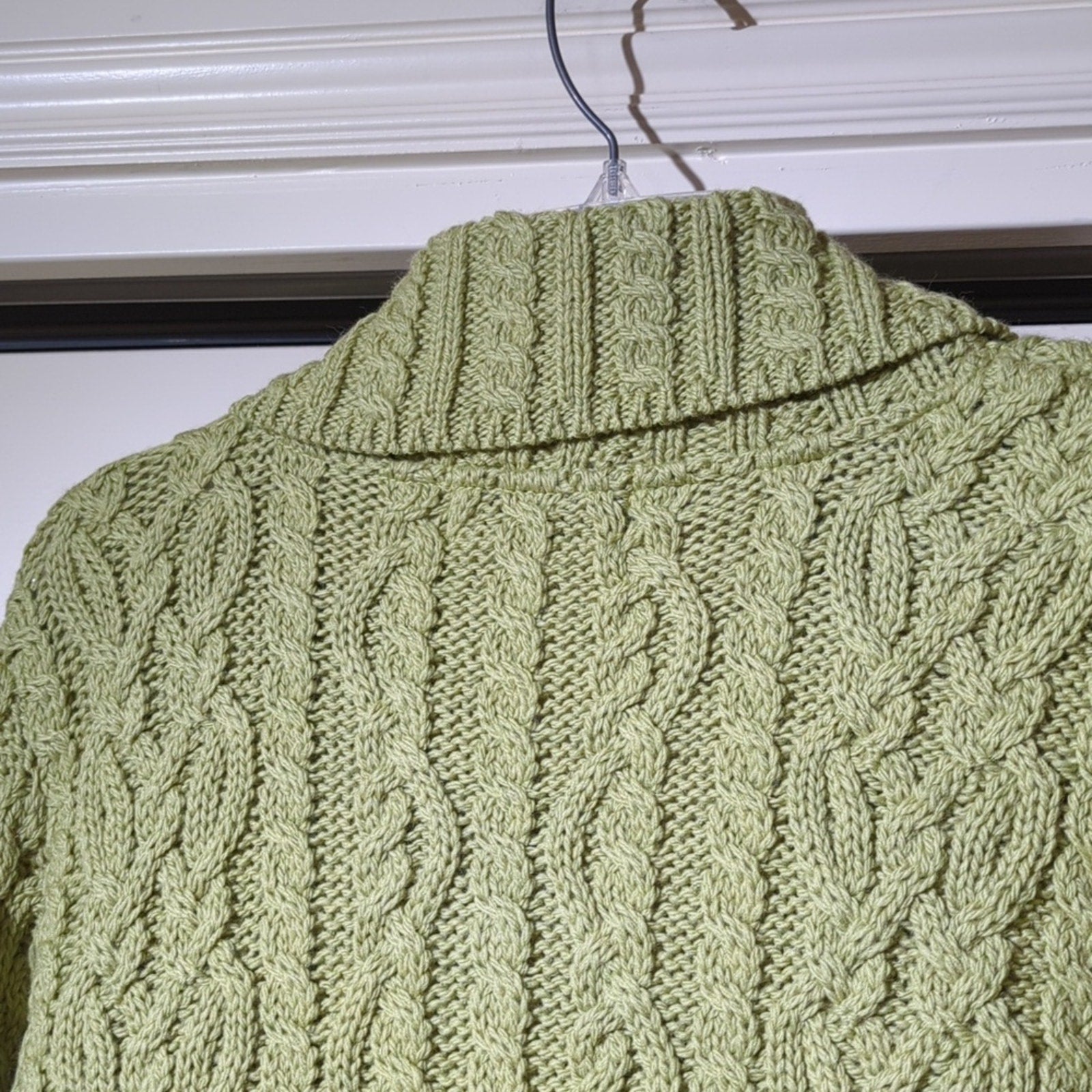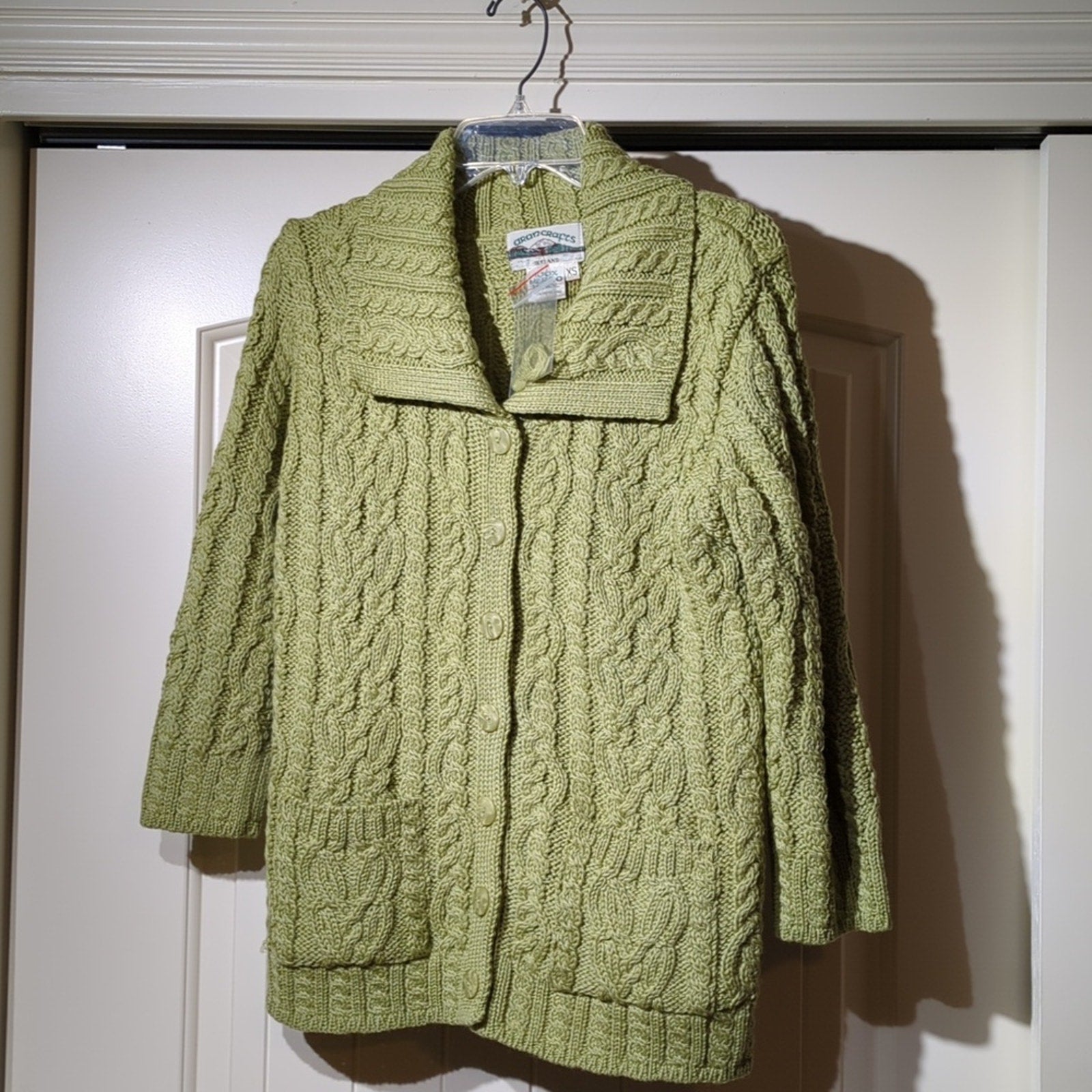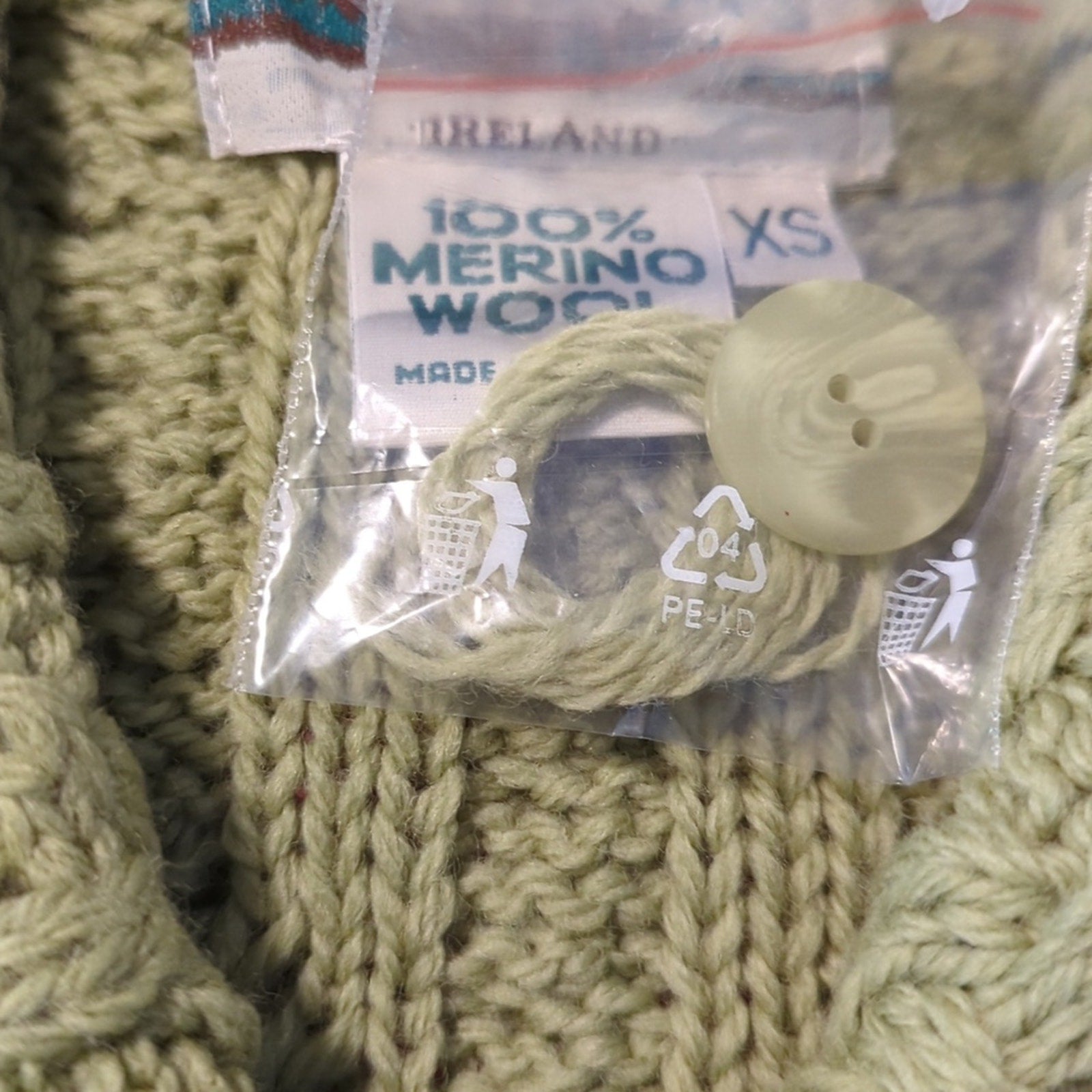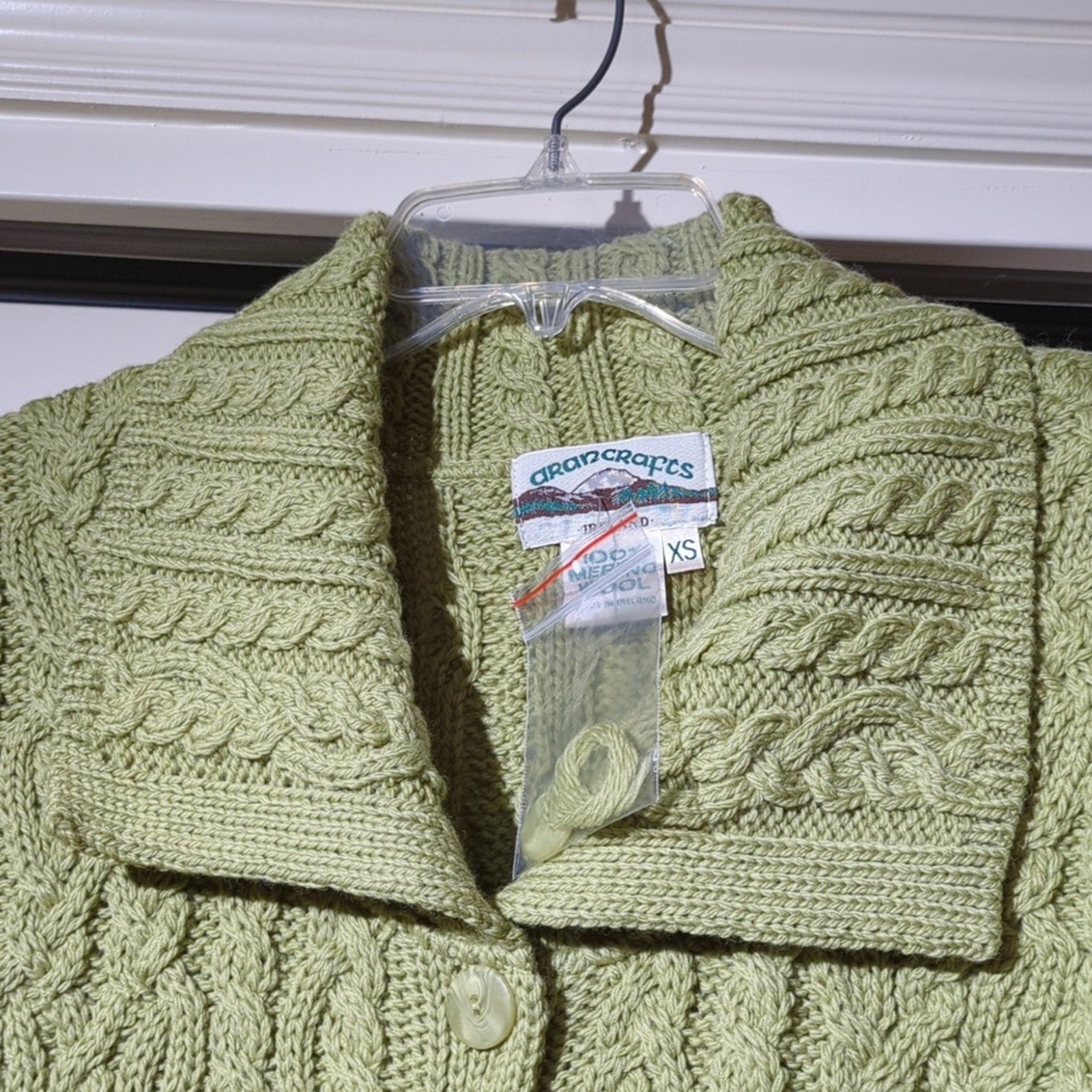 Aran Crafts Ireland NWOT Green Soft Luxury Button Up Hand Knit Cabled Cardigan Women Sz XS. Oversized for an XS, armpit to armpit measures 19". Unbelievably super soft 100% Merino Wool is like no wool you have ever felt. Cabling detail is exquisite. 3/4 length sleeves. Front pockets. Measures 25" long. Sleeves measure 19" from shoulder seam. Beautiful green color. Looks and feel like it is brand new. Still extra button and and extra yarn tag attached.