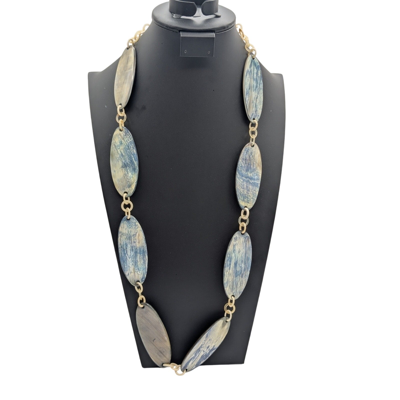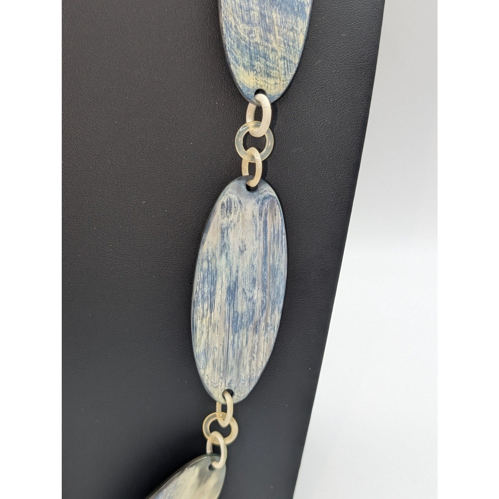 Artisan Created Boho Wood Look Lucite Oval Disk & Loopy Chain 32" Necklace. Really unique, interesting necklace. More of a blue white washed wood look on one side and neutral gray/brown look on the other. Pre-owned, this necklace is in excellent condition.