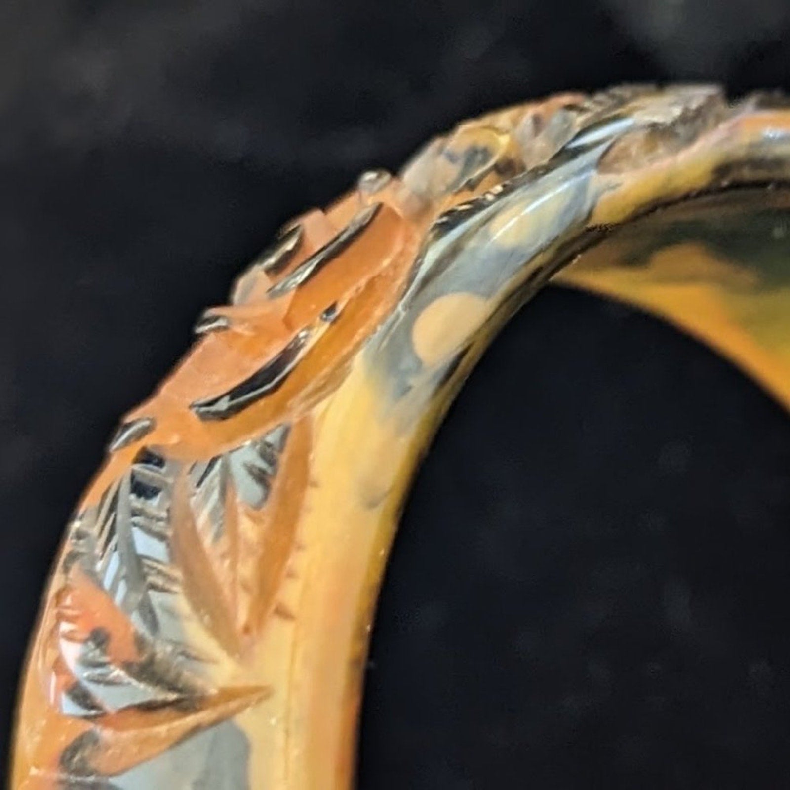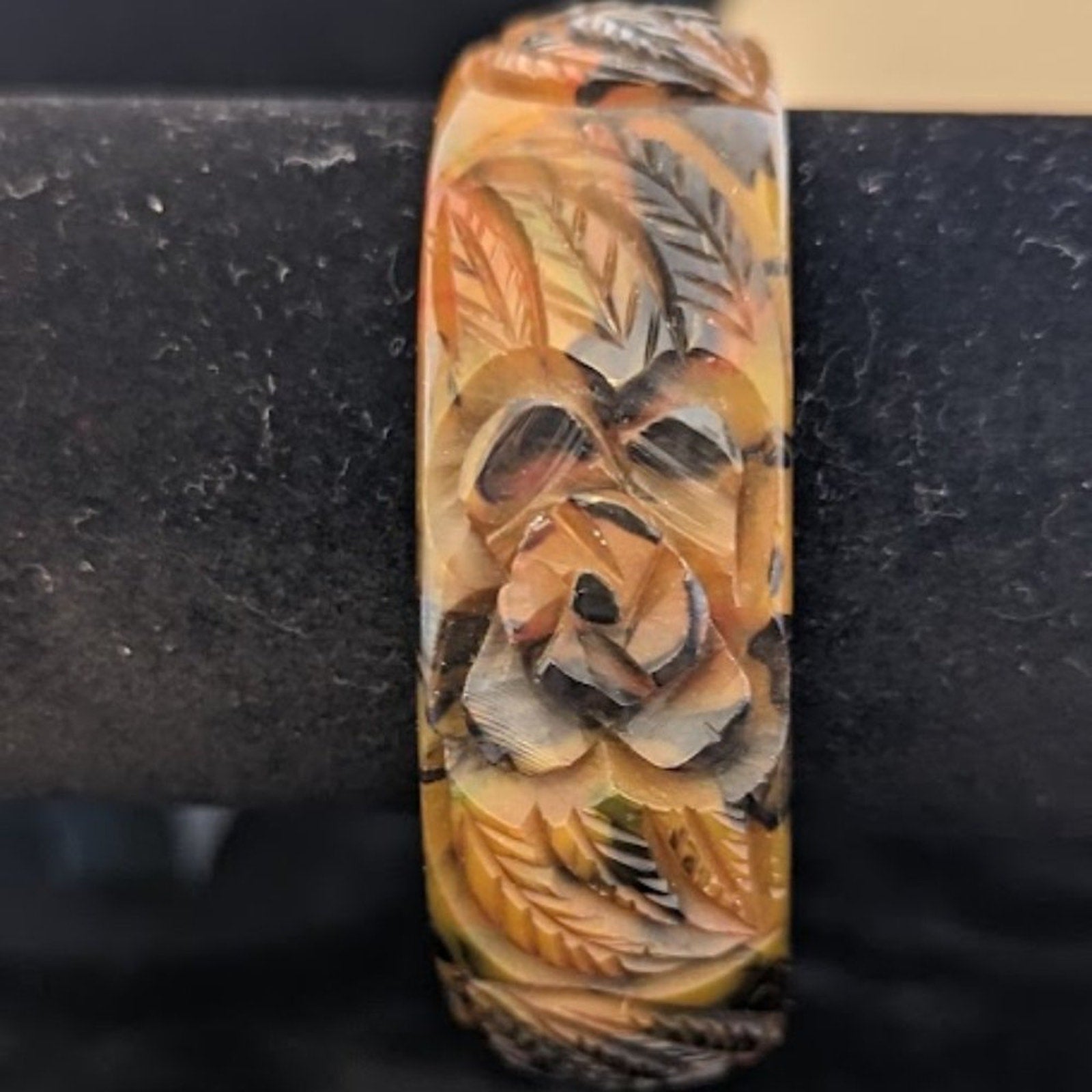 This vintage rare carved end of day translucent bakelite bangle bracelet was given to me in the late 60's by my grandmother who was born in 1905. It has only ever had one owner other than me. It was just recently that I discovered the value of bakelite. The bracelet is carved with roses and leaves around its entirety. The marbled end of day colors are red, orange, black, brown, and green. It is in excellent vintage condition and tests positive for bakelite.