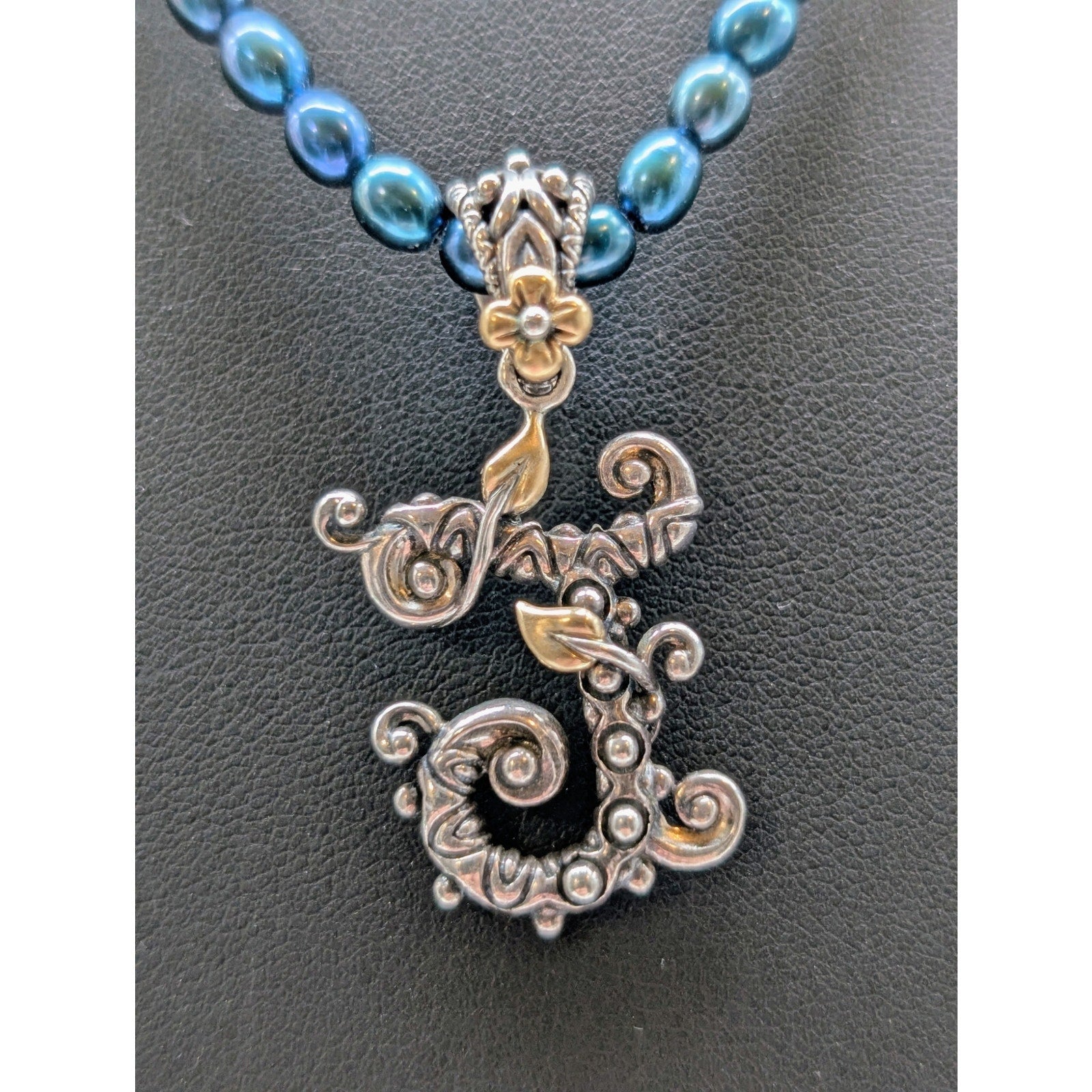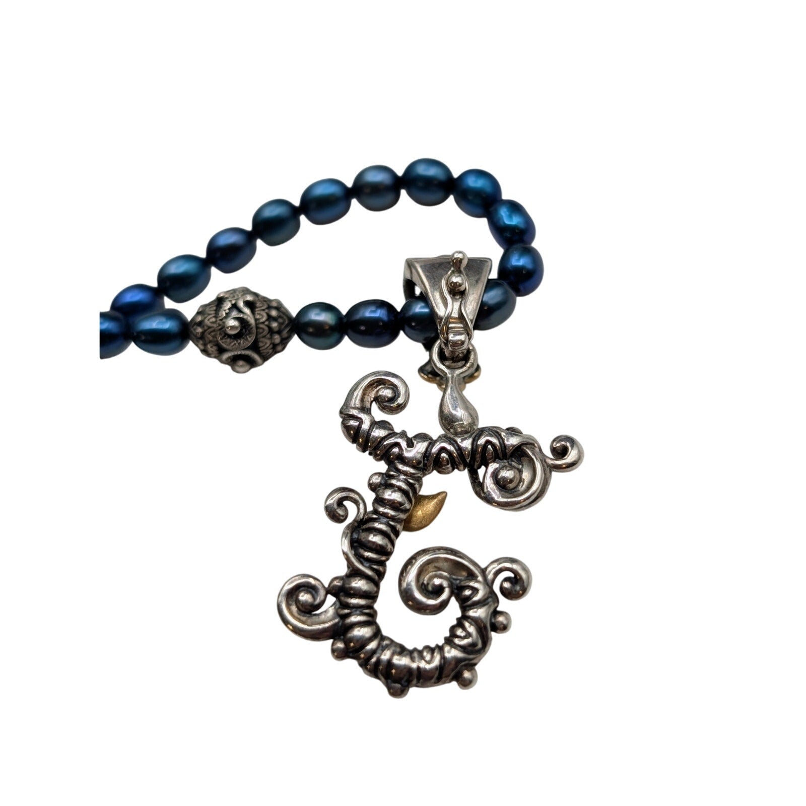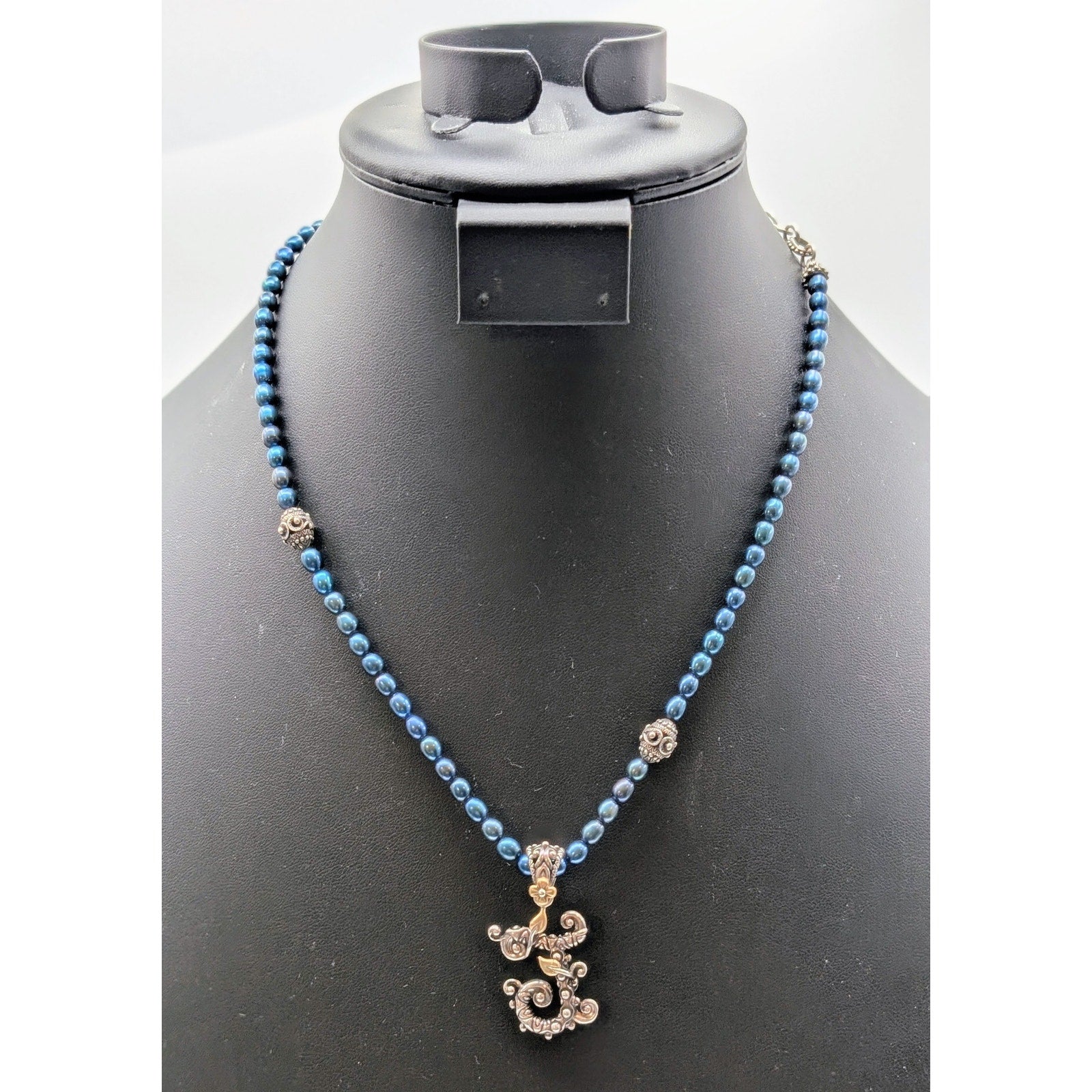 Barbara Bixby Sterling & 18K Gold Initial Letter 'J' Removable Enhancer Pendant Blue Freshwater Pearl Necklace 27.9 grams. Measures 16"-20" with extender chain. Hook clasp. Pre-owned, this necklace is in excellent condition.