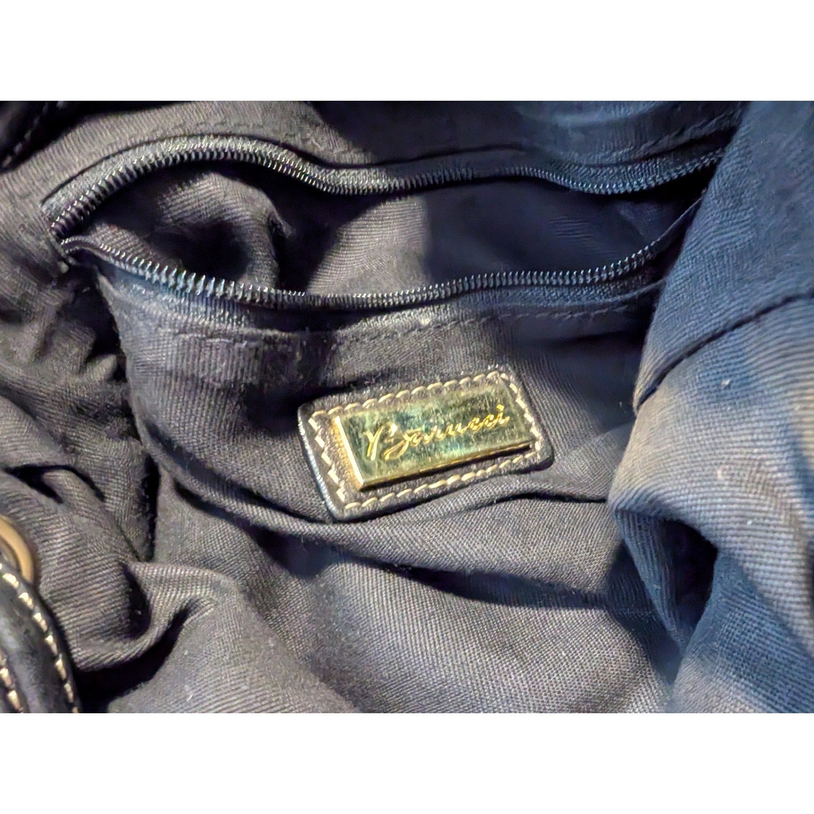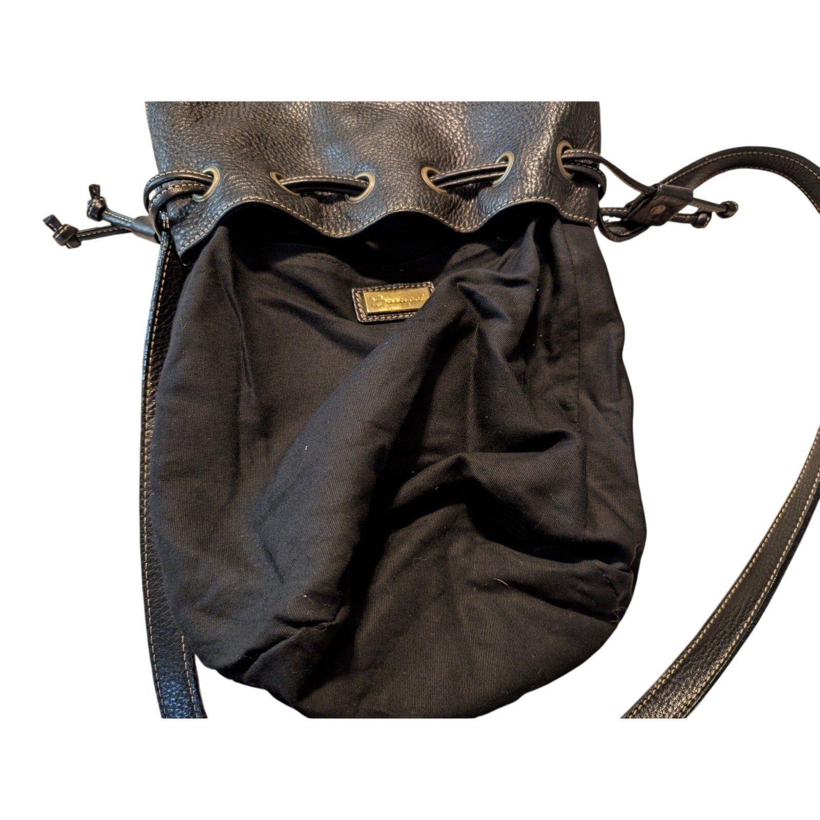 Barucci Leather Crossbody Drawstring Bucket Handbag. Pre-owned, this bag is in great condition except for a little bit of issues on the strap as seen in the last photo. I would put some black shoe leather dye on it, and I think it would be fine. Bag measures 7.75"L x 7"D x 9.5"H. This was sold to me as black. It is either black or a very, very dark brown.