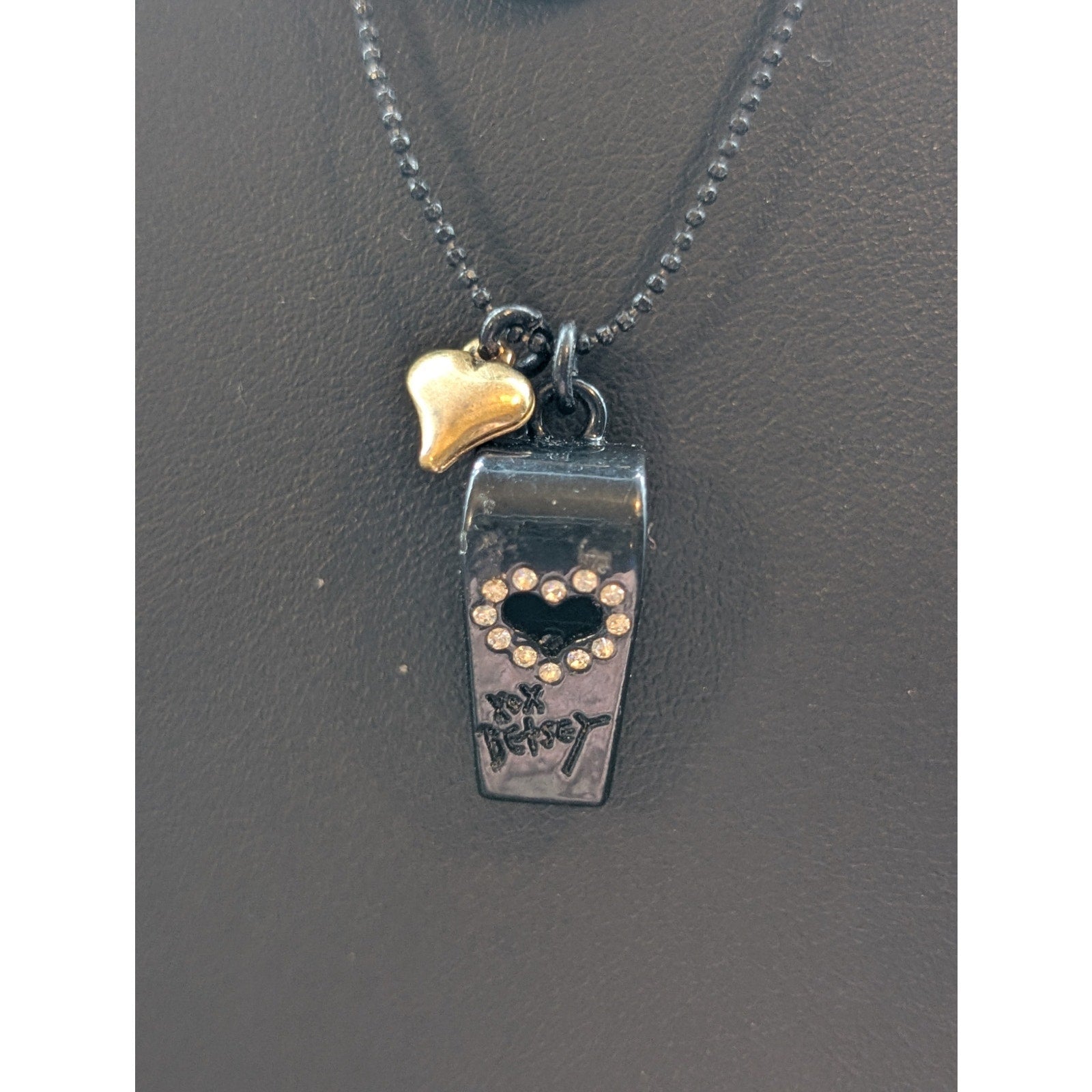 Betsey Johnson Black Gold Rhinestone Whistle Lips Heart Double Strand 16"-19" Necklace. Double strand black bead ball chain. Pre-owned, this necklace is in excellent condition.