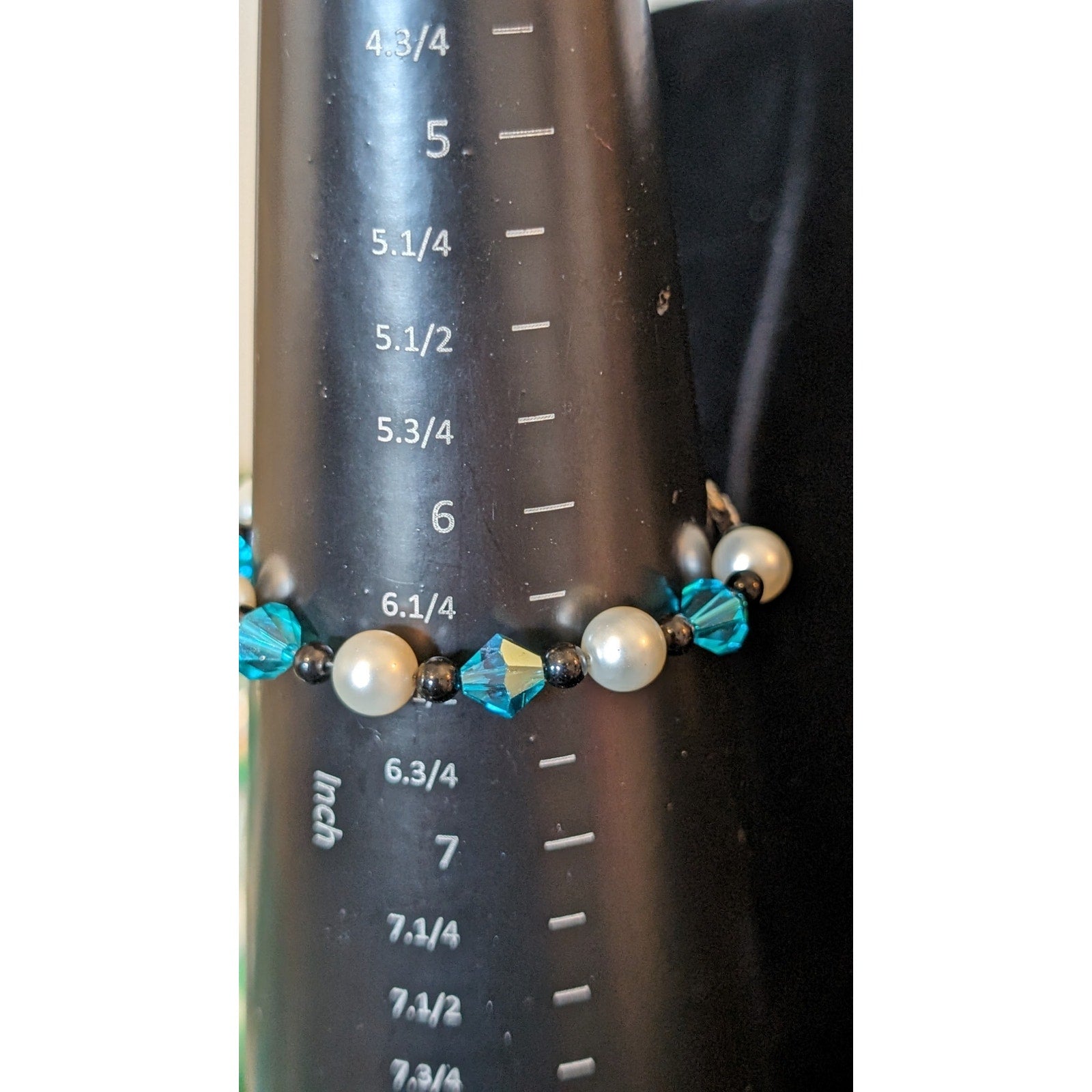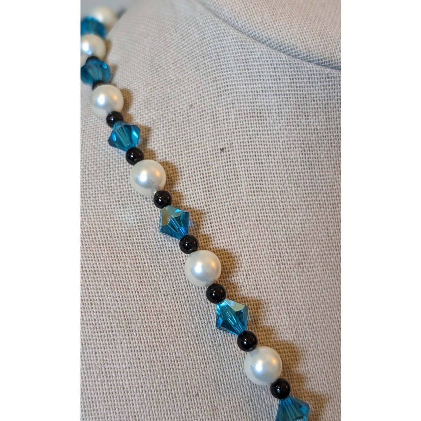 Blue Crystal Bicone, Black Glass & Pearl Bead Necklace & Bracelet Set. Necklace measures 20" long and bracelet 7". Pre-owned, this set is in excellent condition. Minimal wear on clasps.