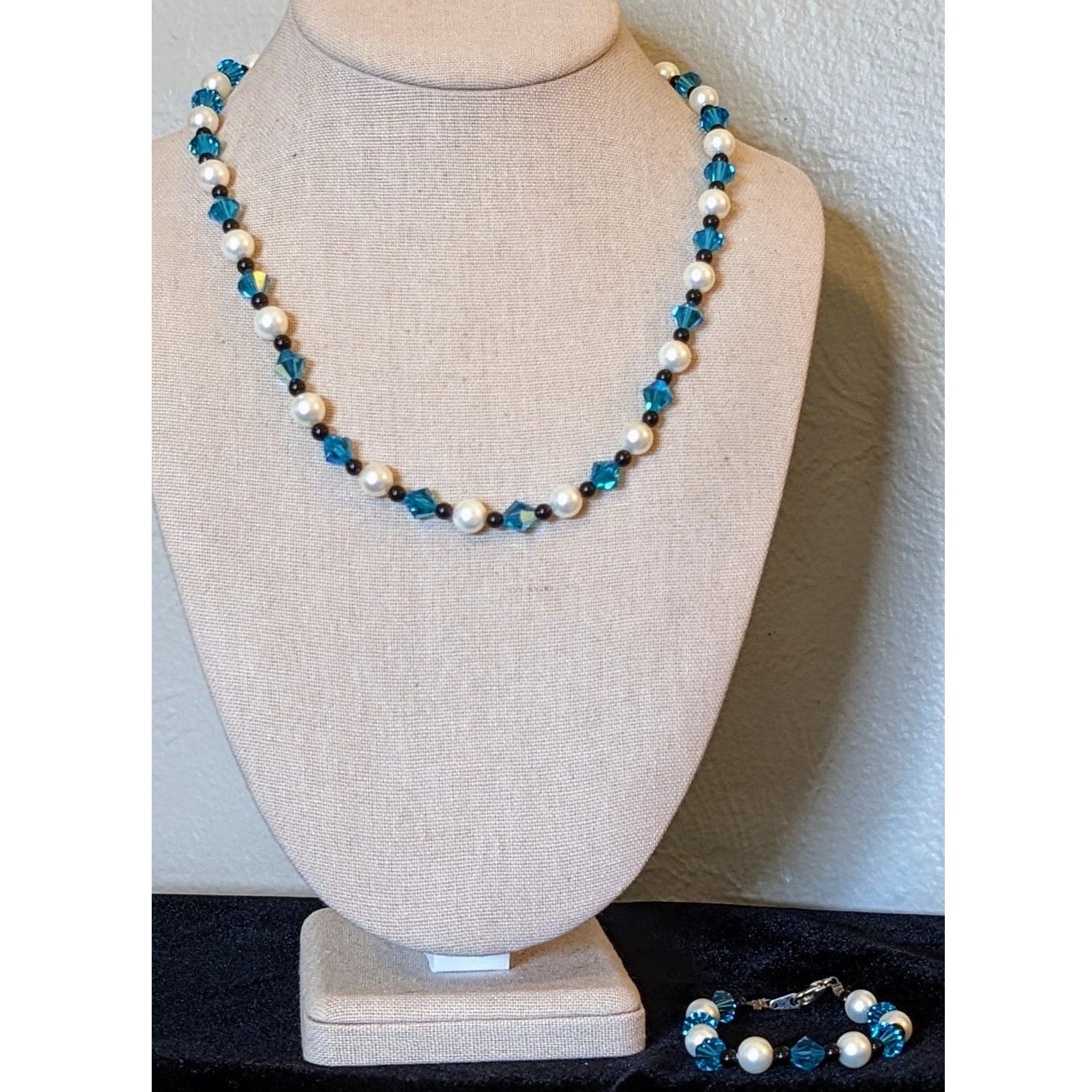 Blue Crystal Bicone, Black Glass & Pearl Bead Necklace & Bracelet Set