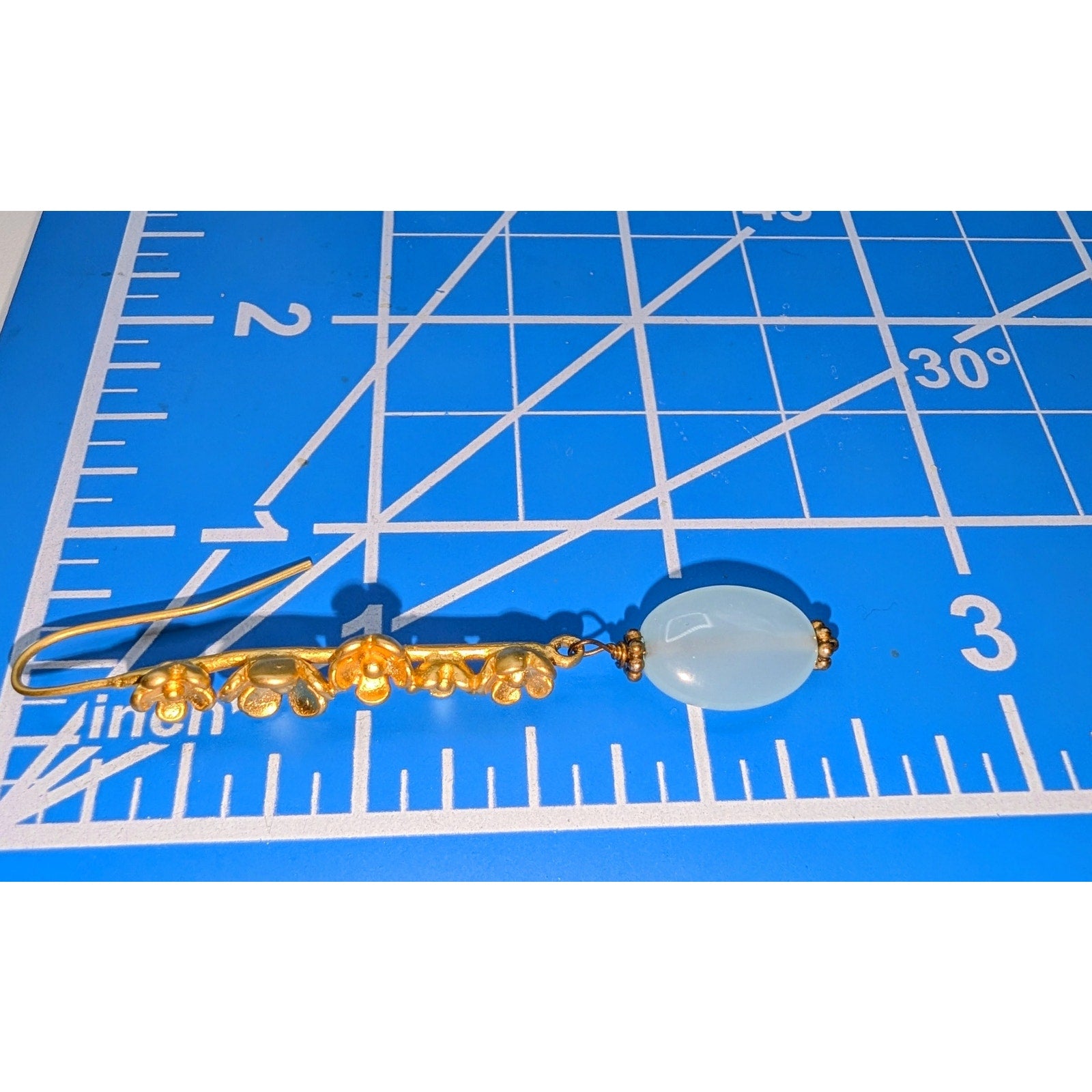 Brushed Gold Tone Flower Drop Chalcedony Glass Bead Pierced Earrings. Sweet earrings. Pre-owned, these earrings are in excellent condition. Often, my photos are enlarged to show detail on jewelry pieces. See measurement board for accurate size. Photos are part of the description.
