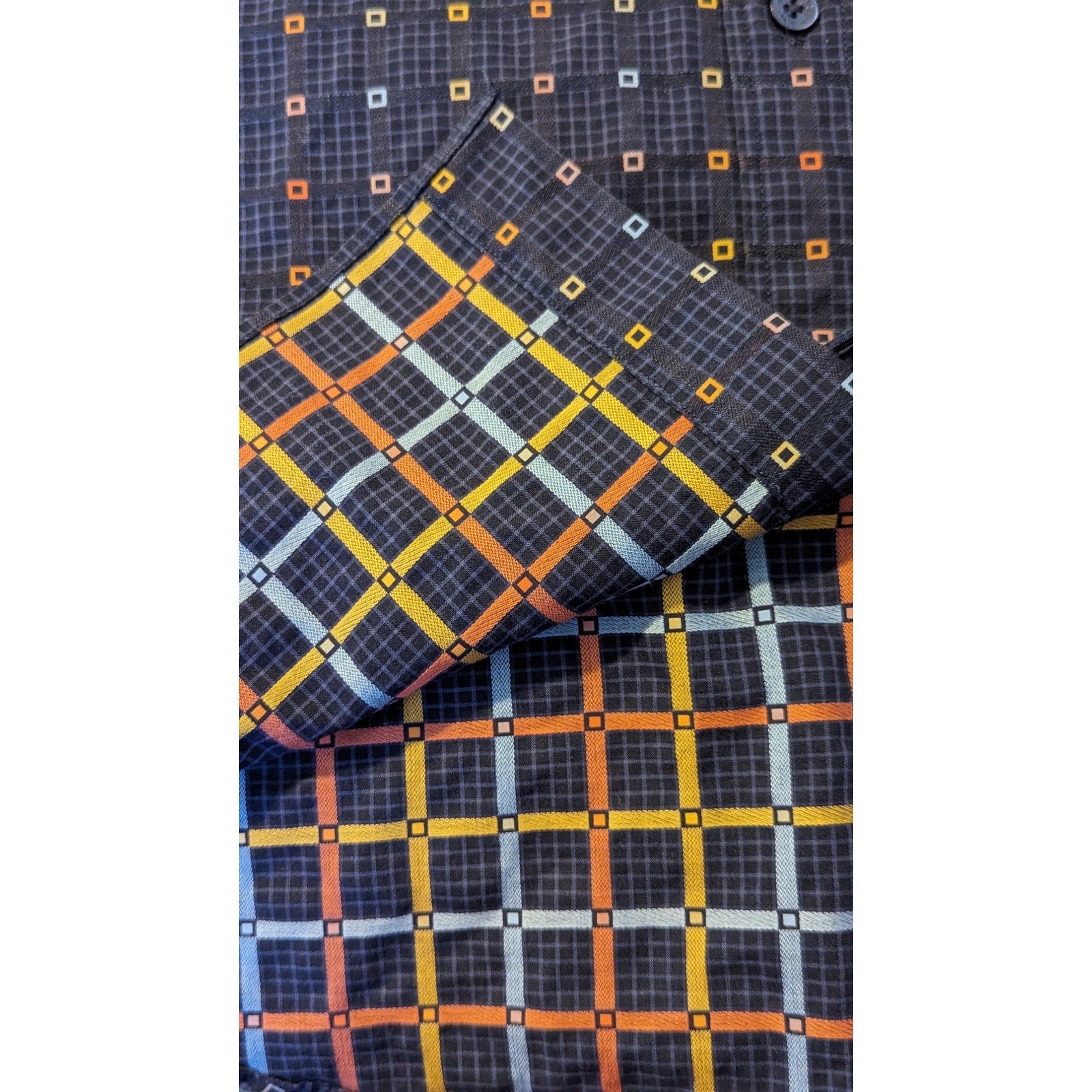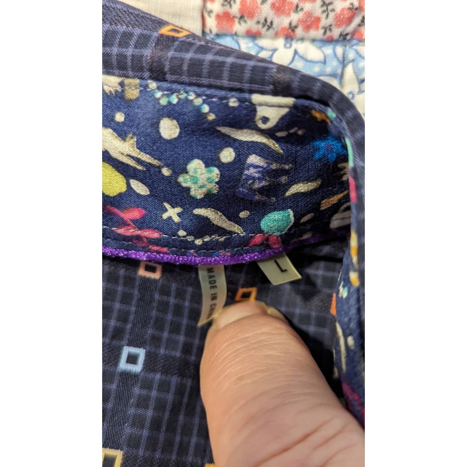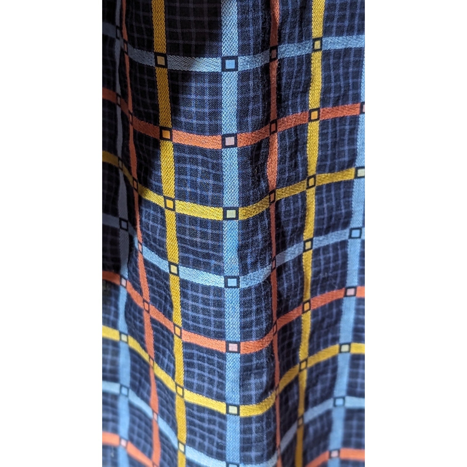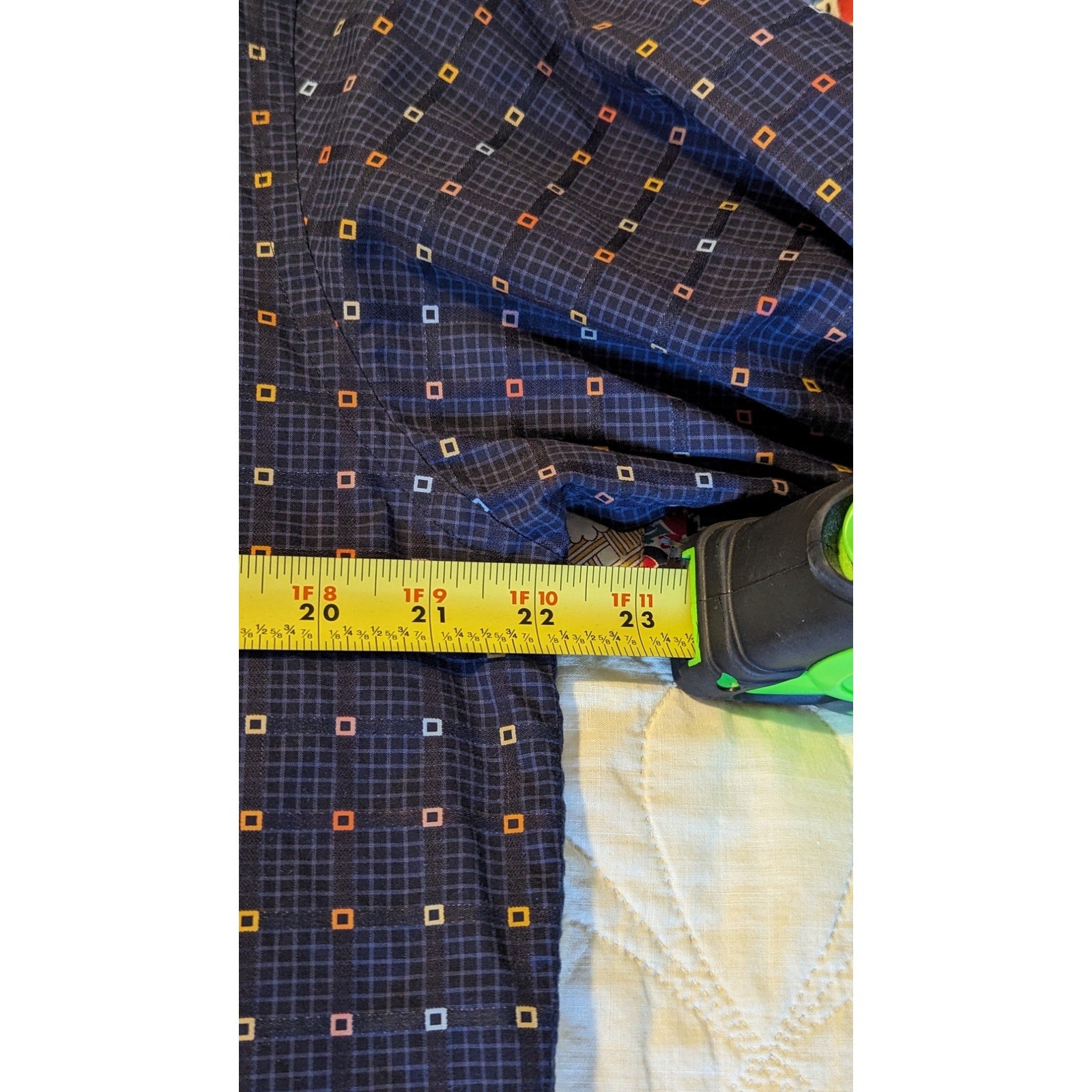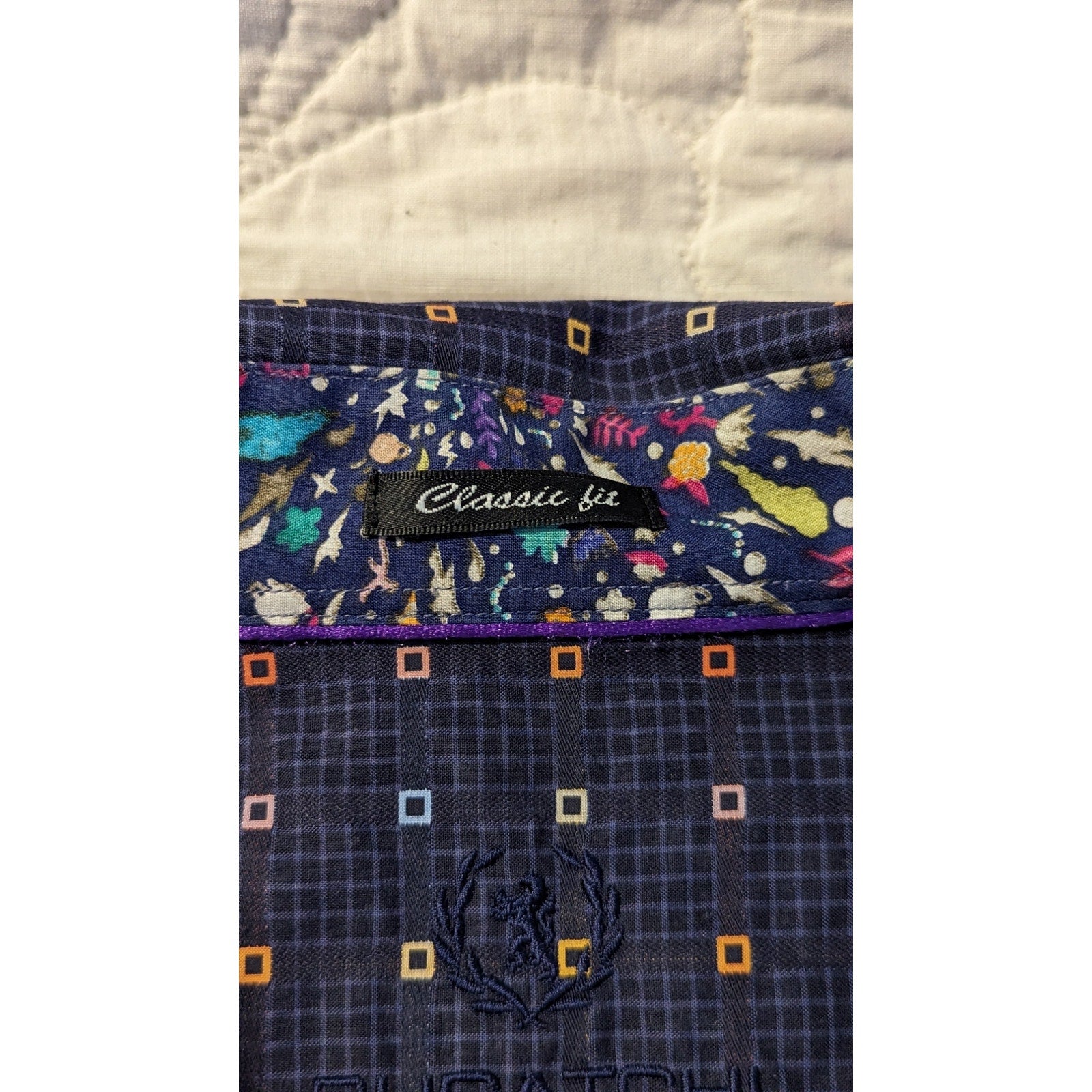 Bugatchi Uomo Men's Blue Check Long Sleeve Button Down Shirt Size L. Measures 30" long. 100% cotton. Pre-owned, this shirt is in excellent condition. Colorful and so much fun. Three different patterns inside, outside and colllar.