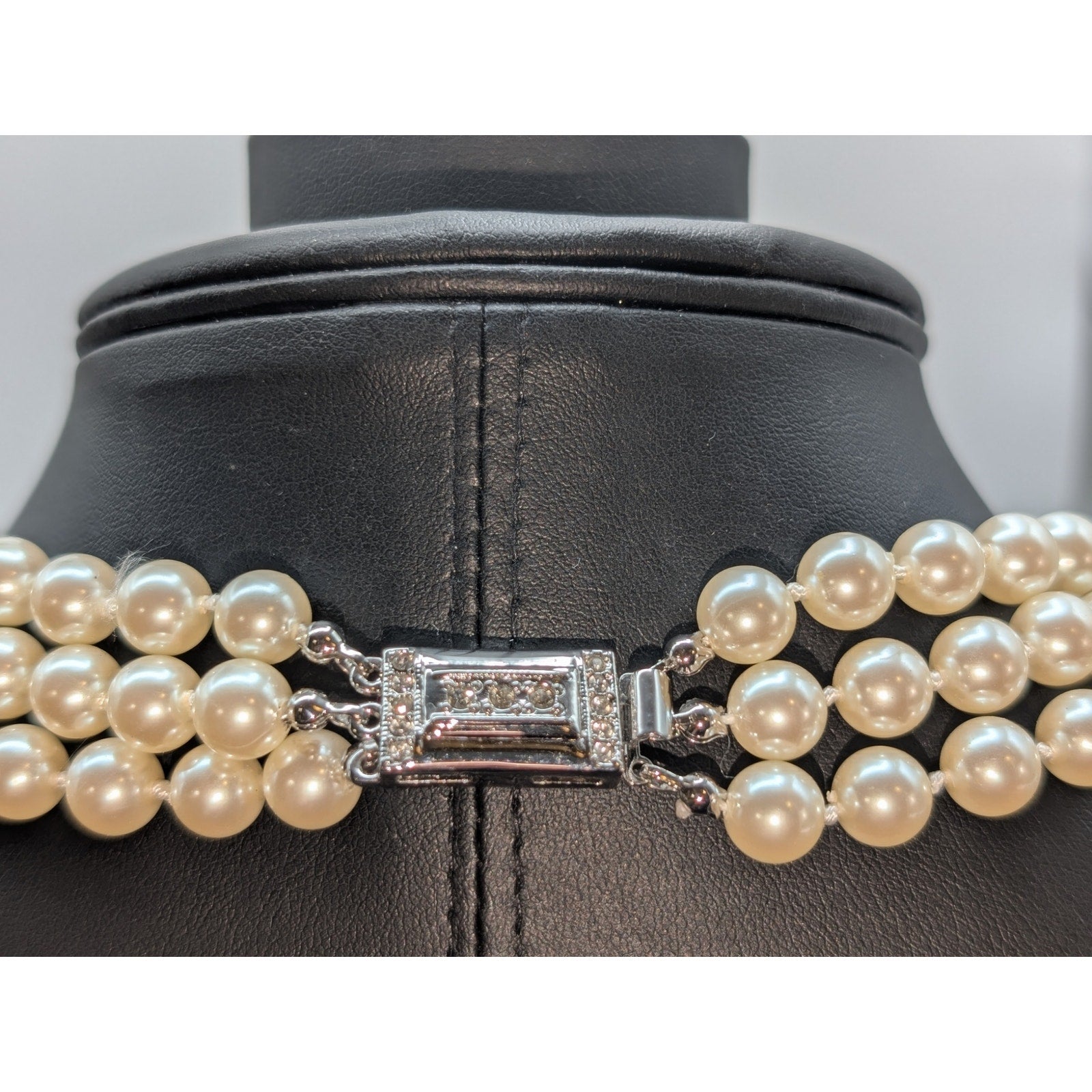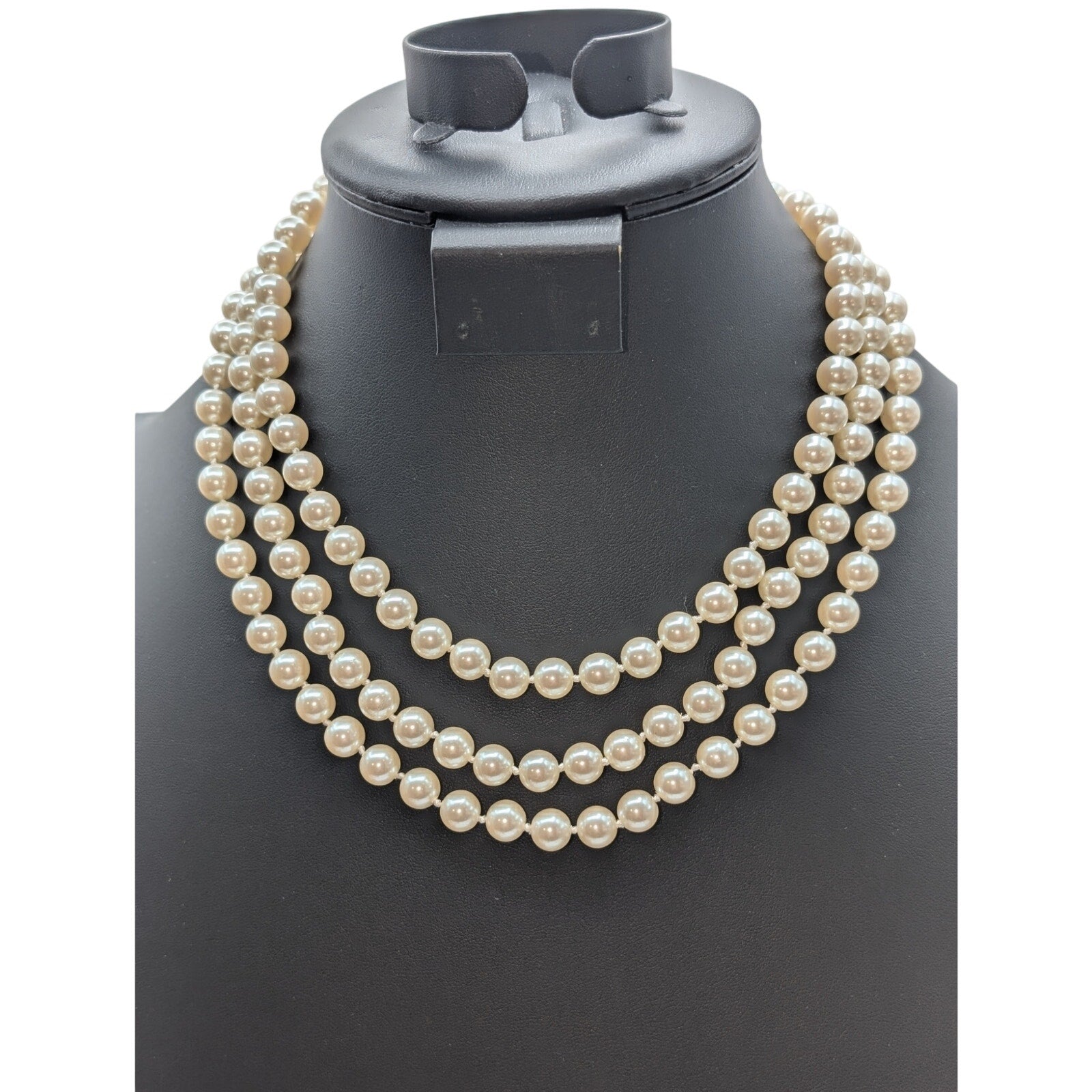 Carolee Three Strand Faux Pearl Fancy Clasp Slide In 17" Necklace. Shortest strand is 17" around the neck. Really nice set of glass faux pearls. Pre-owned, this necklace is in excellent condition.