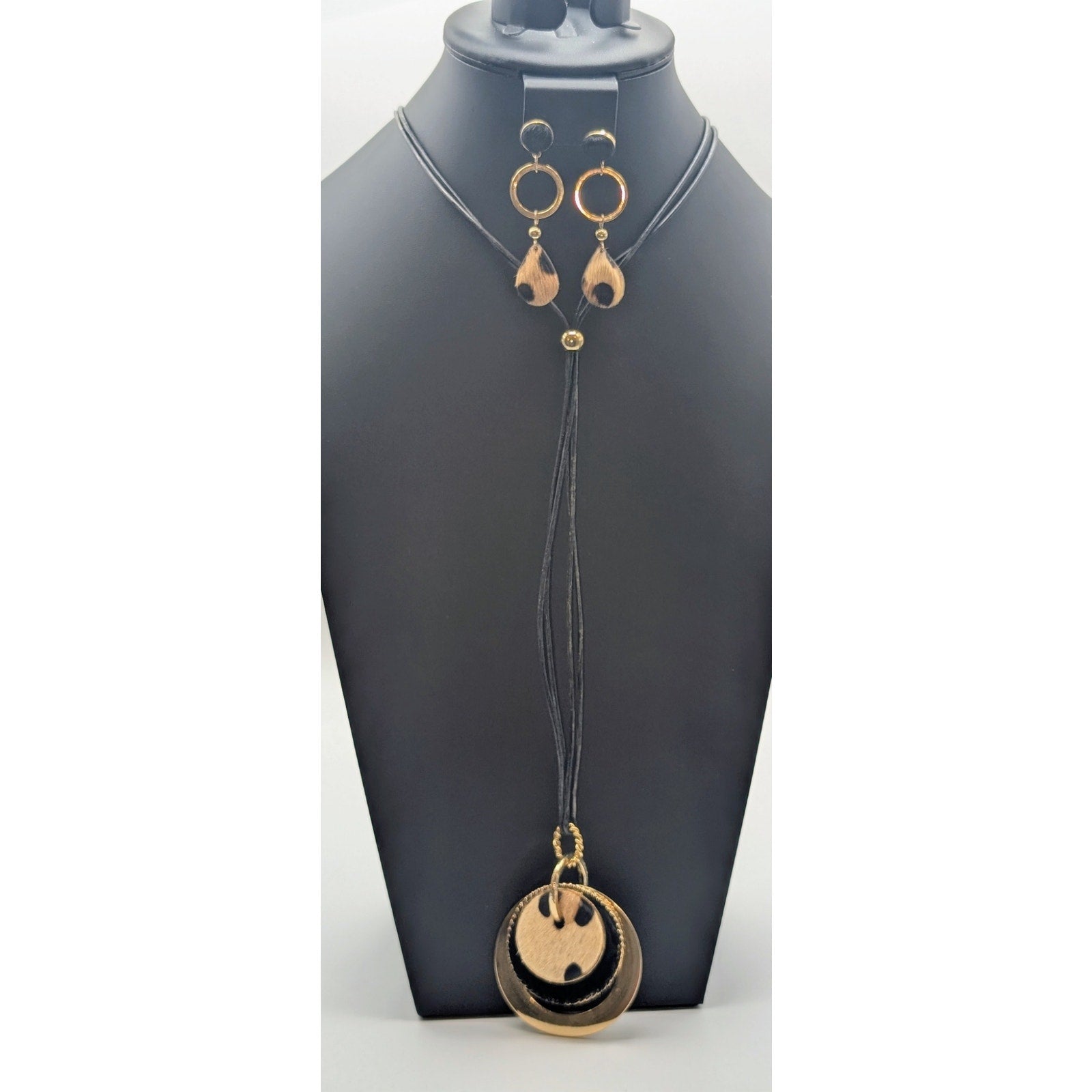 Chico's Black Adjustable Corded Gold Tone Animal Fur Pendant Necklace & Earrings