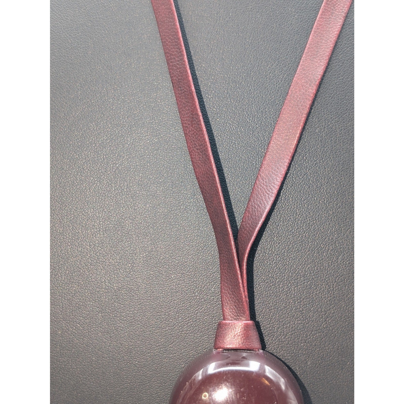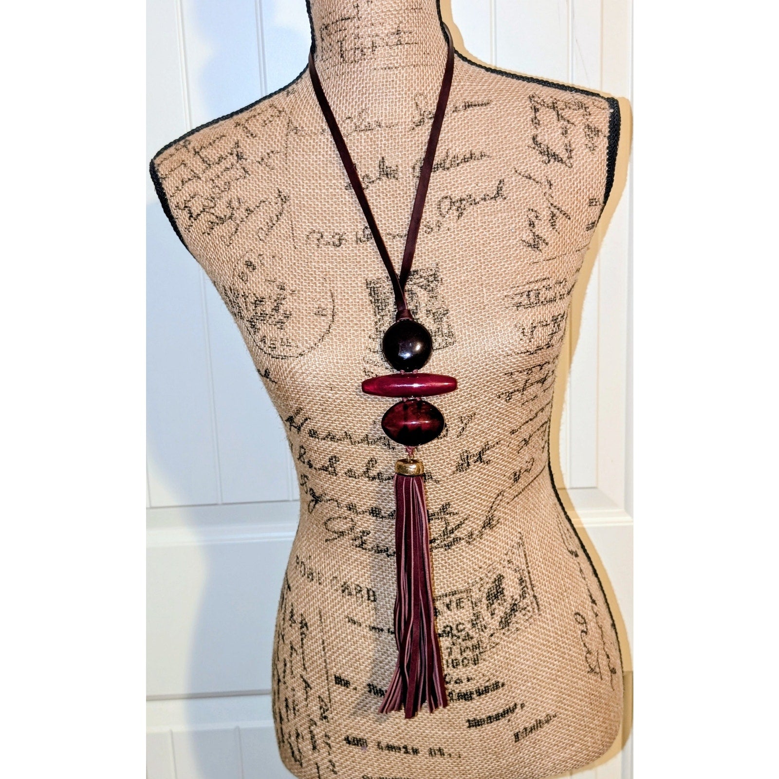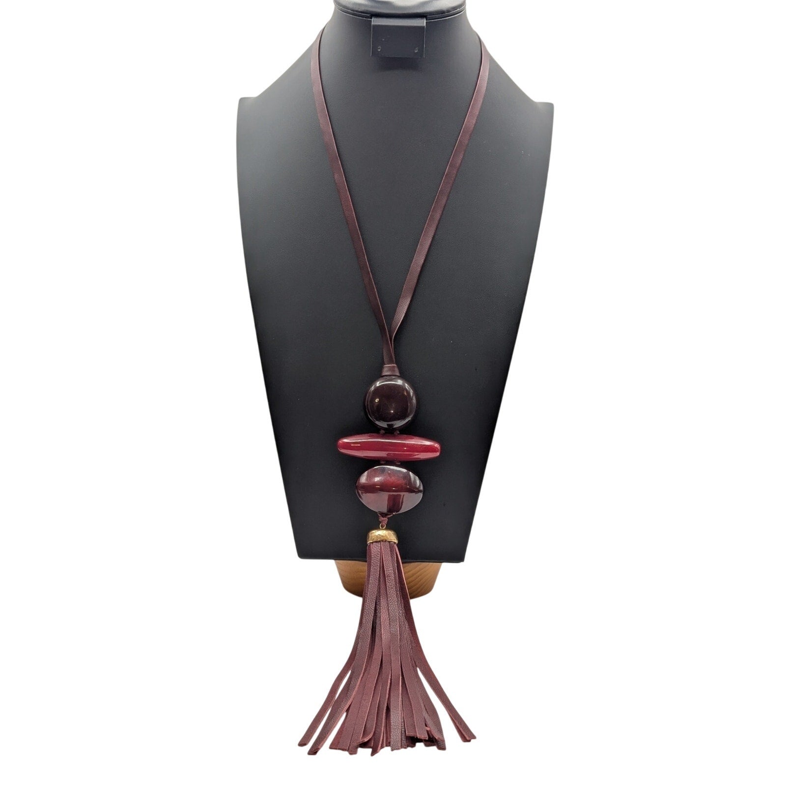 Chico's Chunky Burgundy Lucite Tassel Necklace. Necklace measures 24" around the neck with a 4.25" extender chain. Tassel measures approximately 8" long. Pre-owned, this necklace is in excellent condition.