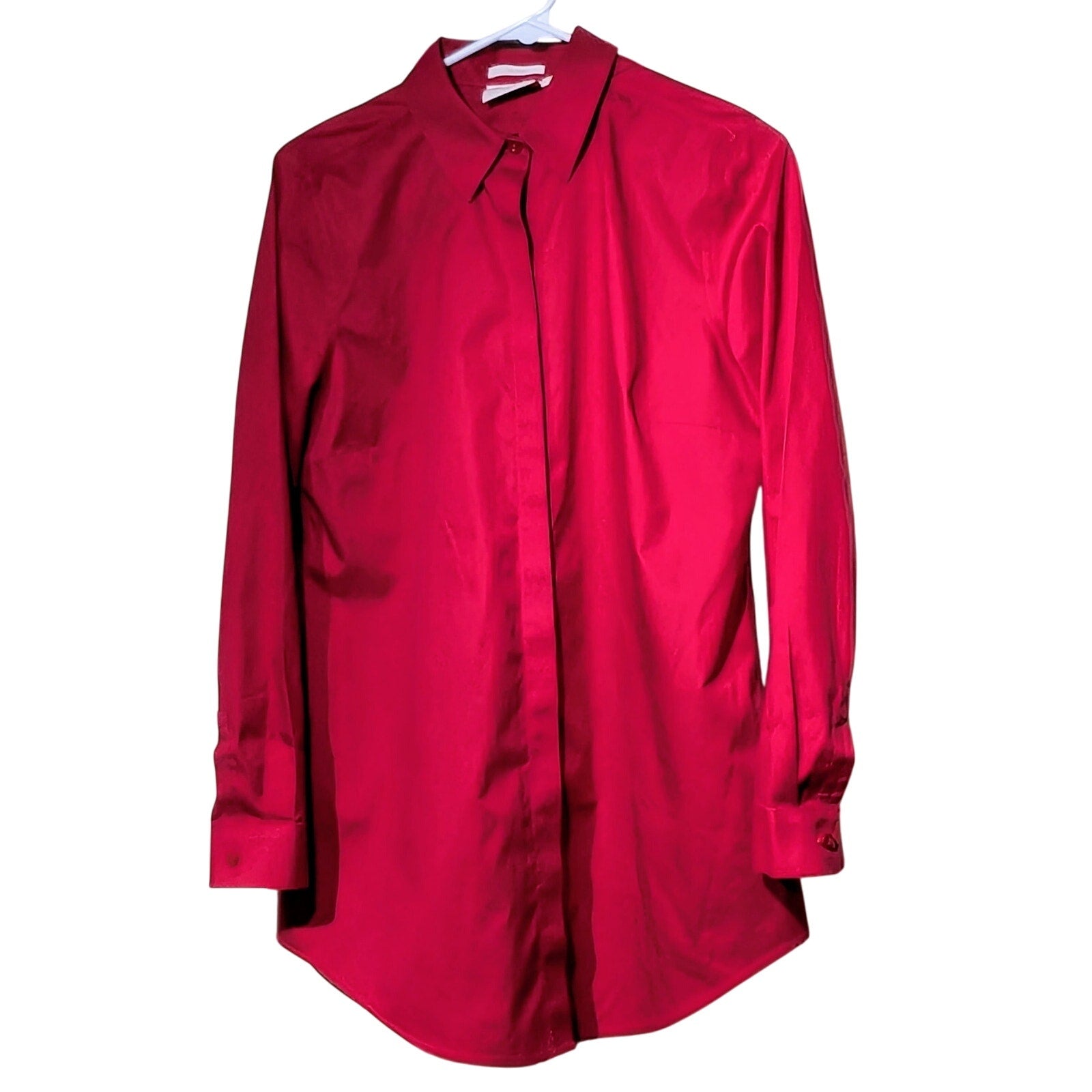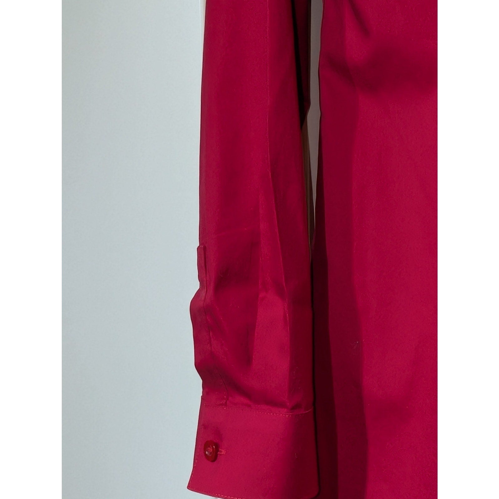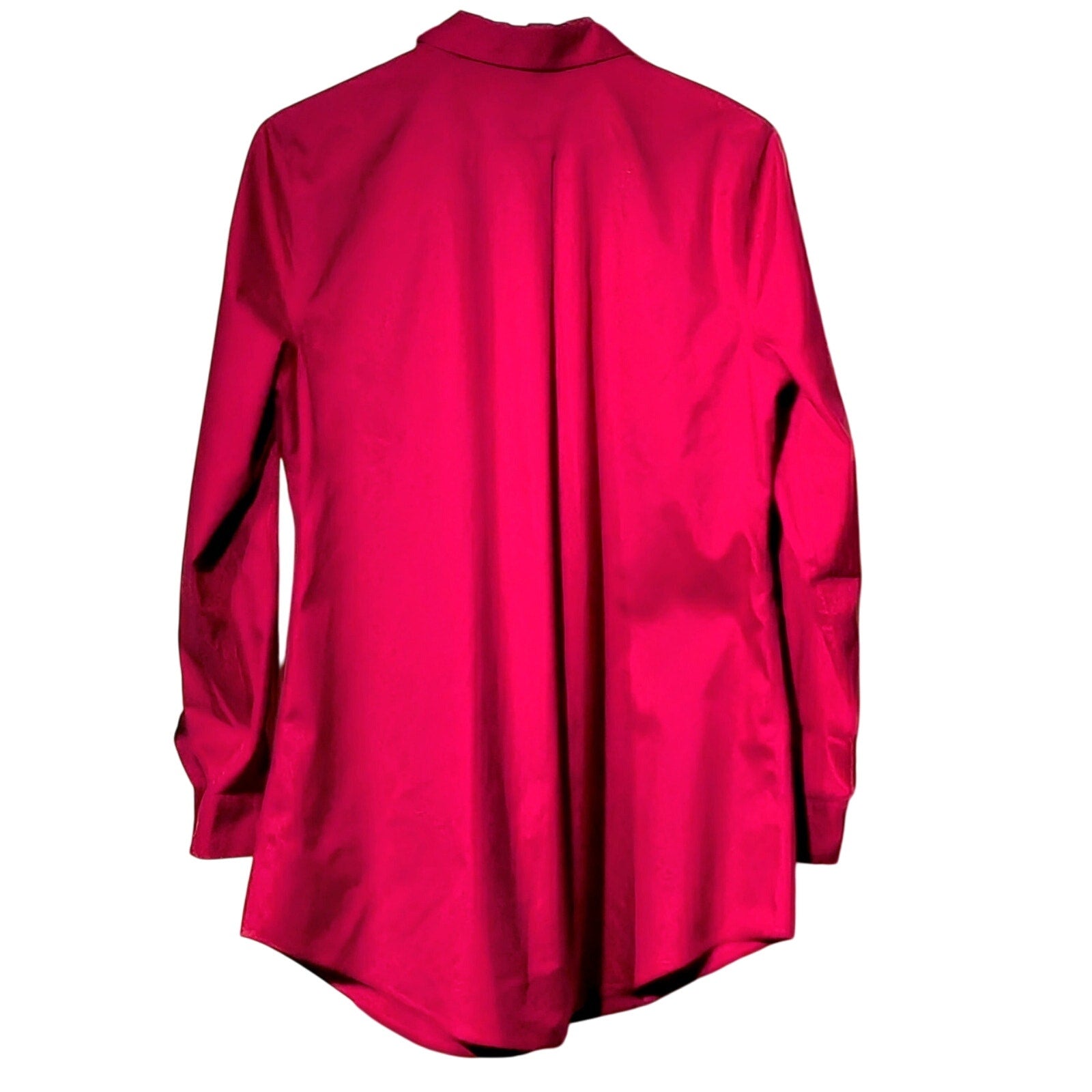 Chico's No-Iron Deep Pink Button Front Curved Hem 100% Cotton Shirt Size S/4. Chico's Sizing 0. Pre-owned, this shirt is in excellent condition. Measures 30.5" long. This is a deep dark pink, not red. Hidden button placket.