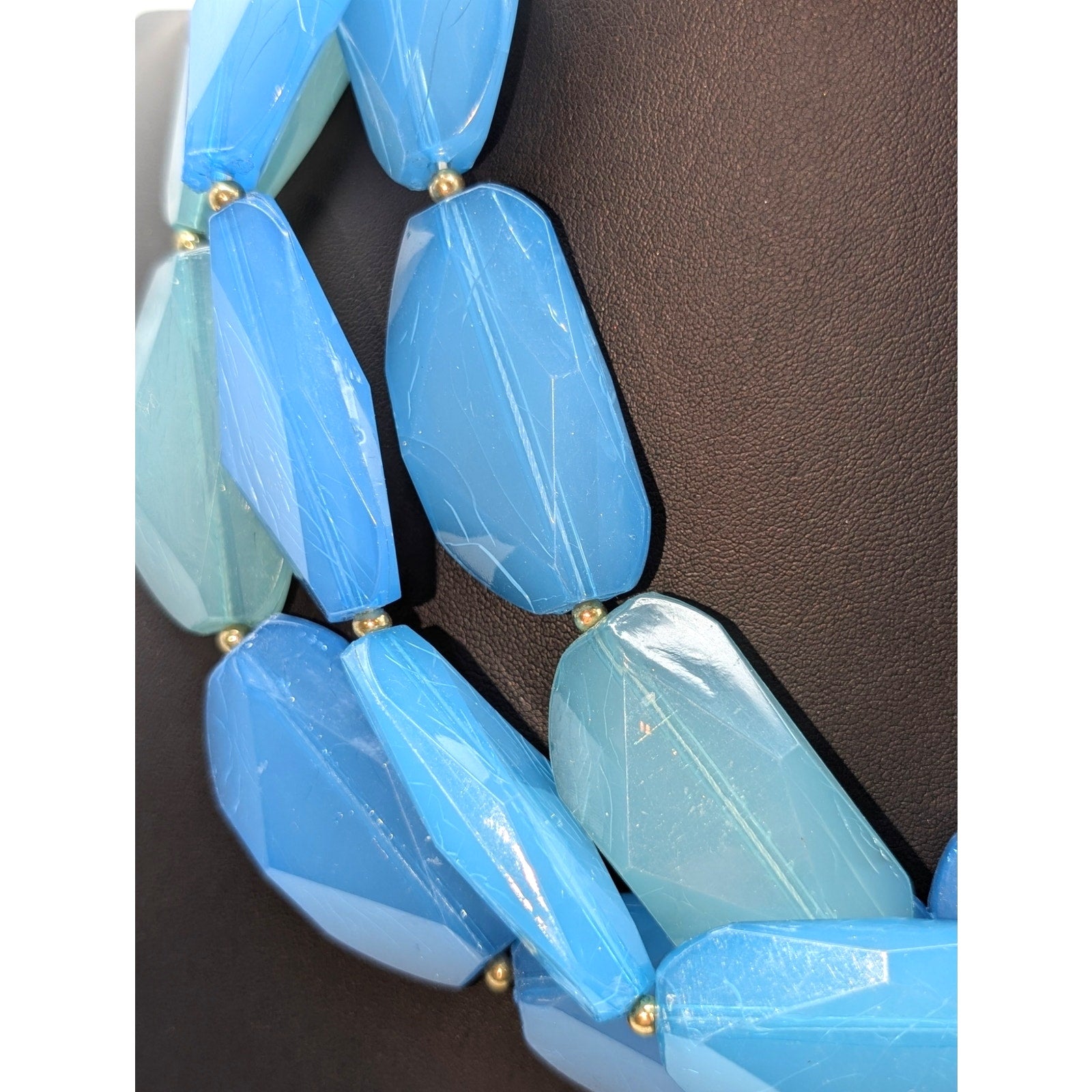 Chunky Three Strand Blue Green Acrylic/Lucite Beaded Statement 18"-23" Necklace. Pre-owned, this necklace shows minimal wear on the chain area. Otherwise, it is in great condition.