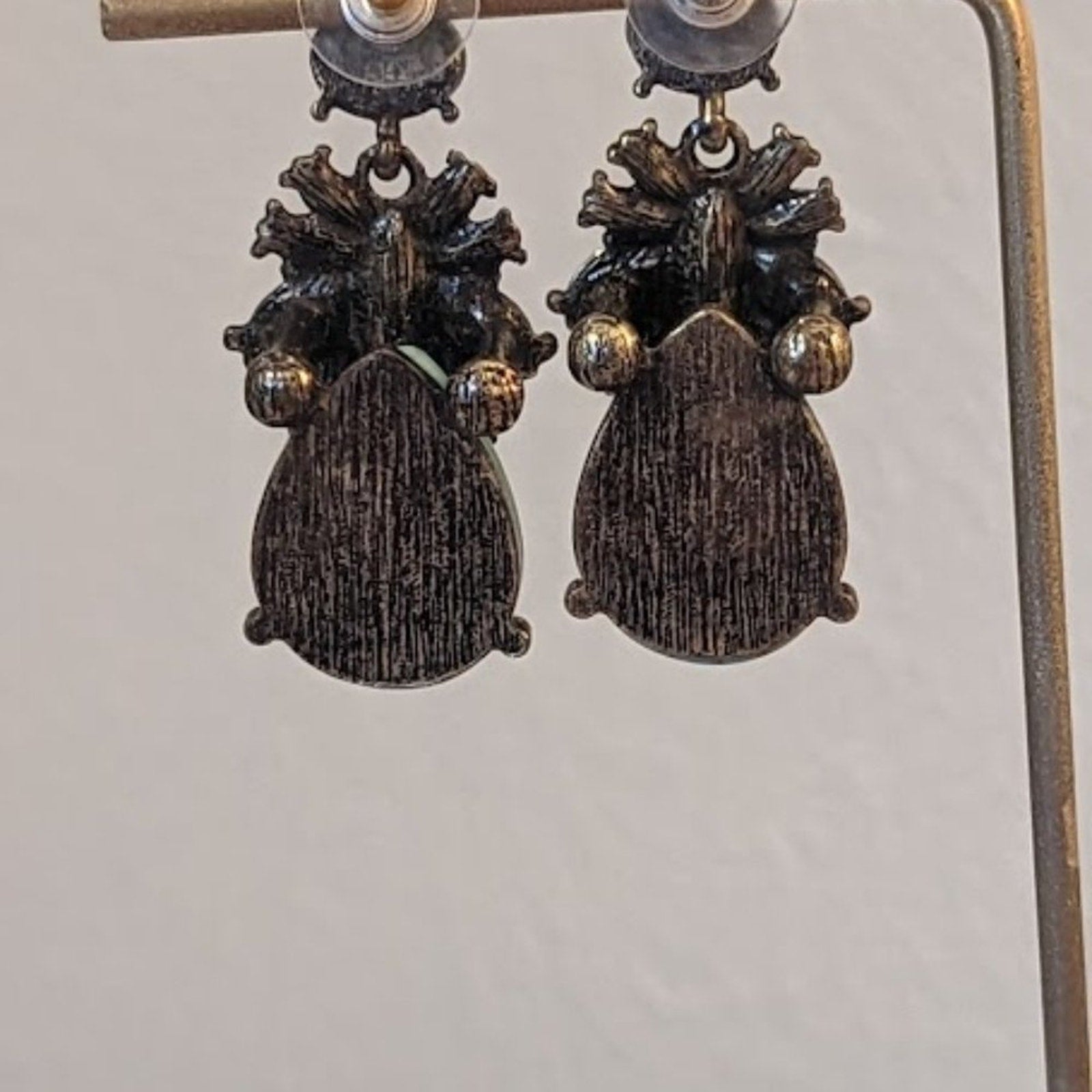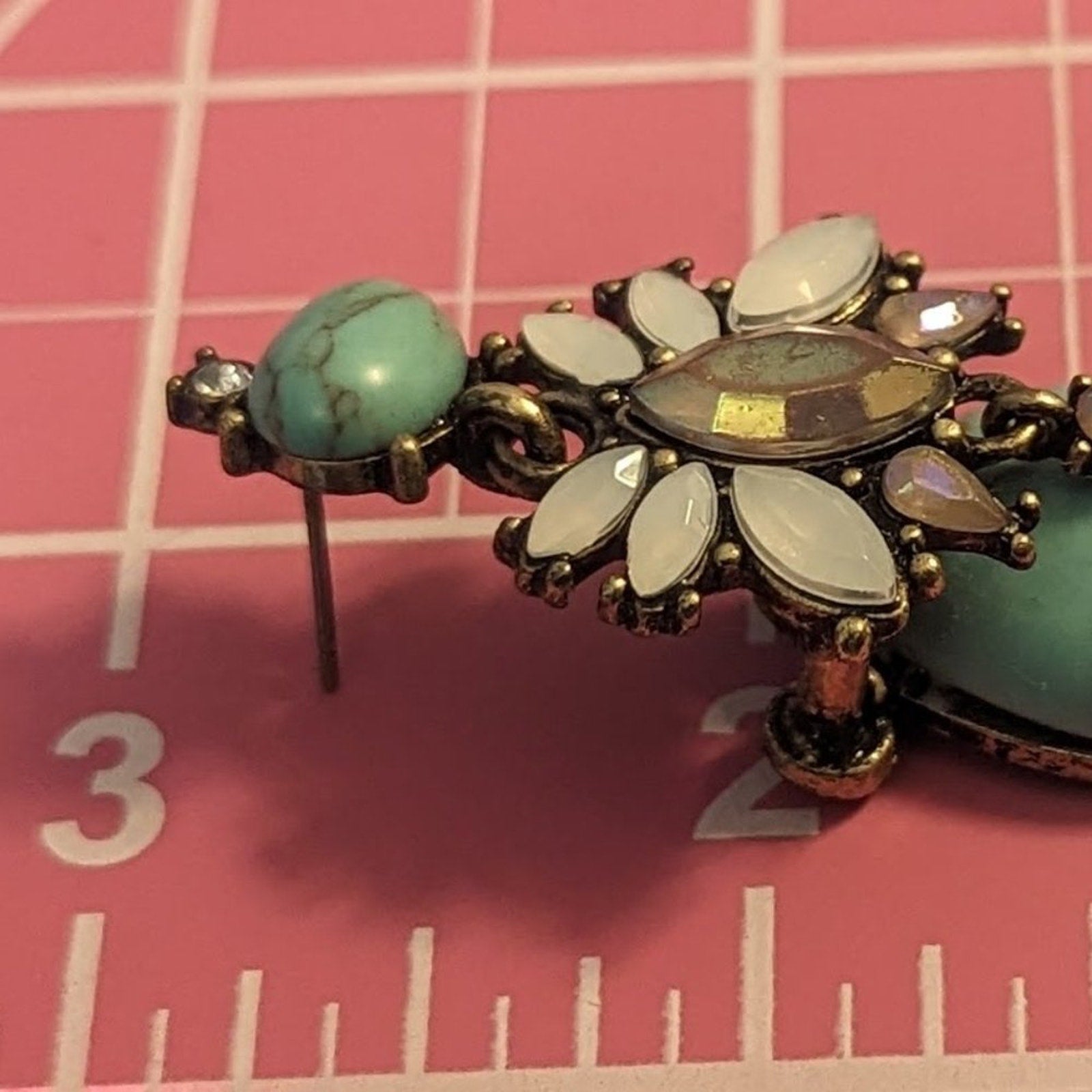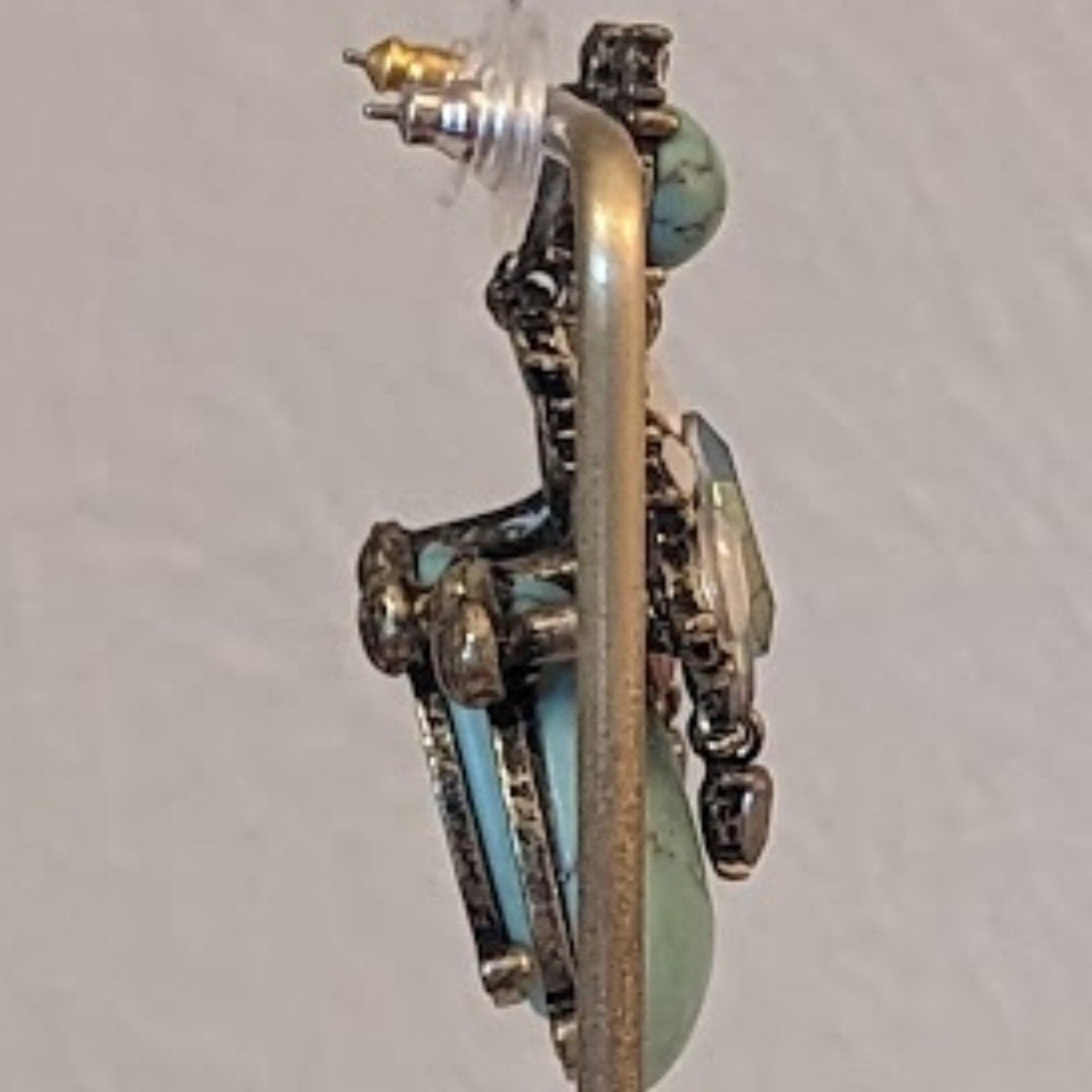 Beautiful Chunky Turquoise dyed Howlite and crystal statement post earrings are well made and substantial pieces of jewelry to add to your fine costume jewelry collection. AB marquis cut crystal in the center and opalescent marquis cut crystals all around with a little dangle AB crystal just because. Really nice earrings. Pre-owned, these are in great condition.