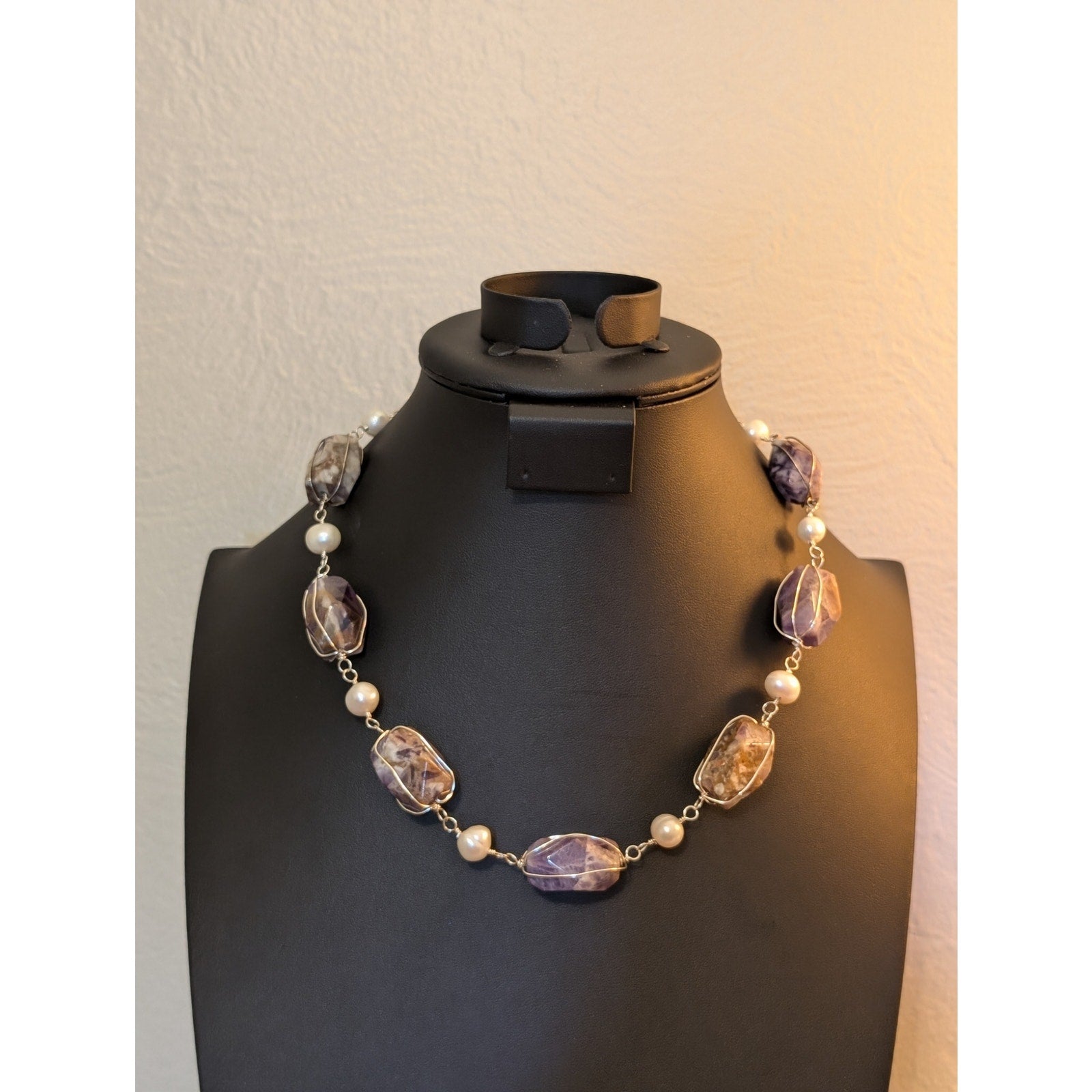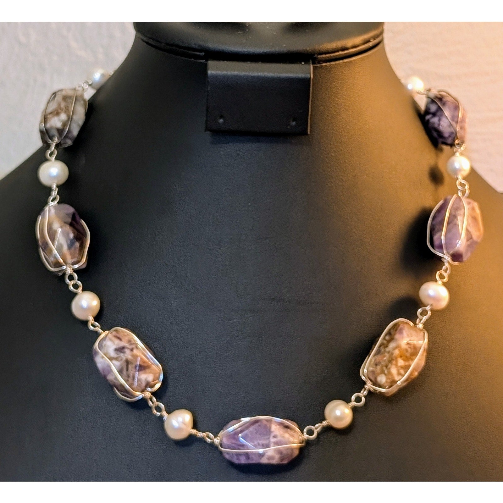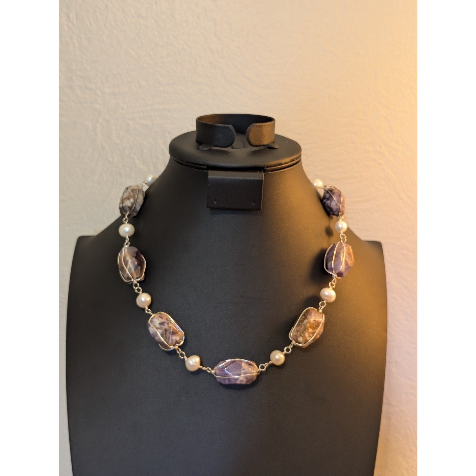 Chunky Wired Purple Lace Agate & Amethyst Fresh Water Pearl Sterling Necklace. Measures 20-21.5" long. Pre-owned, this necklace is in excellent condition.