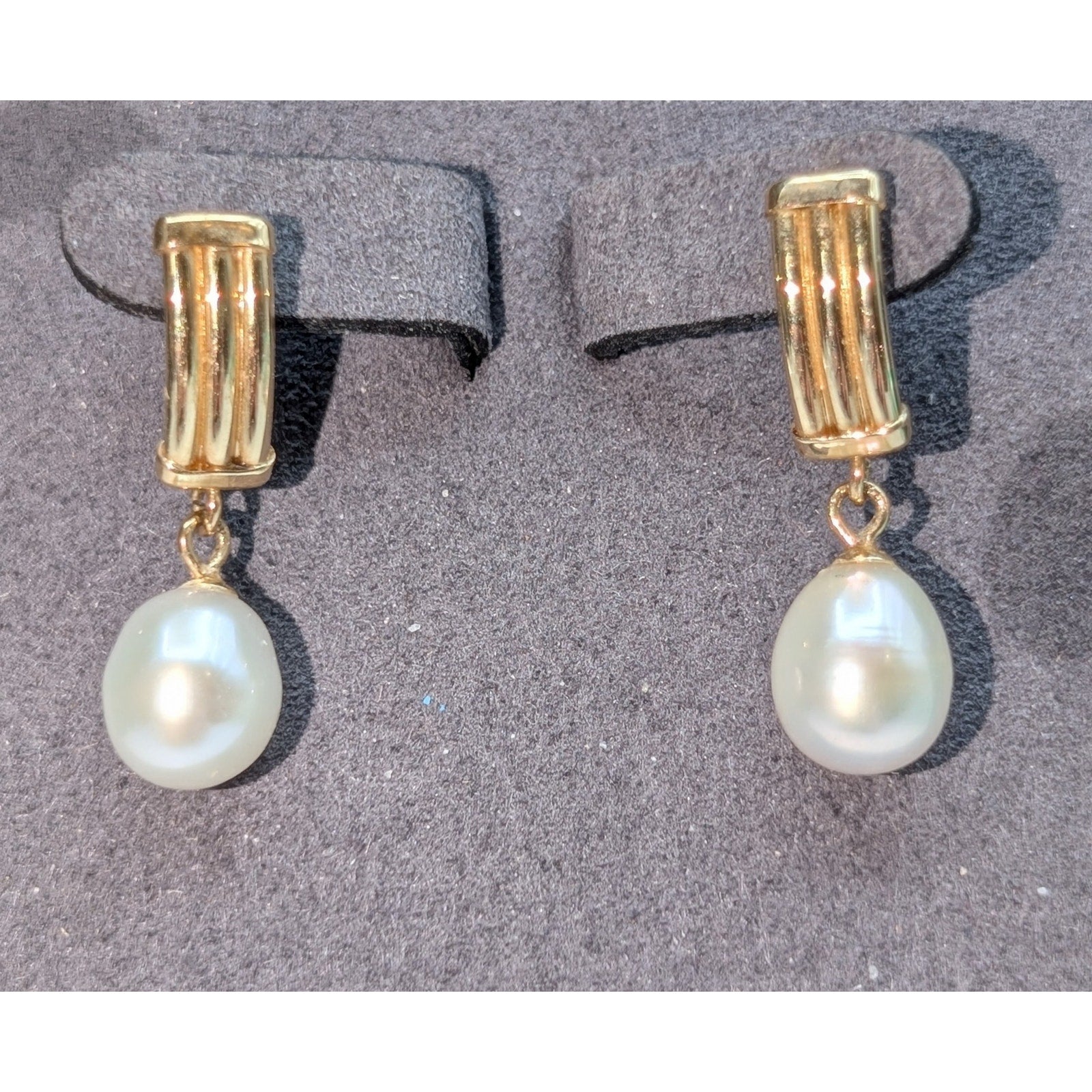 Classic Timeless Marked & Tested 14K Yellow Gold & Pearl Dangle Post Earrings. Pre-owned, these earrings are in excellent condition.