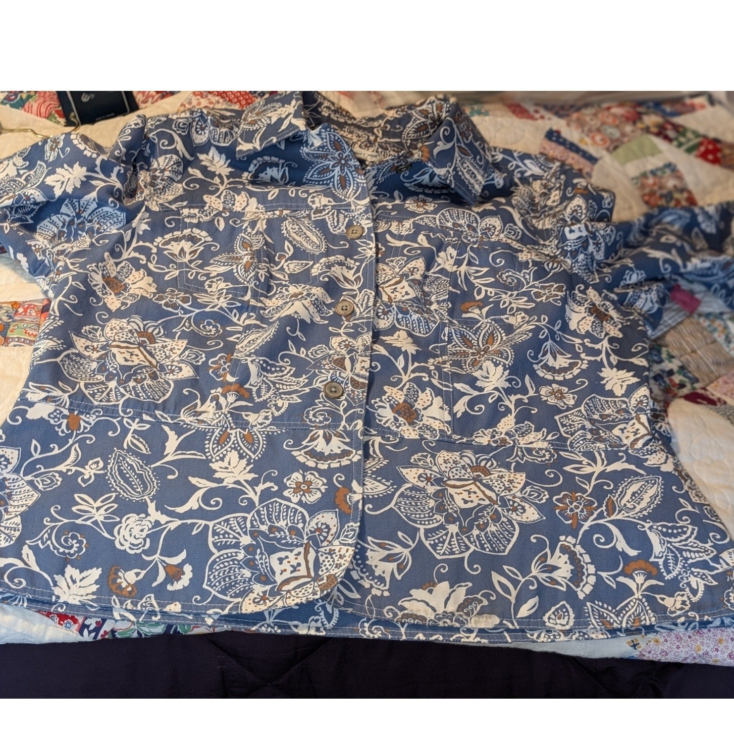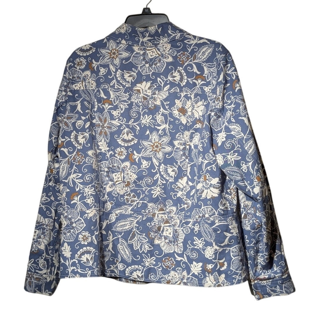 Coldwater Creek Dusty Blue Khaki Cream Floral Button Front Jacket Women's Sz 1X. Pre-owned, this jacket is in excellent condition. Looks like new although I noticed a few spots on it as seen in the 8th & 9th photo that blend right in.