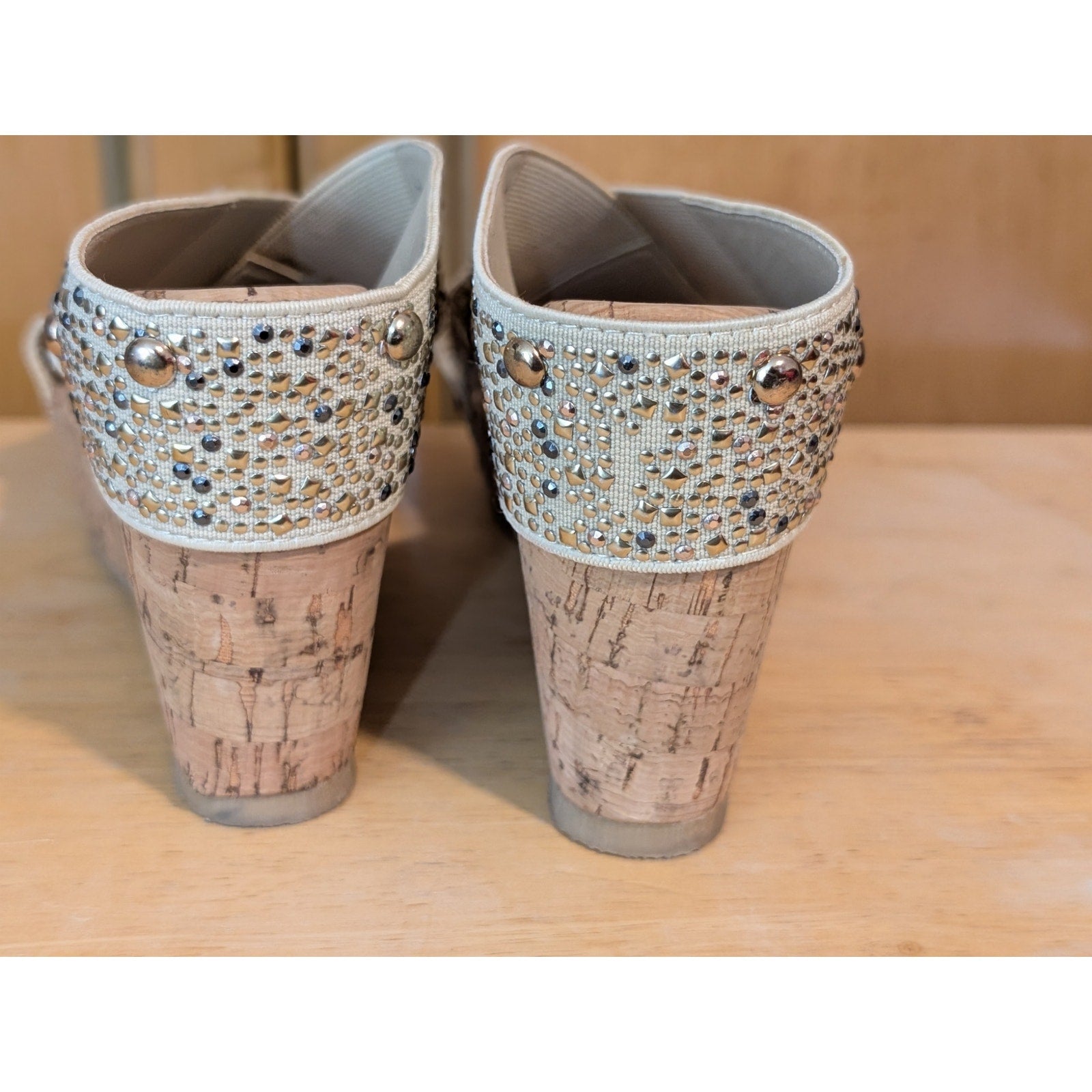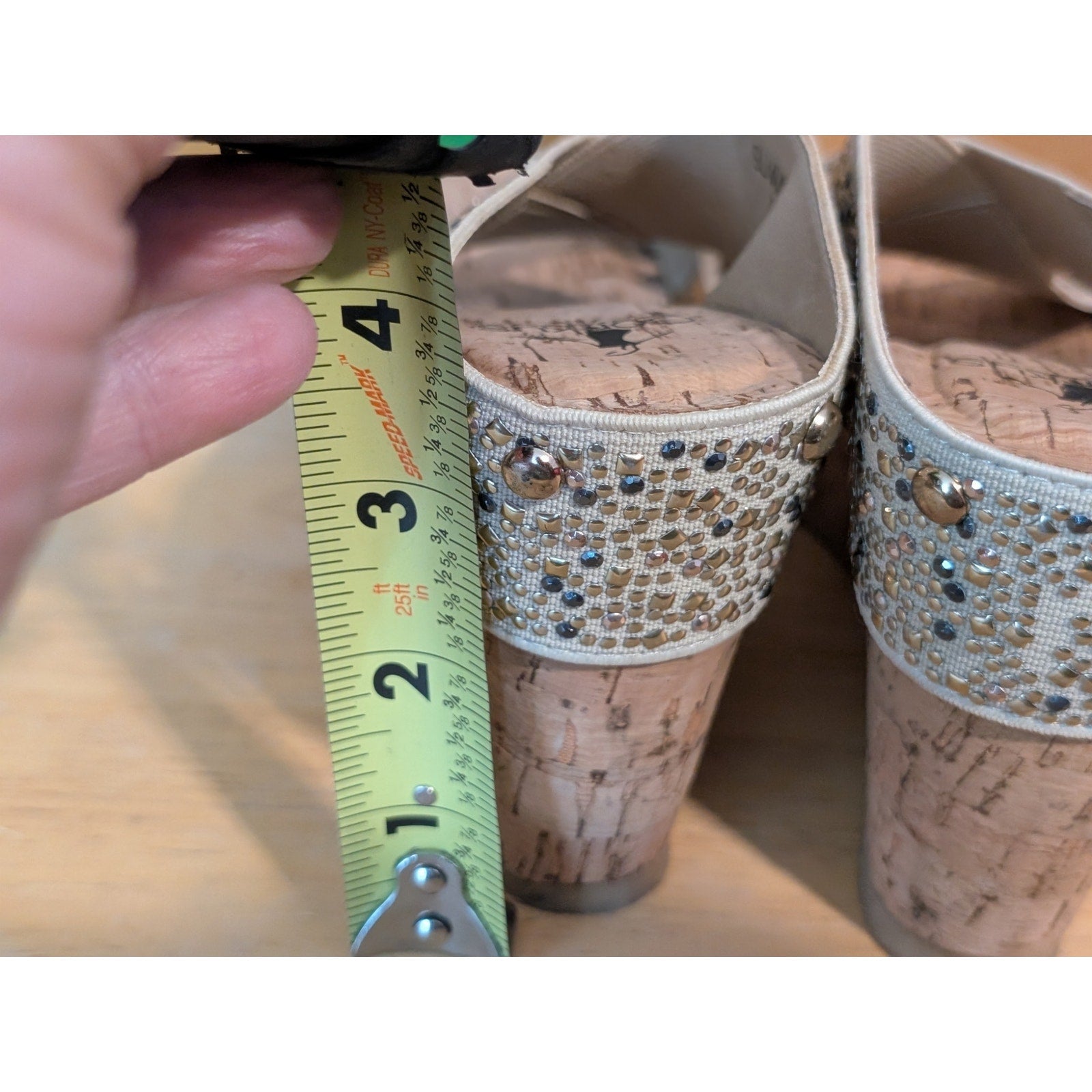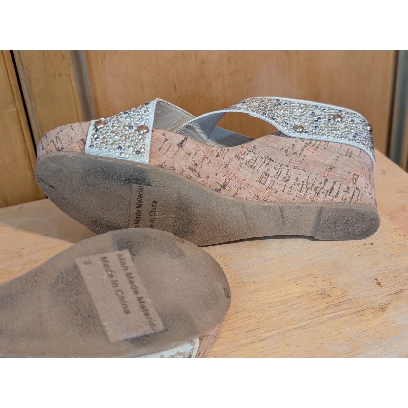 Corkys Summit Metallic Studs Criss Cross Wedge Open Toe Sandals Size 8. Pre-owned, these shoes are in good condition. There are some studs missing and minimal wear, mostly on bottom and a bit in the front toe area.