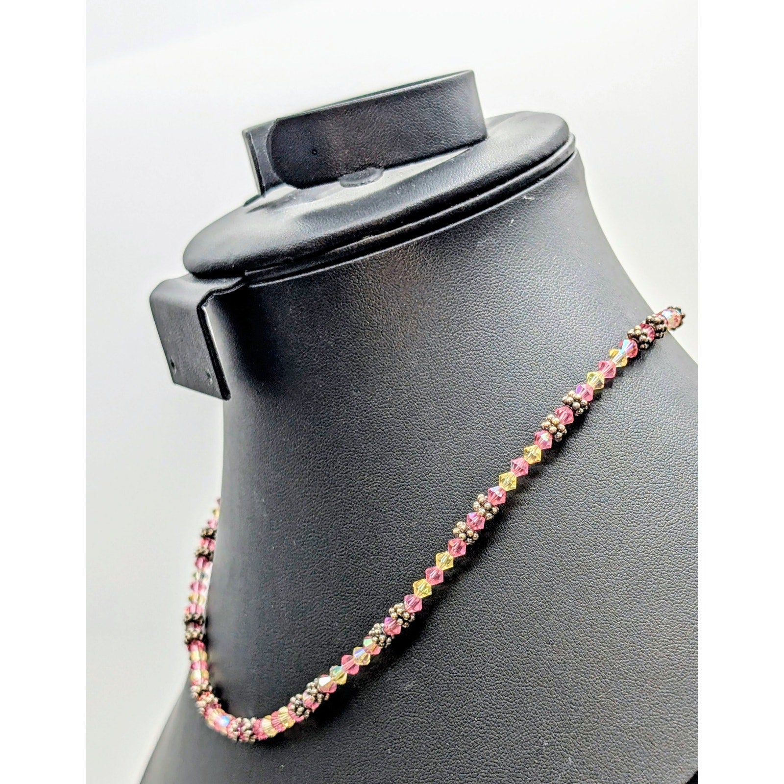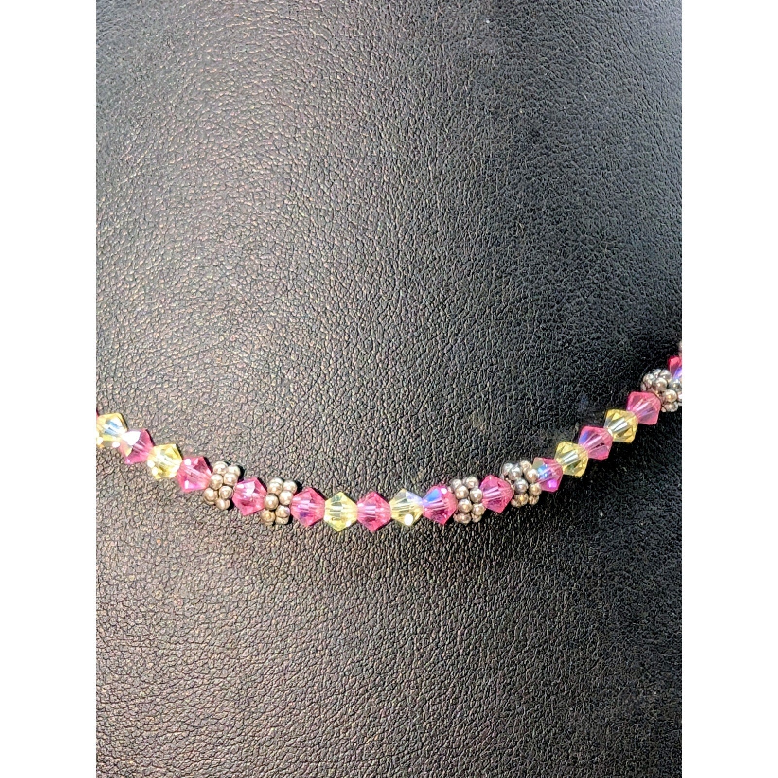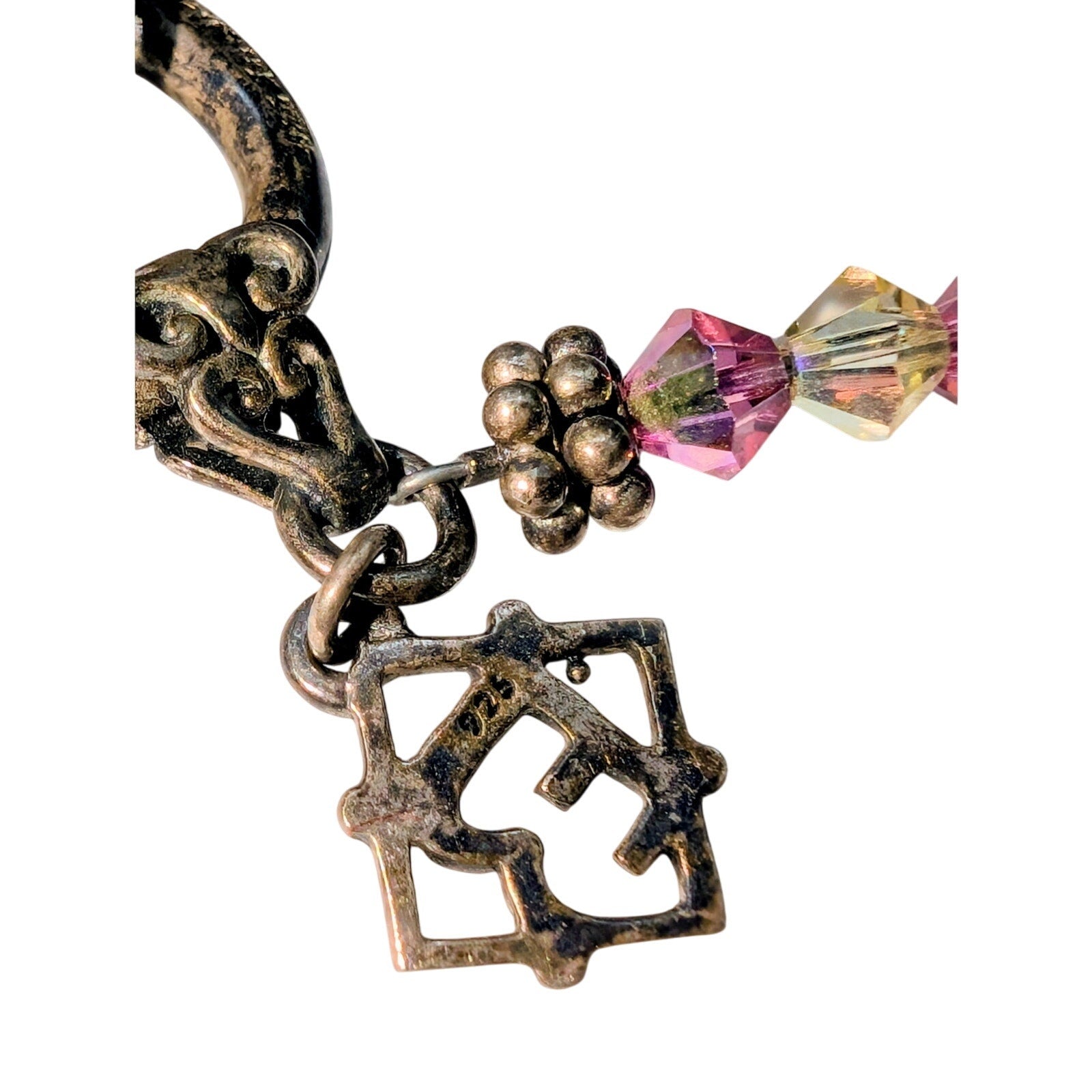 Elise Ryan 925 Sterling Silver Pink Clear/Yellow? Bicone Crystal Bead 18" Toggle Clasp Necklace. Attention to detail. There are genuine garnet cabochons on each end of the toggle clasp. I did not polish the silver. I will let that up to the buyer. Pre-owned, this necklace is in excellent condition.